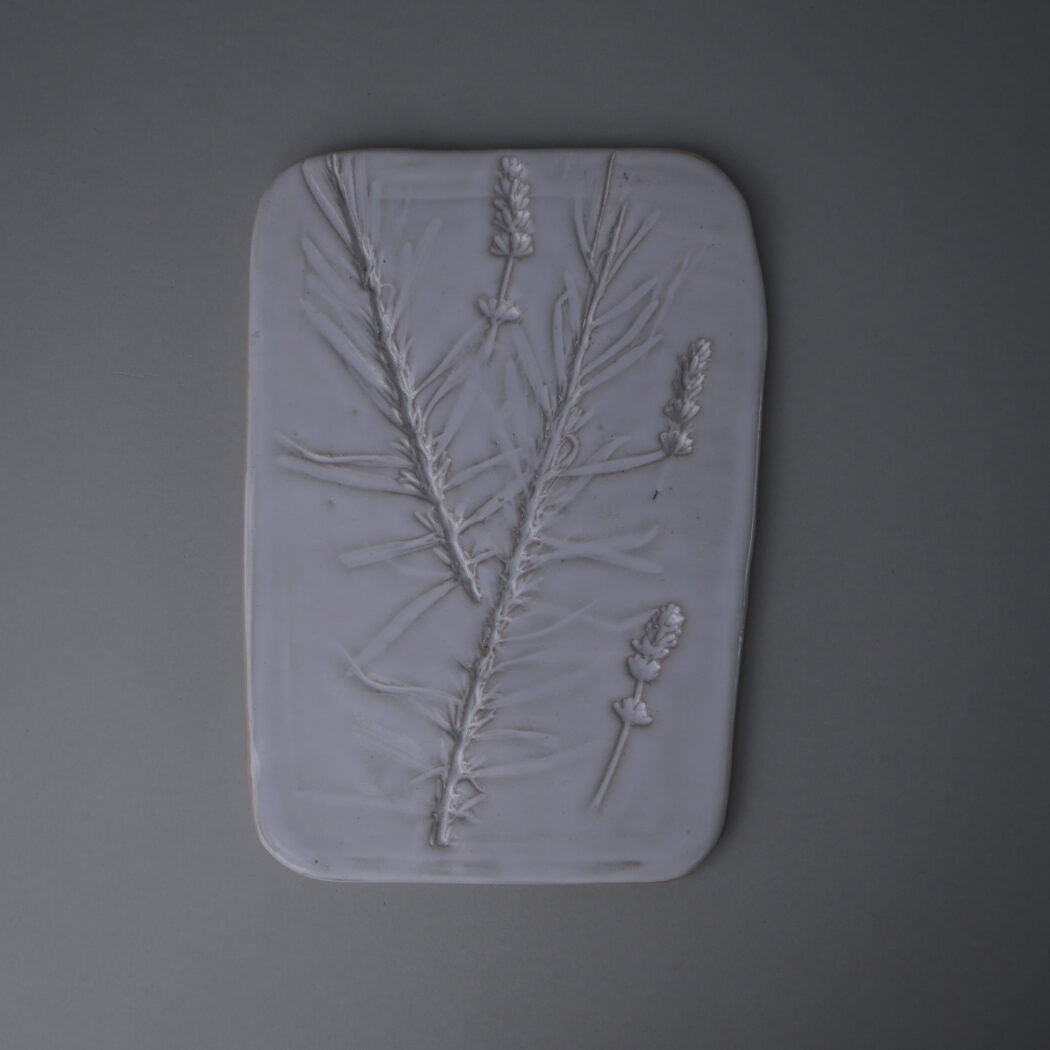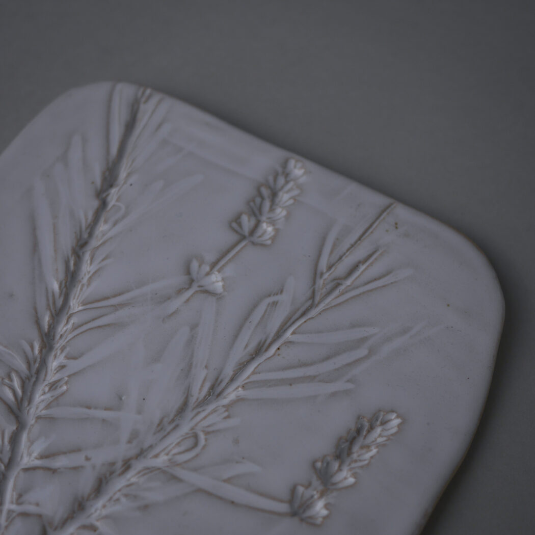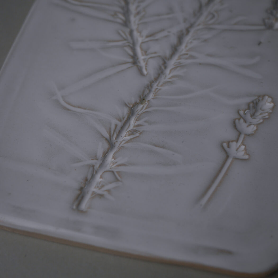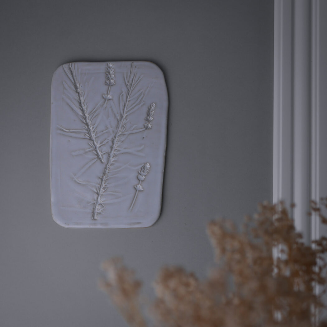 Hvidt relief i keramik med de fineste aftryk af strå. Unika keramik til væggen fundet i Sverige. Vægophæng medfølger.
