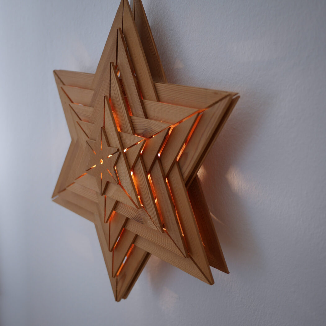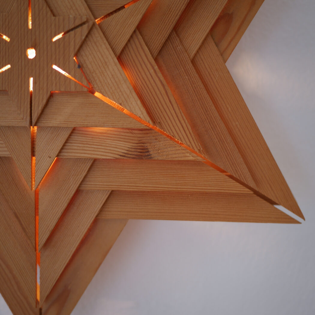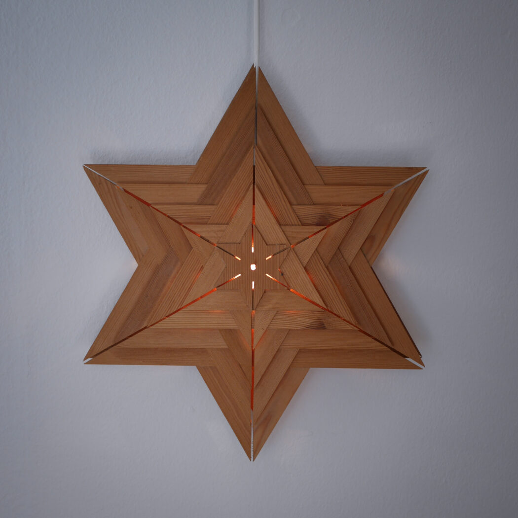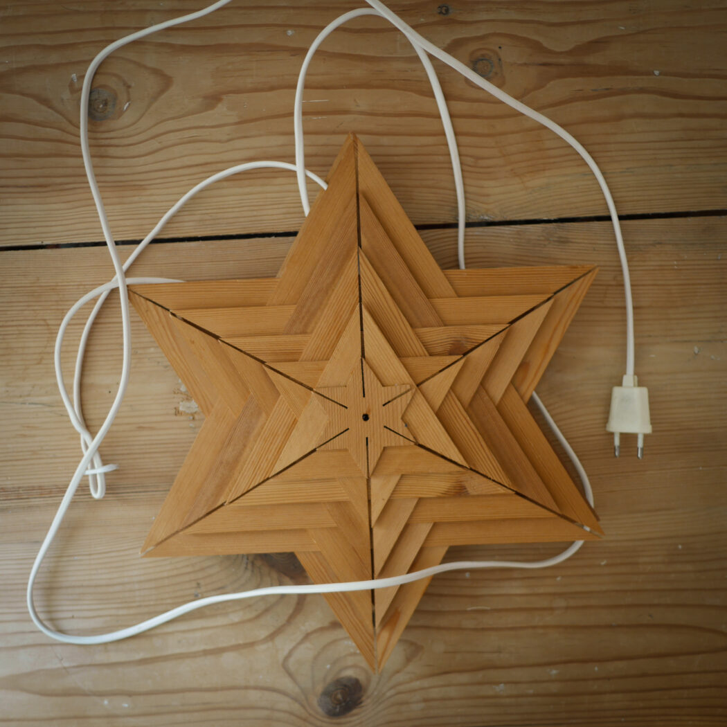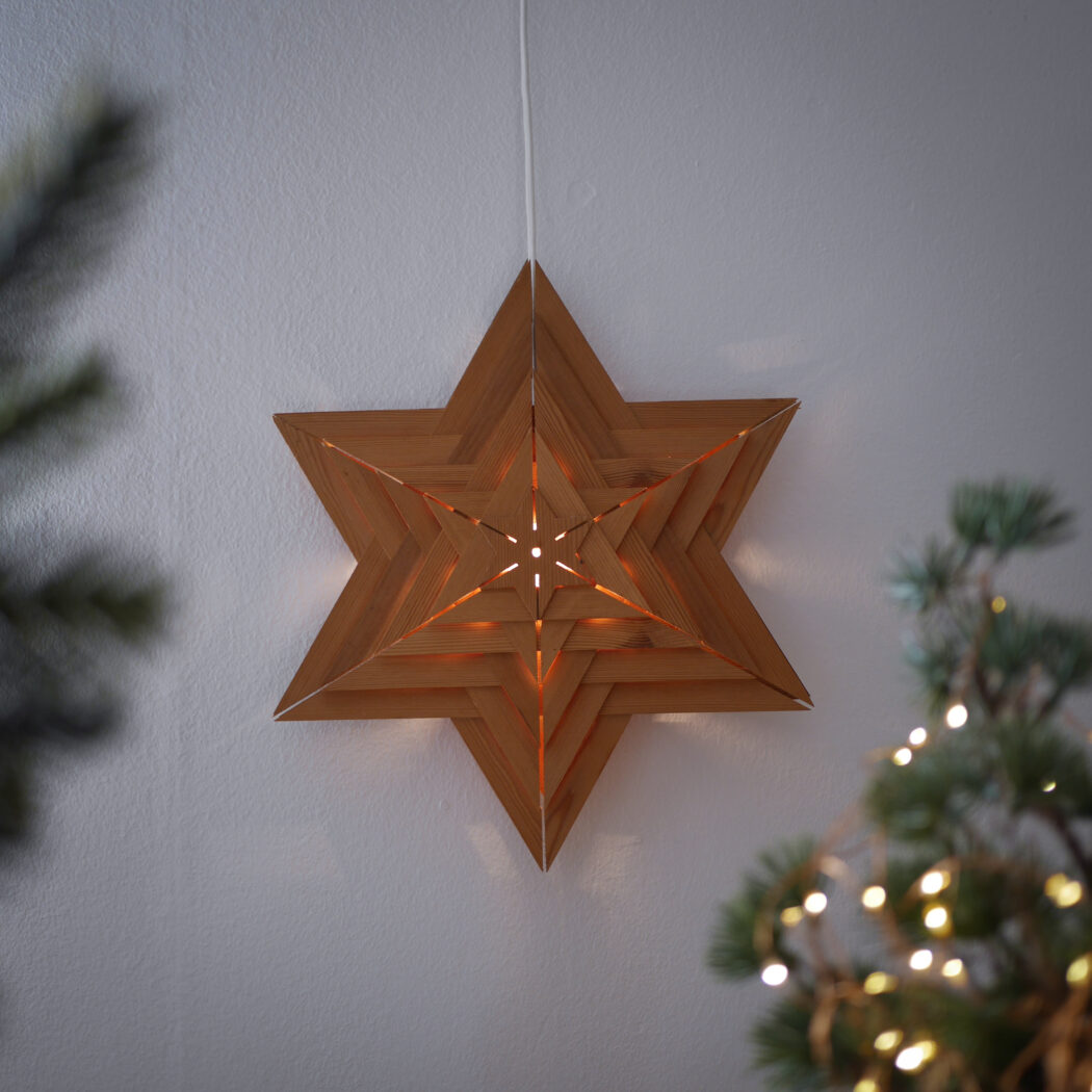 En smuk jule stjerne lampe i træ, som kan sprede julestemning både inde og ude, når den placeres i vinduet ved juletid. Det er en lidt mere enkel og moderne slags julepynt, da træ er moderne i indretningen, men stadig utrolig stemningsfuld. Et fund fra Sverige.