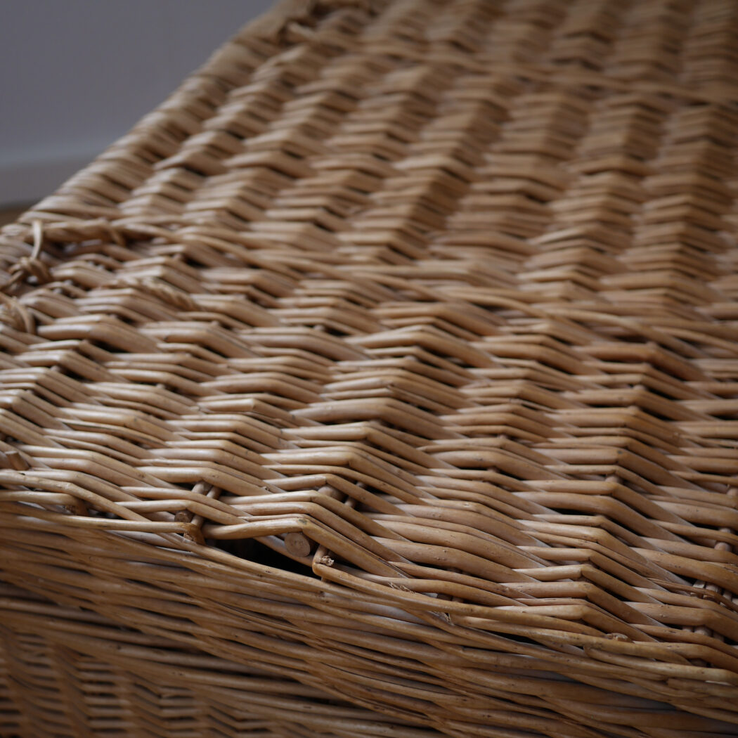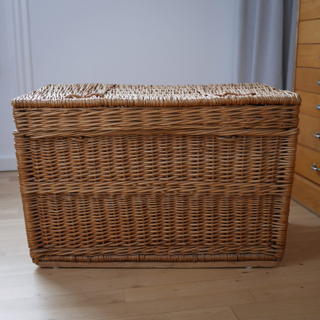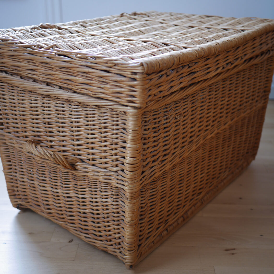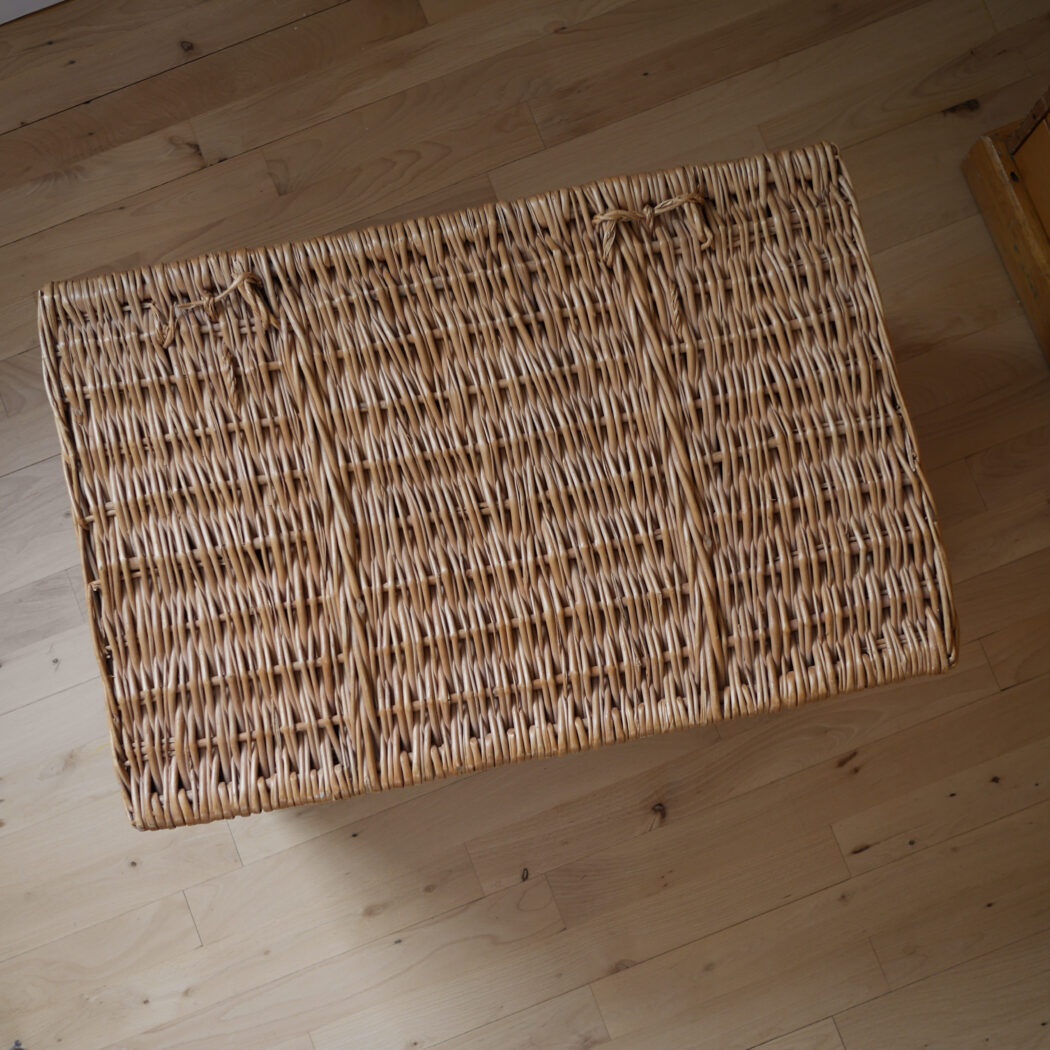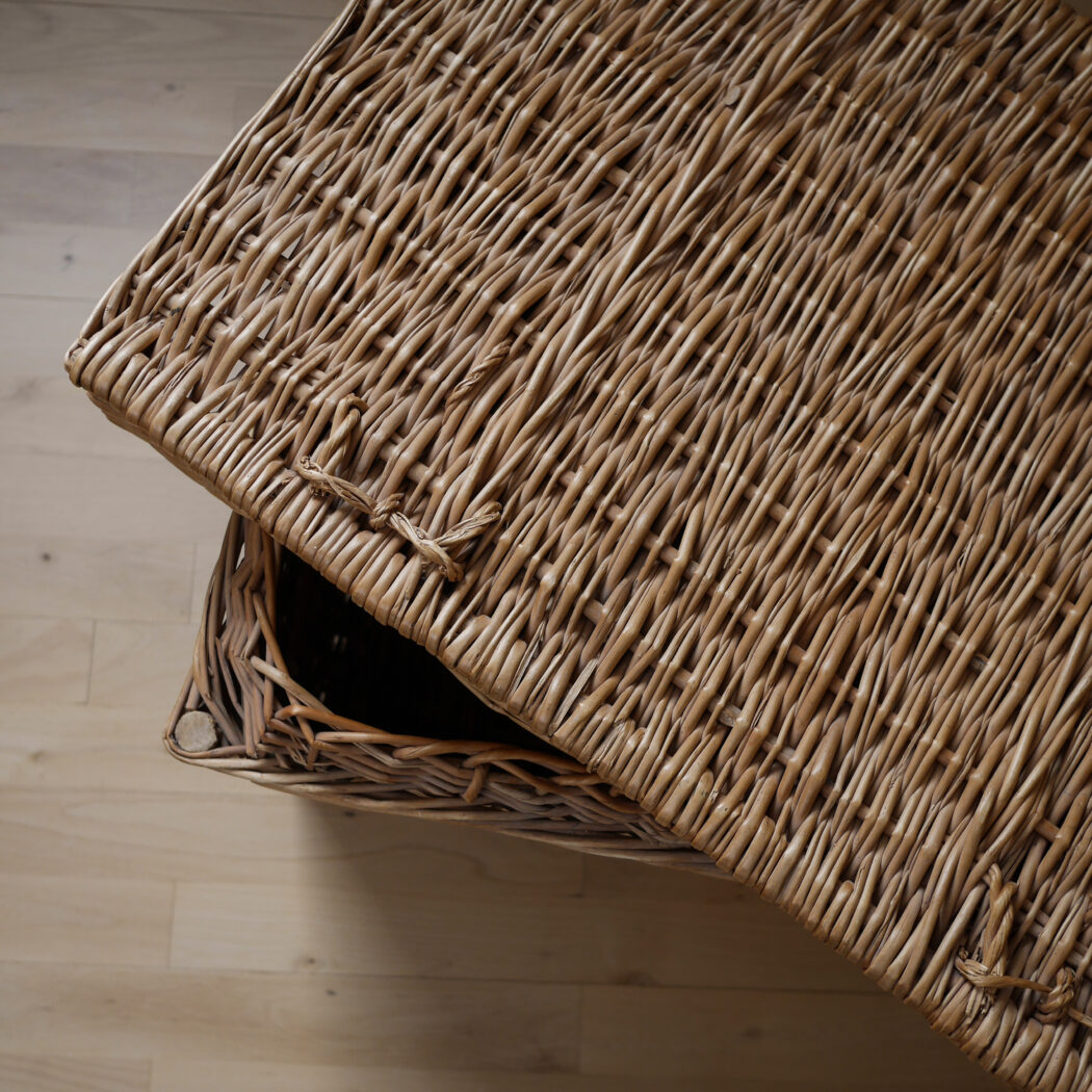 En kæmpe stor flettet pile kurv med låg og hanke i siderne. Køn og dekorativ opbevaring – en stor og rummelig kurv til tæpper, legetøj eller andet. Kurven er fundet i Sverige.