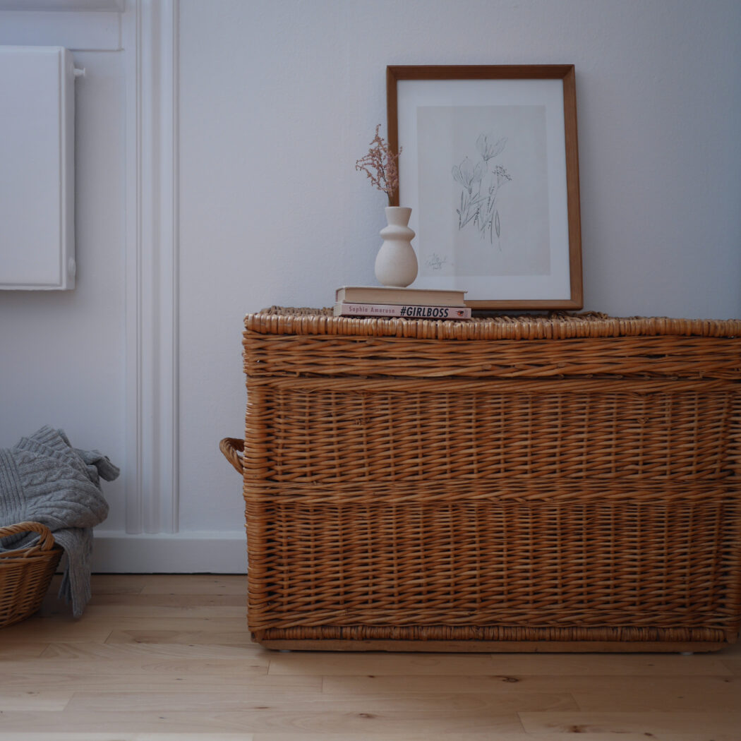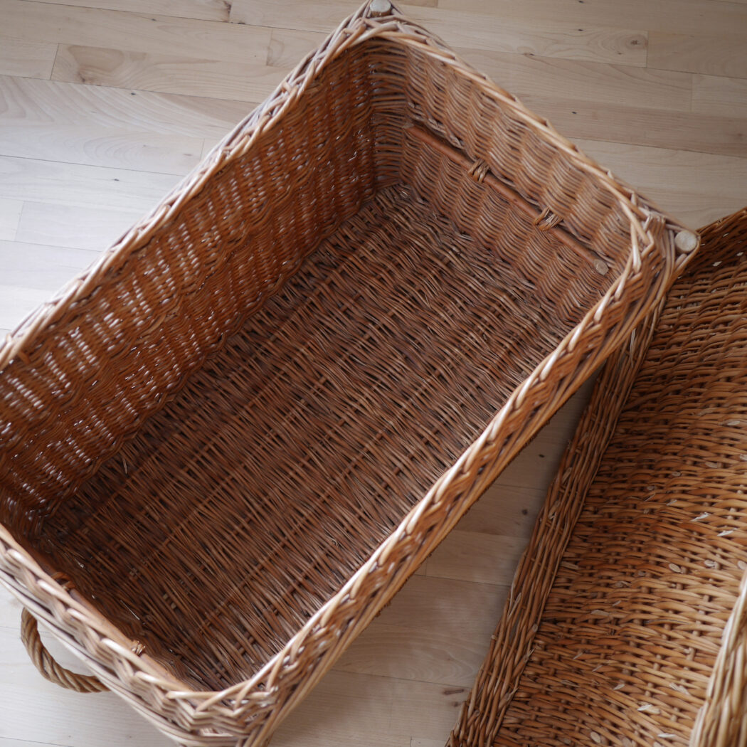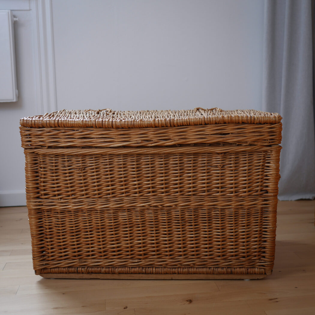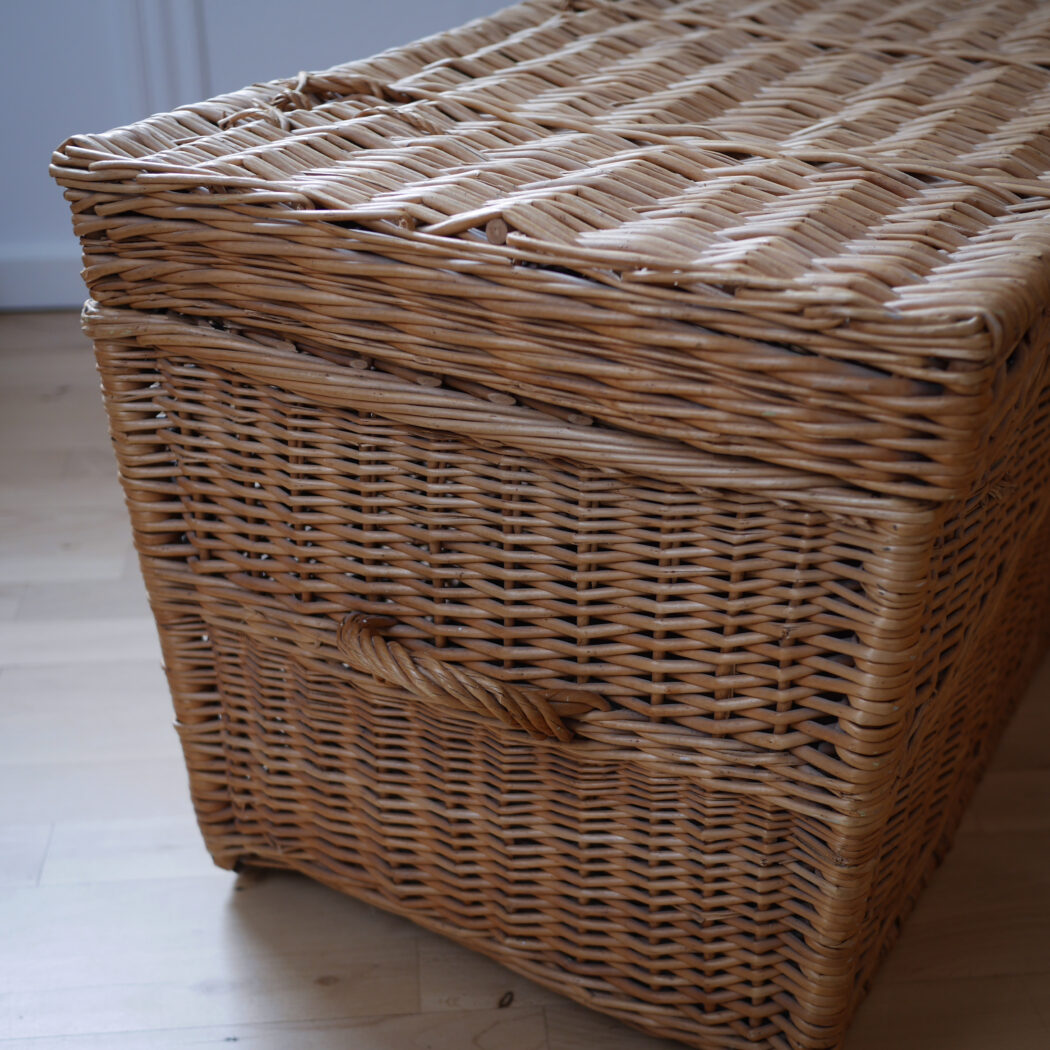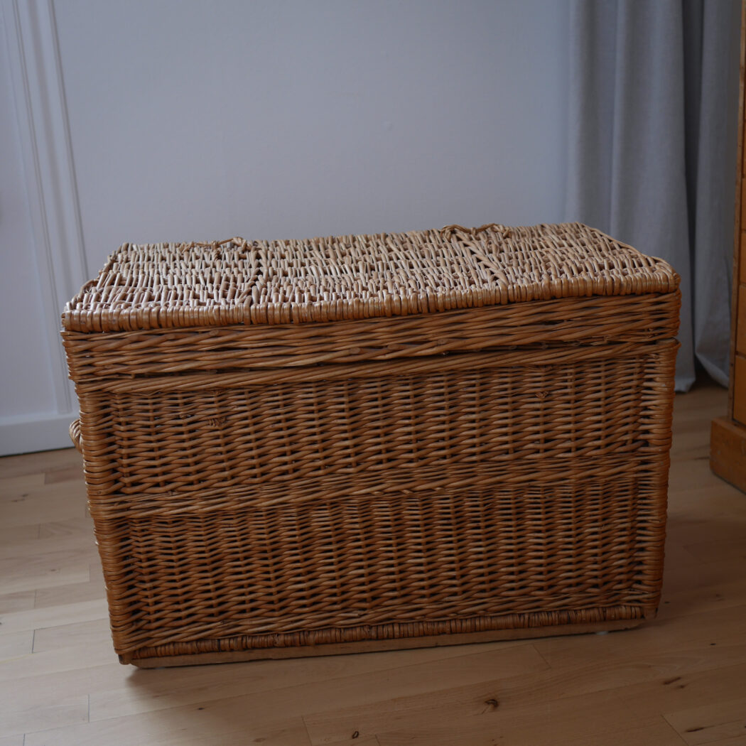 En kæmpe stor flettet pile kurv med låg og hanke i siderne. Køn og dekorativ opbevaring – en stor og rummelig kurv til tæpper, legetøj eller andet. Kurven er fundet i Sverige.
