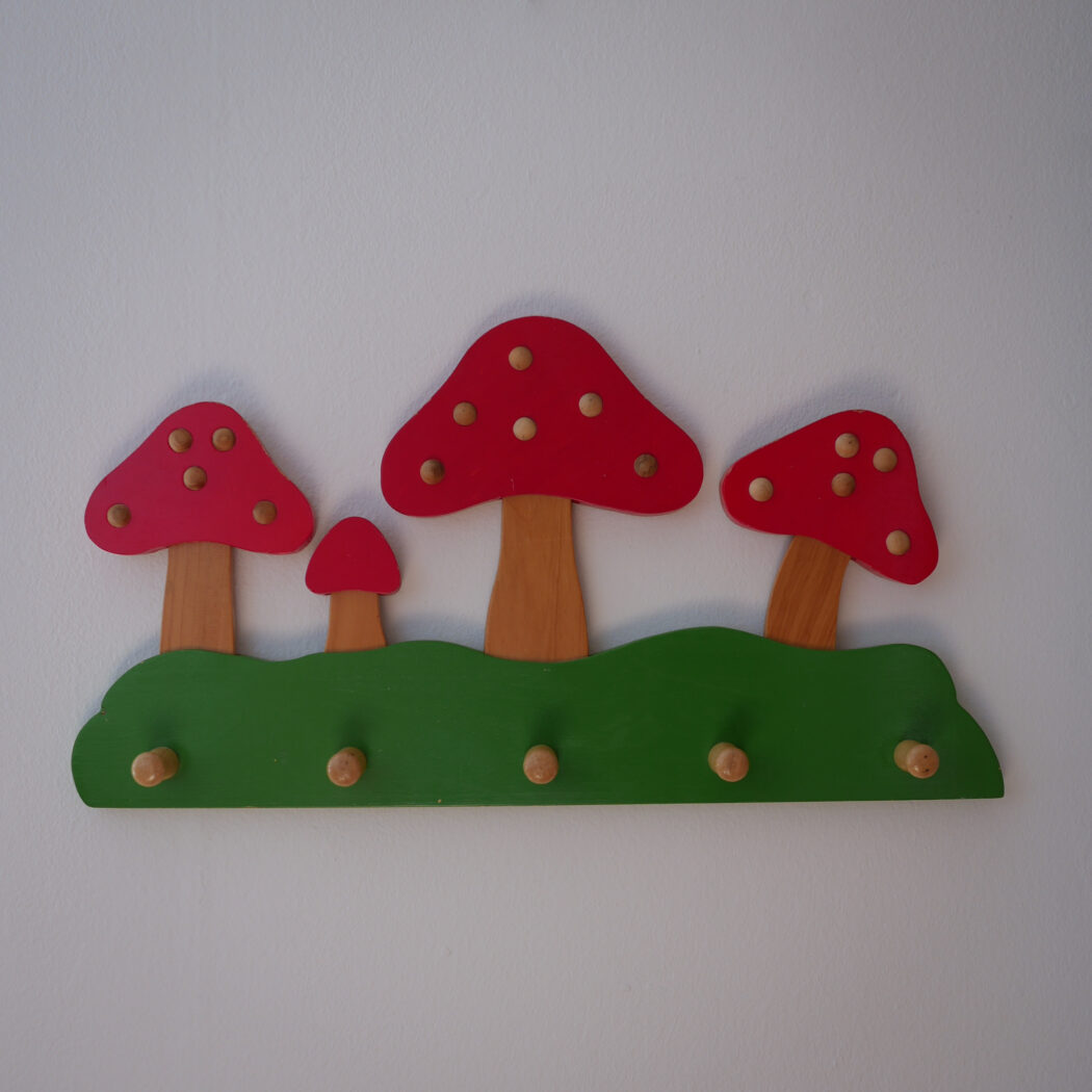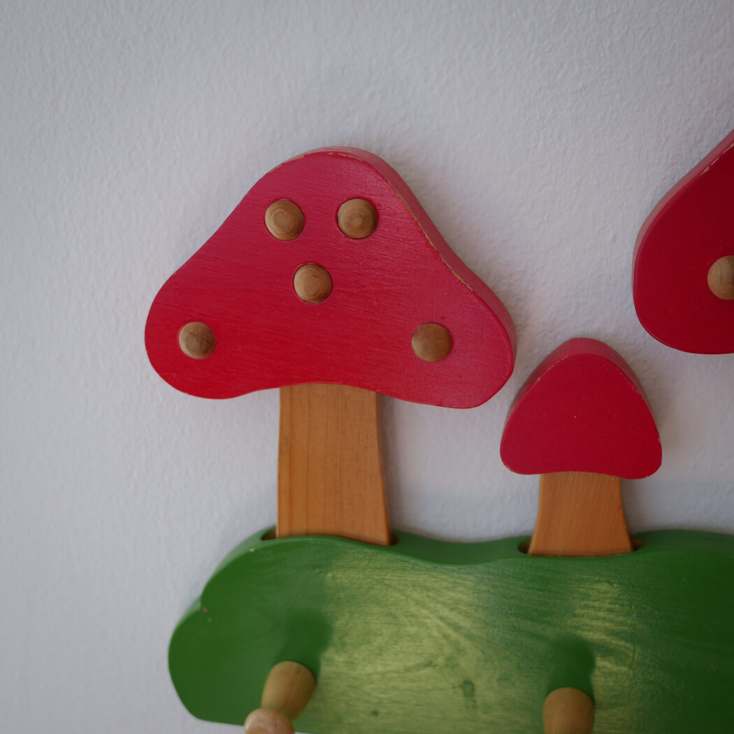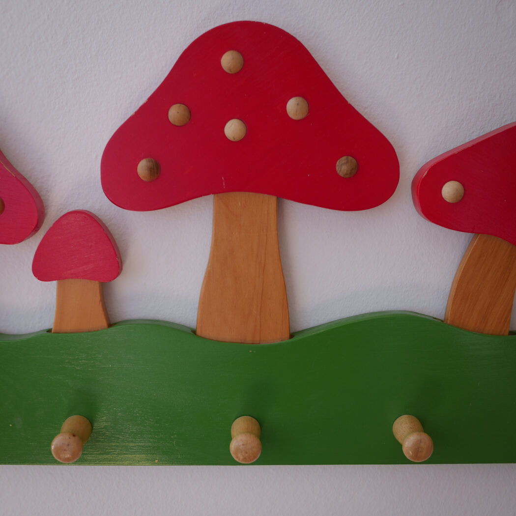 Den skønneste knage til børneværelset med røde svampe. Flotte farver kombineret med enkle lyse trædetaljer. Knagerækken har fem knager til opbevaring af gaderoben eller udklædning. Perfekt til det eventyrlige børneværelsesunivers. Et fund fra Sverige.