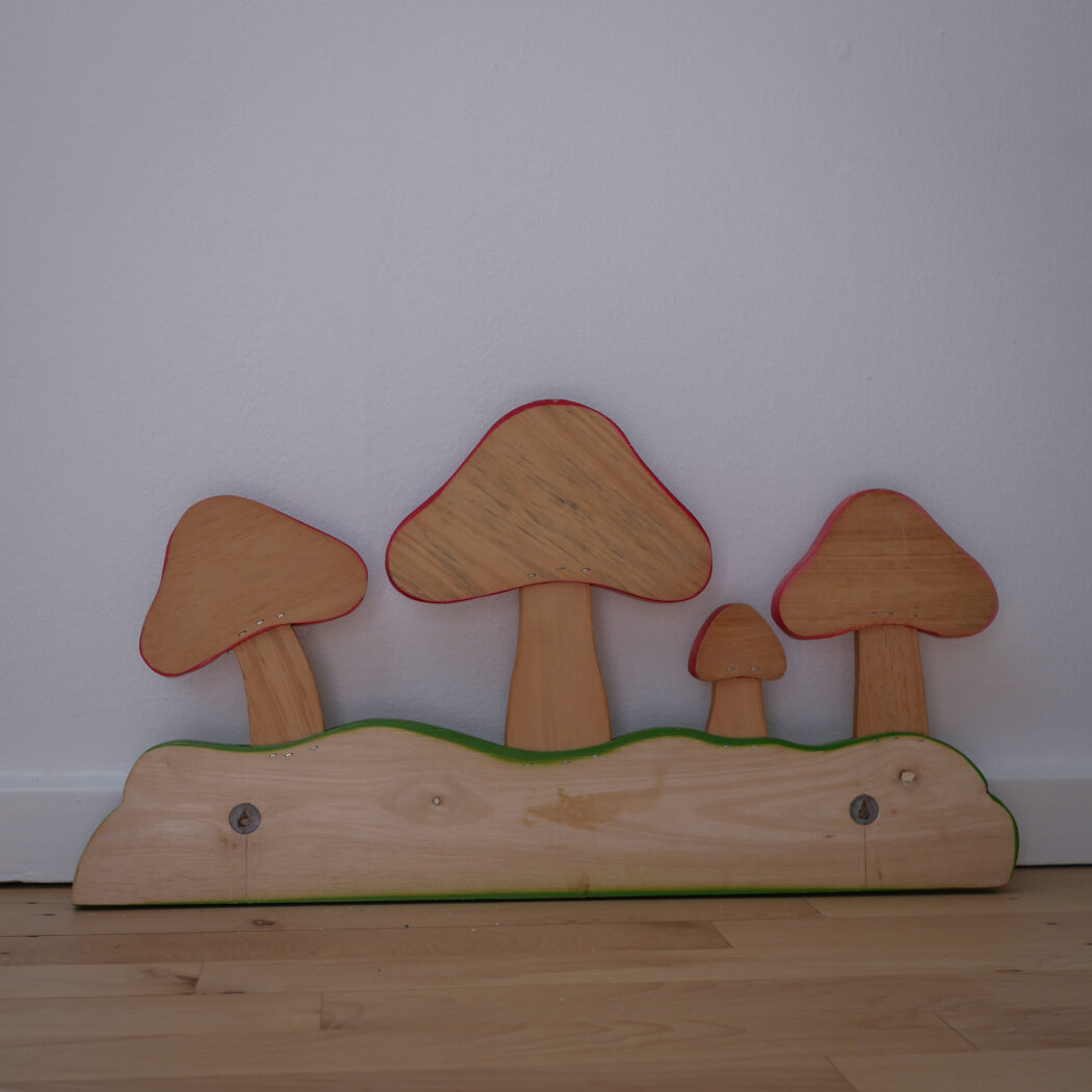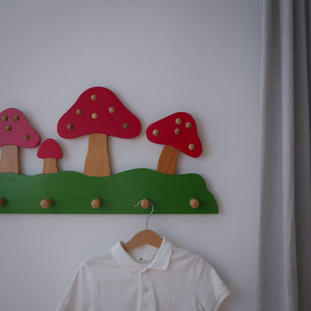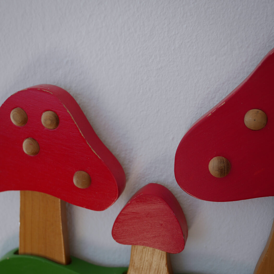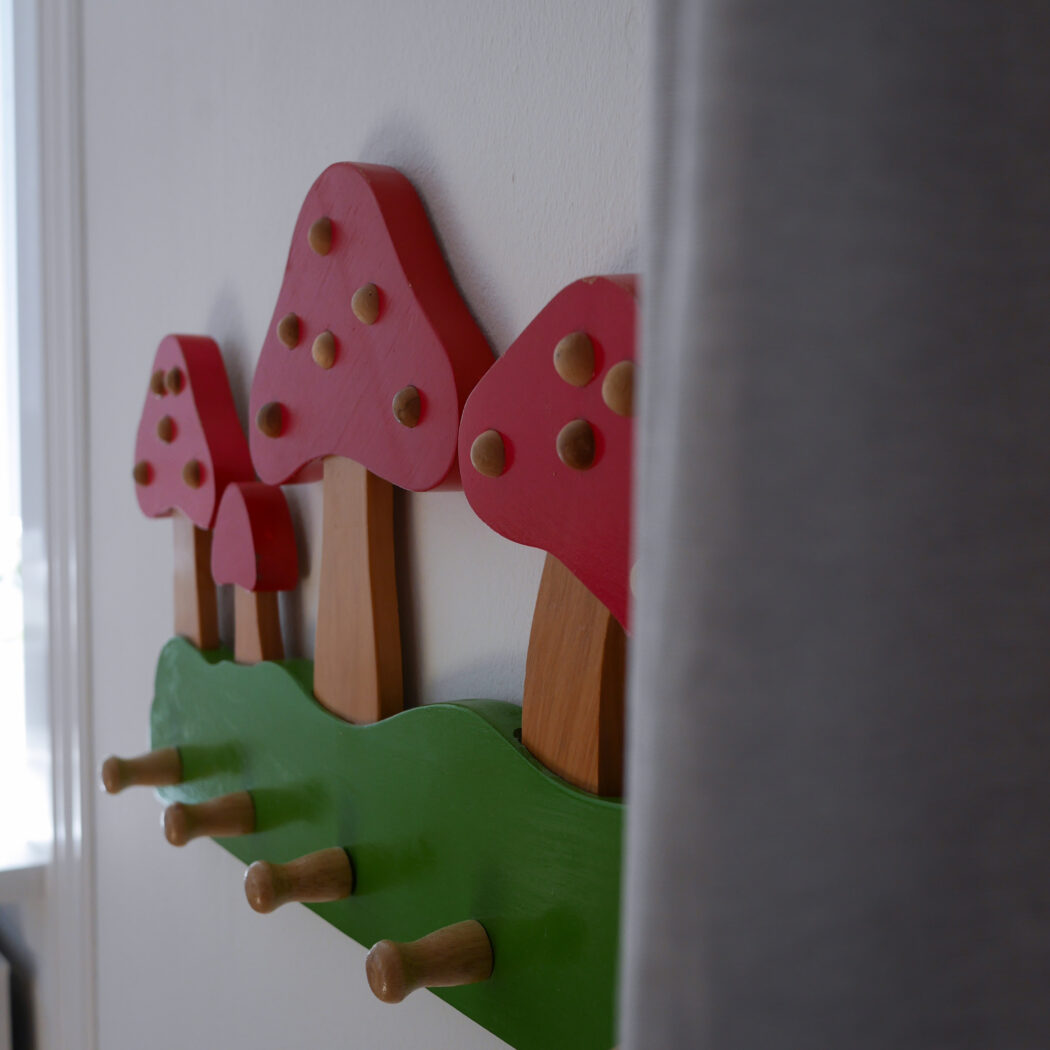 Den skønneste knage til børneværelset med røde svampe. Flotte farver kombineret med enkle lyse trædetaljer. Knagerækken har fem knager til opbevaring af gaderoben eller udklædning. Perfekt til det eventyrlige børneværelsesunivers. Et fund fra Sverige.