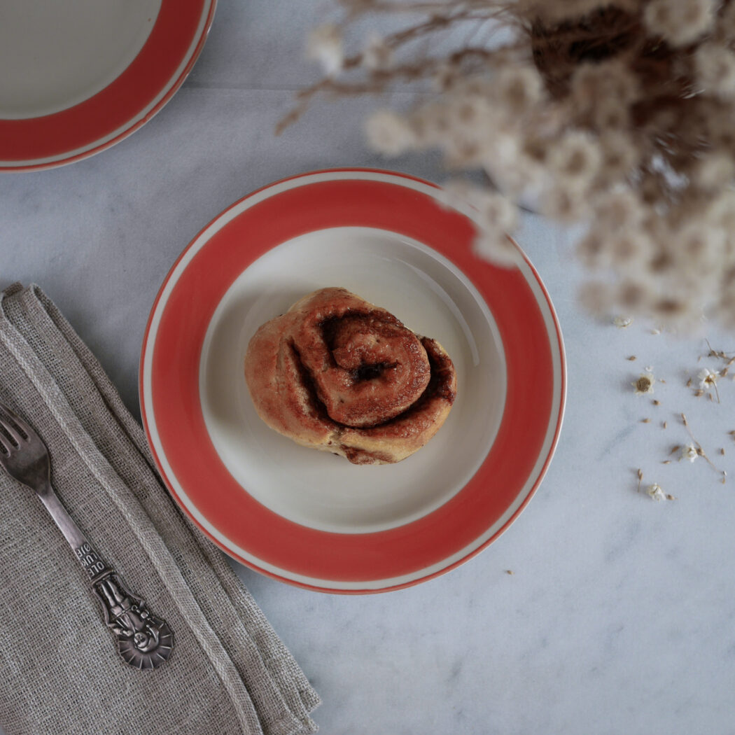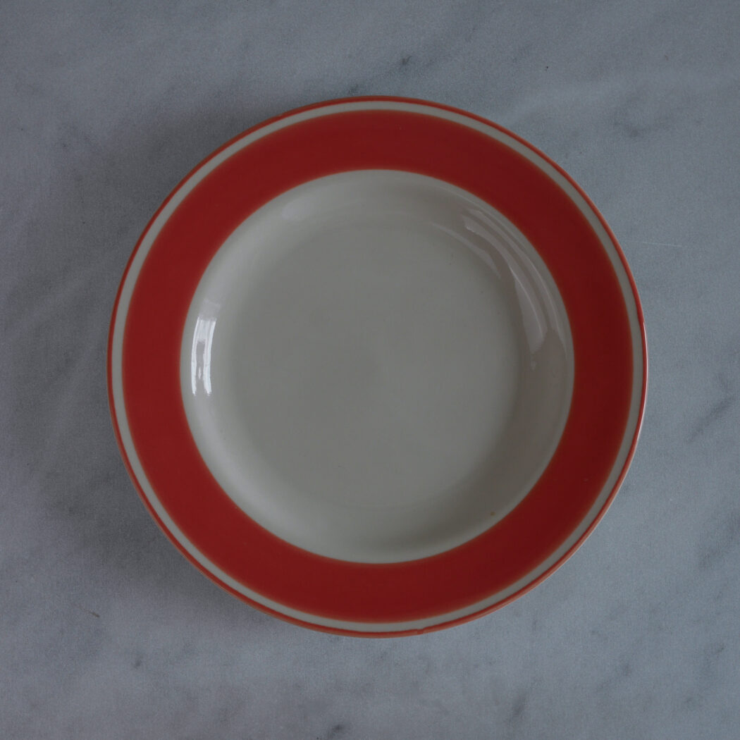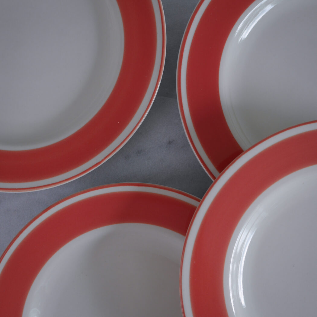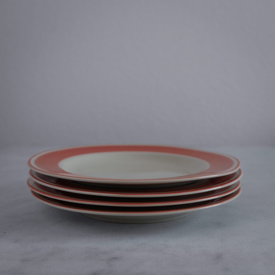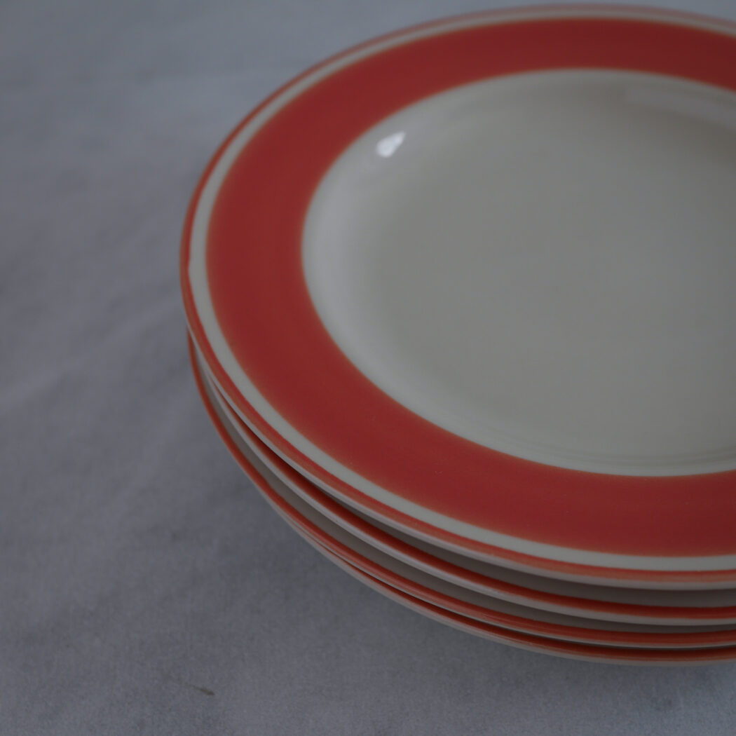 Fine lyse frokosttallerkner med koral farvede kanter. De er indbegrebet af af sommer, og de pynter på middags bordet. 10 stk. fundet i Sverige, de sælges i sæt af 5 stk. Se også de matchende dybe tallerkner på webshoppen.