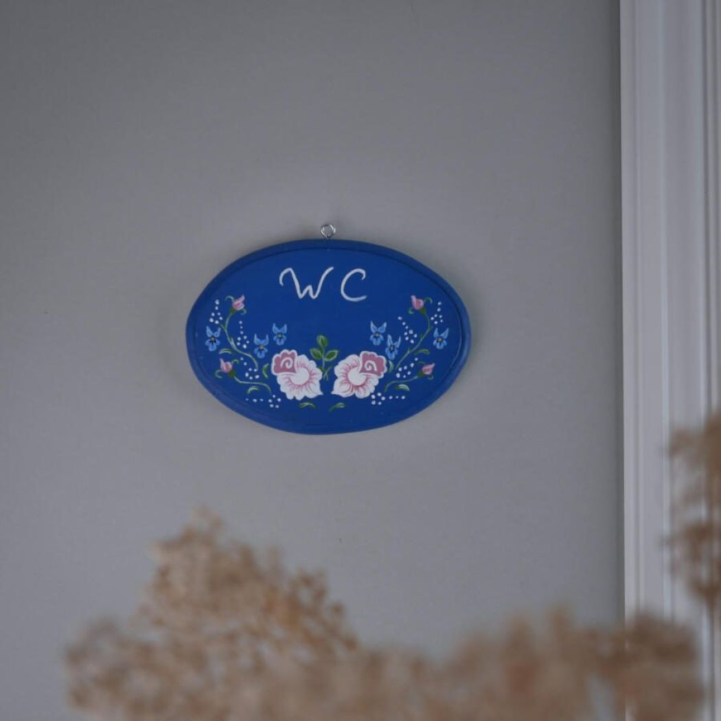 Et sødt lille blåt håndmalet toiletskilt i træ. Giv indretningen personlighed og charme med håndmalede fund, som dette. Et lille træskilt fra Sverige.
