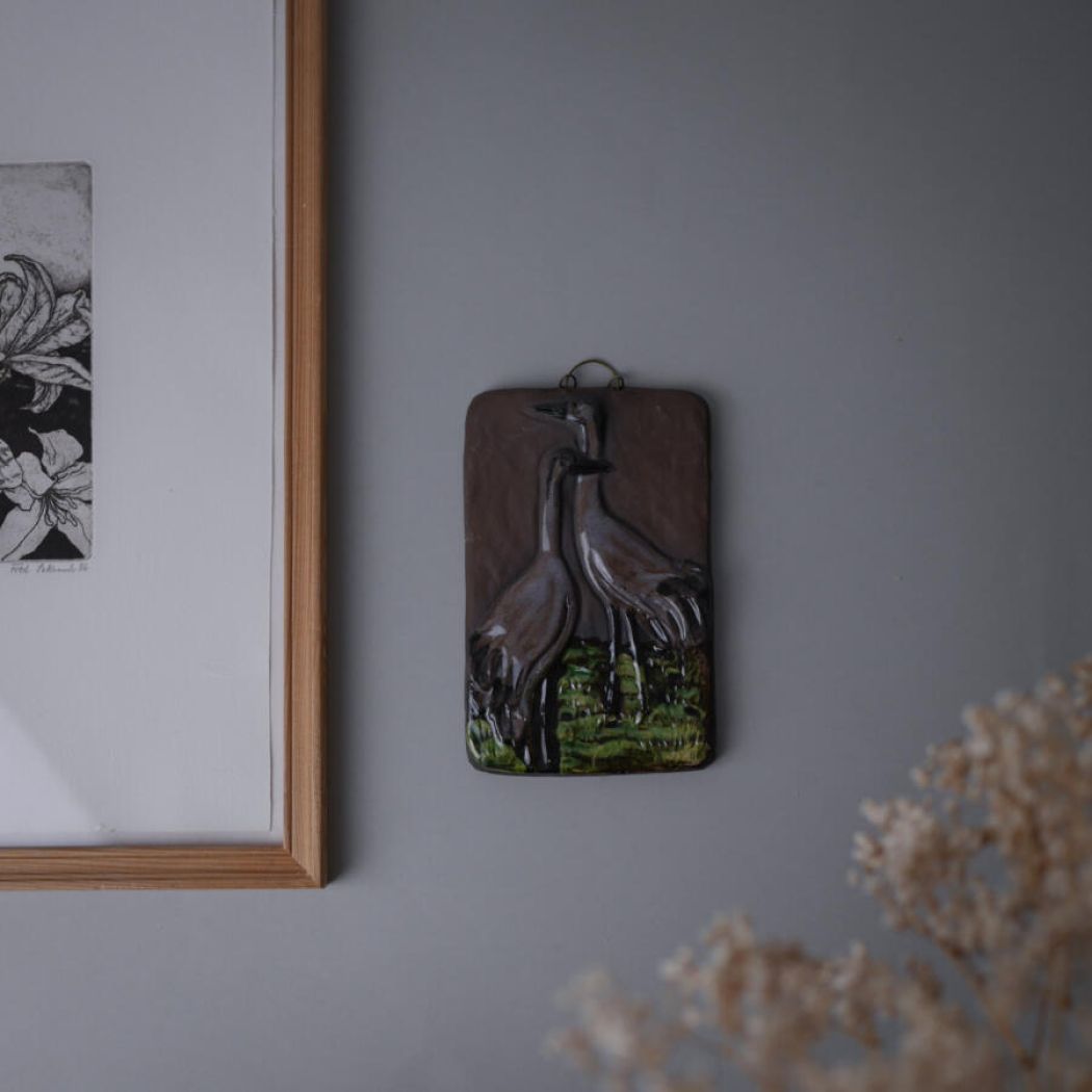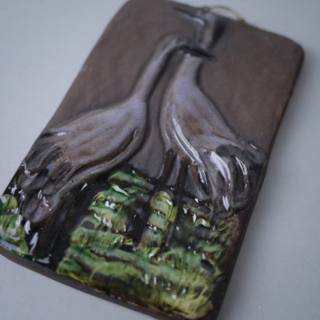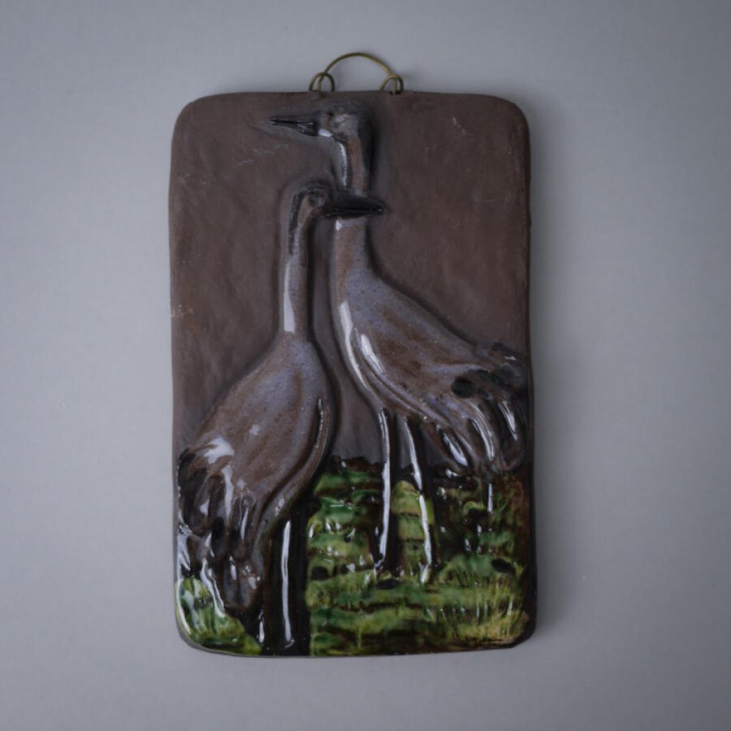 Et lille brunt relief med fugle. Farverne og glasuren er helt utrolig flot, det perfekte lille relief til billedvæggen, et personligt touch. Relieffet er fundet i Sverige.