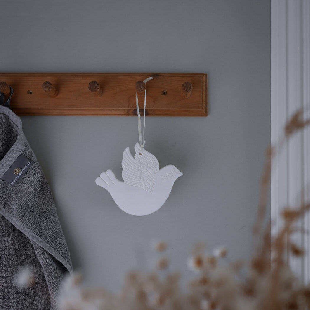 En fin lille hvid gips due til ophæng – lad den være en sød underspillet detalje på en knage eller et skabsgreb, det giver personlighed til indretningen. Duen er fundet i Sverige.