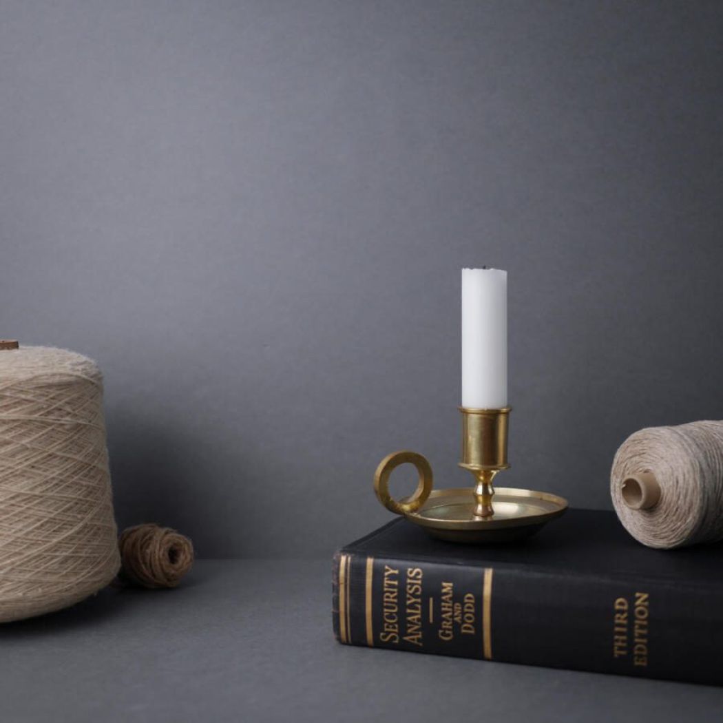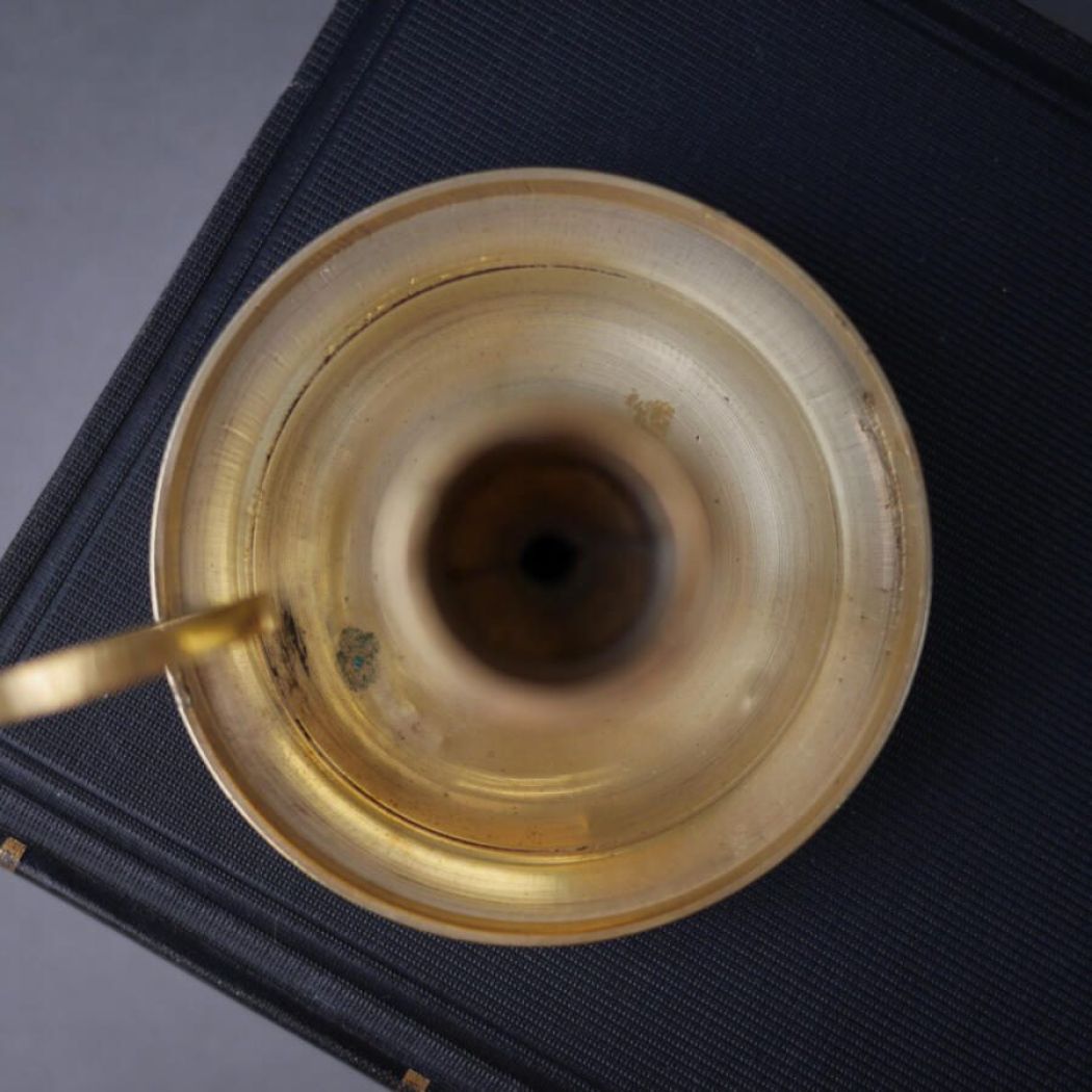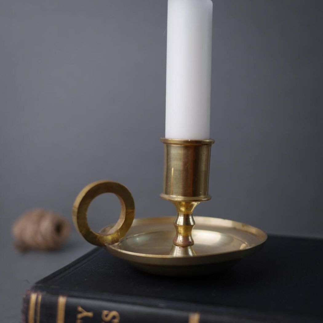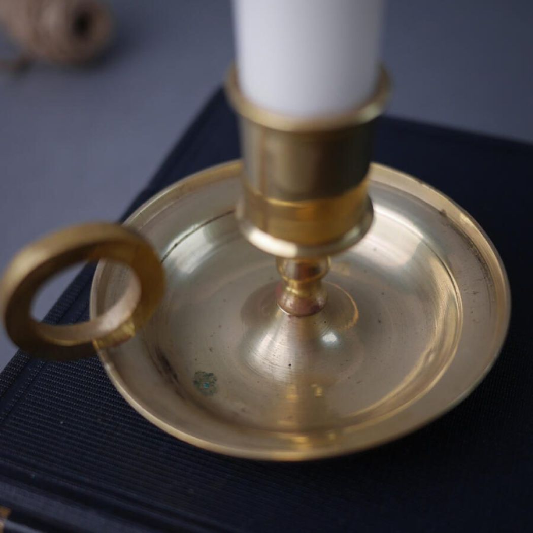 En fin lille kammerstage i messing, som skaber hygge og steming i stuen. Stagen passer til et kronelys. Messingstagen er fundet på Fyn.
