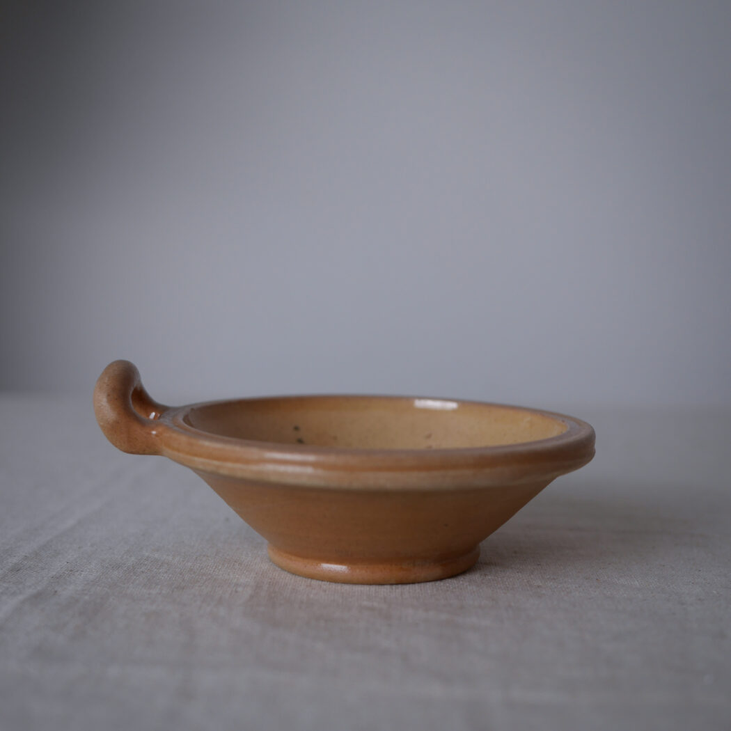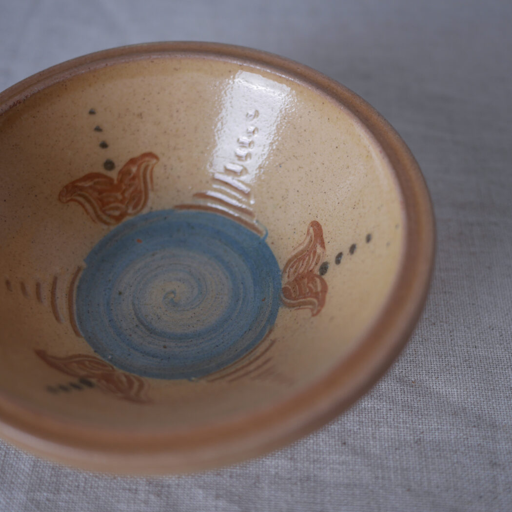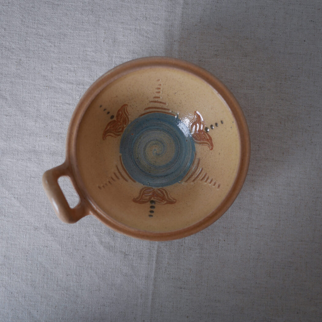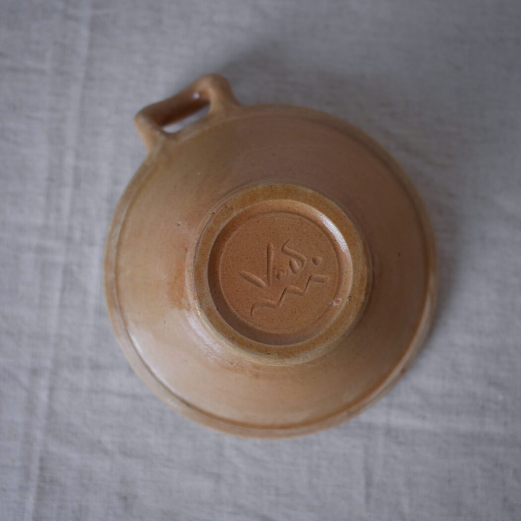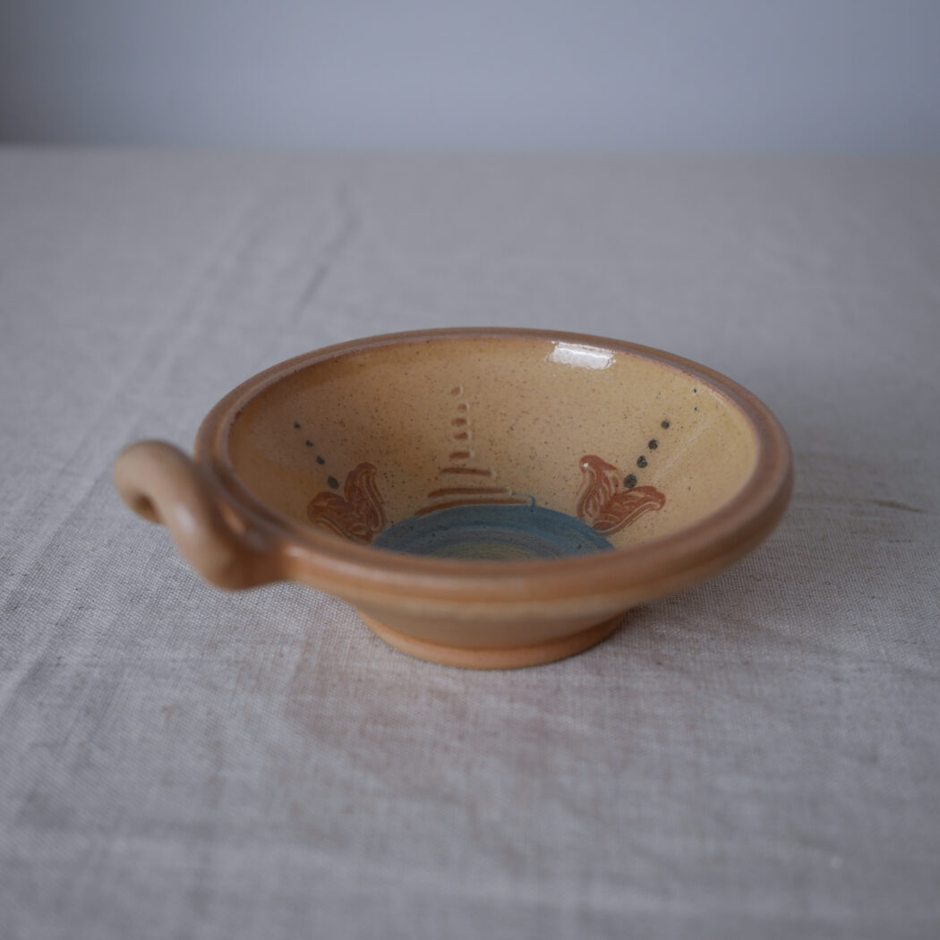 En virkelig fin lille pynteskål i keramik – smuk farve og dekorationer, og ekstra charmerende med den ene lille hank. En skål til nips på hylden eller krydderier i køkkenet. Skålen er fundet i Sverige.
