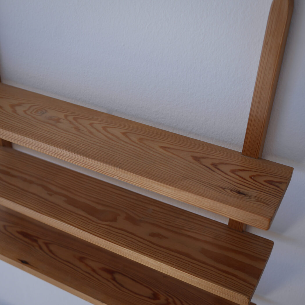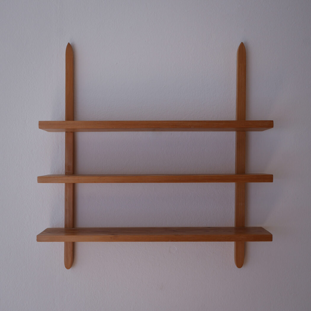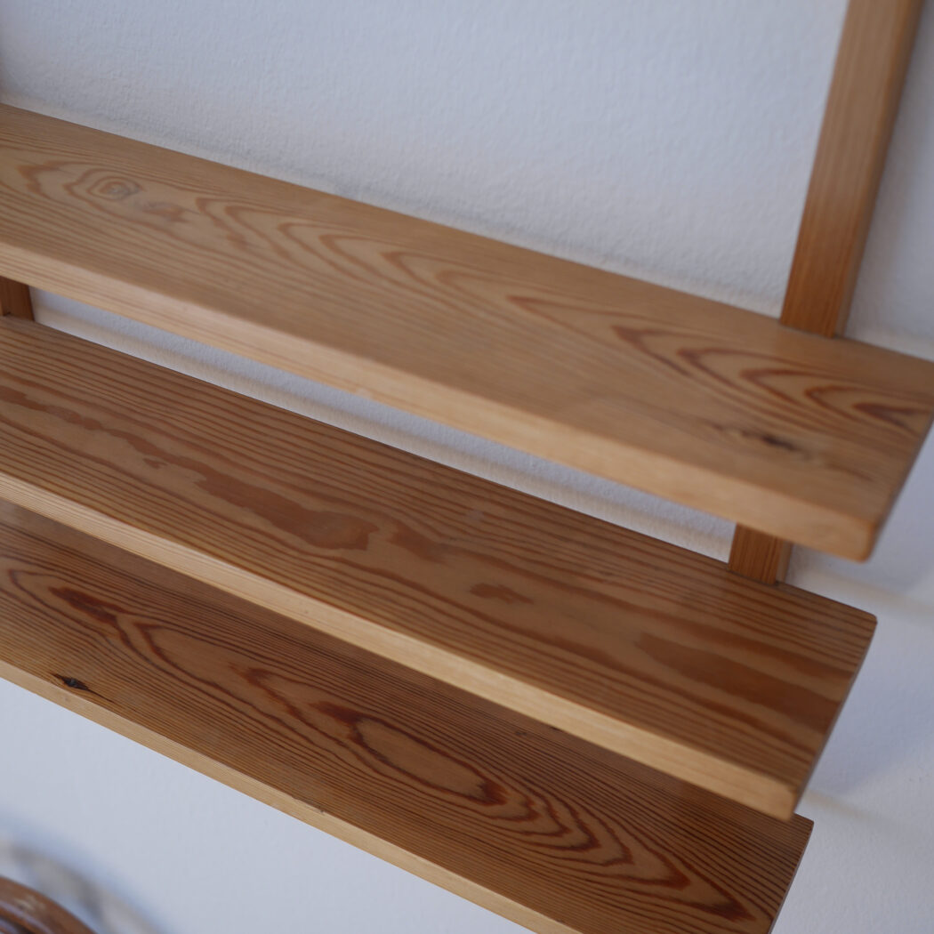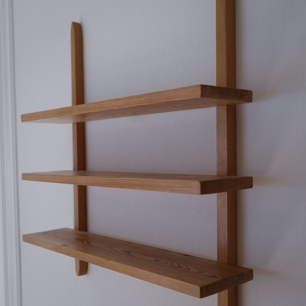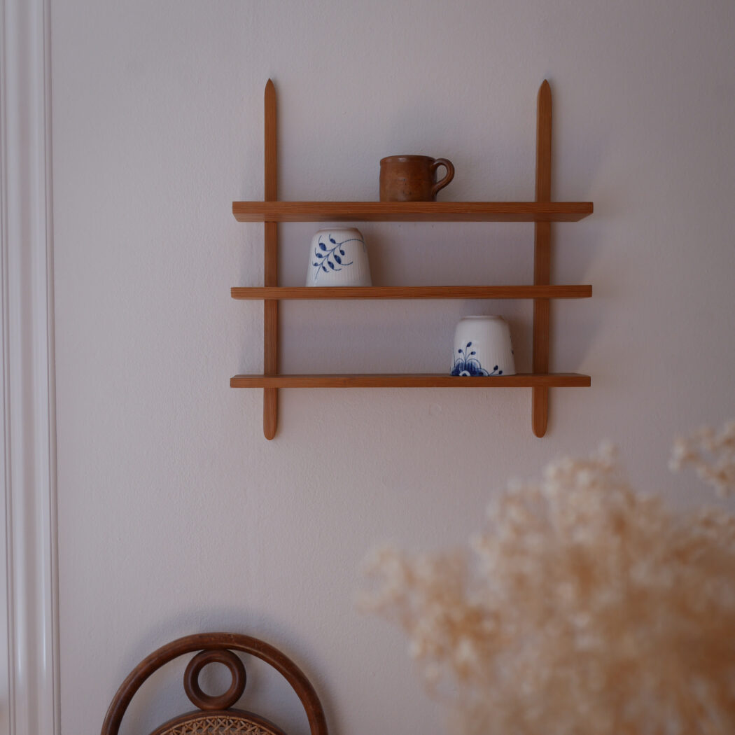 En utrolig flot og enkel vægreol med tre hylder – så smuk på væggen især fordi de lodrette trælister går længere op foroven, det giver et elegant udtryk. Perfekt til krus og kopper eller anden let opbevaring. Et fund fra Sverige.