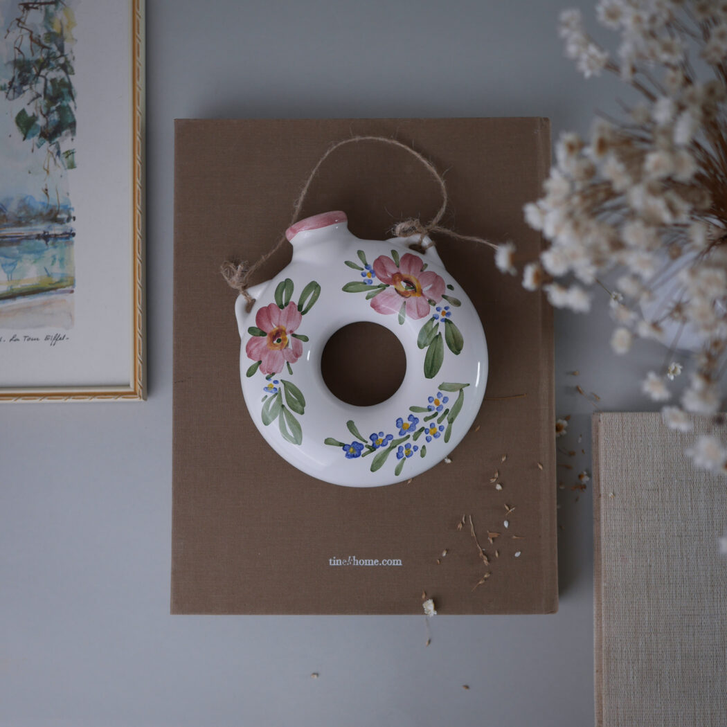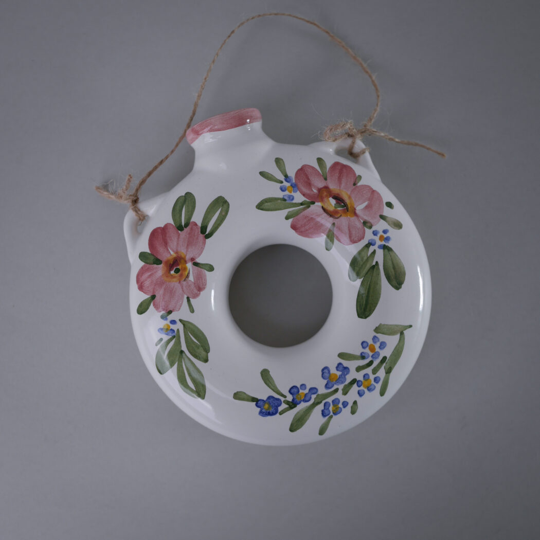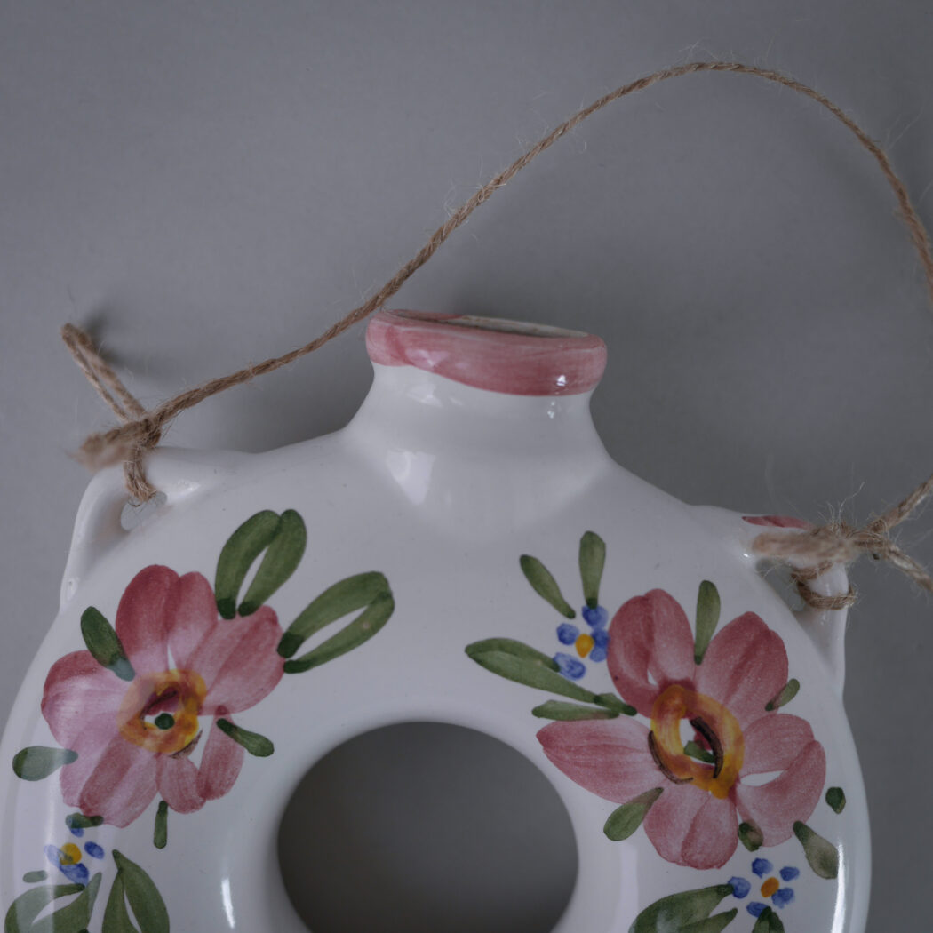 En fin lille vase, som kan hænge på væggen. Dekorative lyserøde blomster dekorationer. Den kan pyntes med blomster eller gran alt efter årstiden. Et fund fra Jylland.