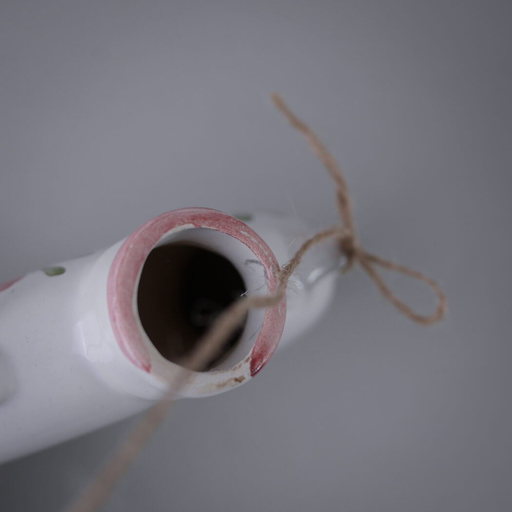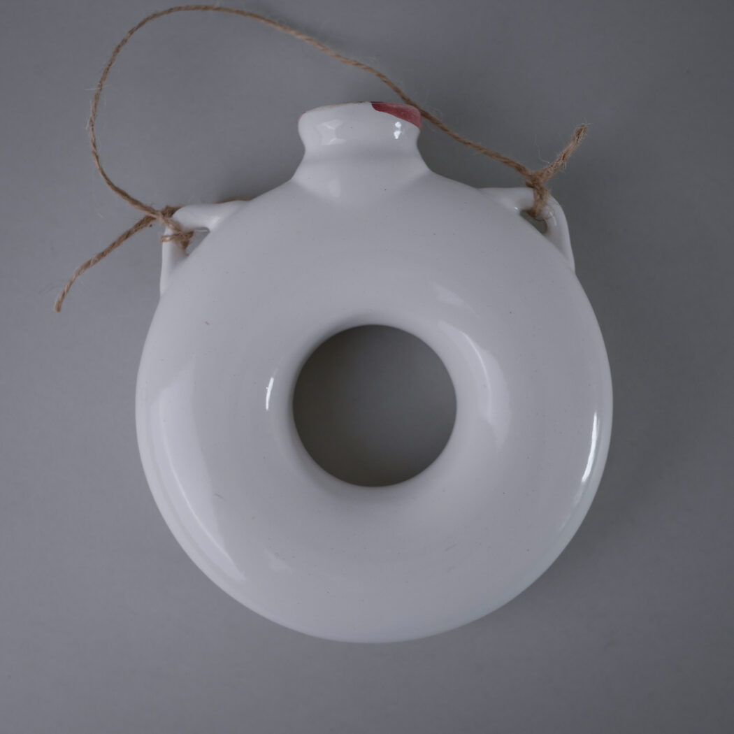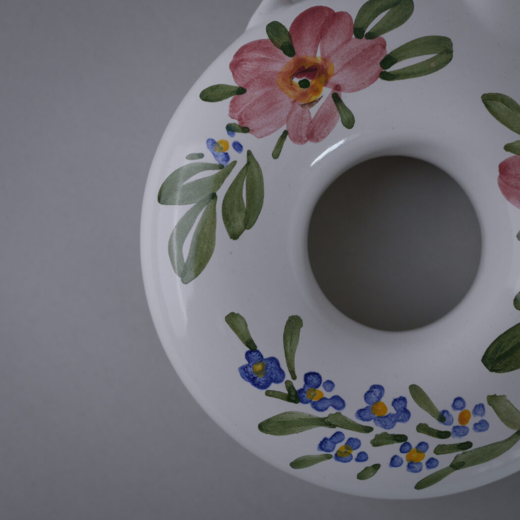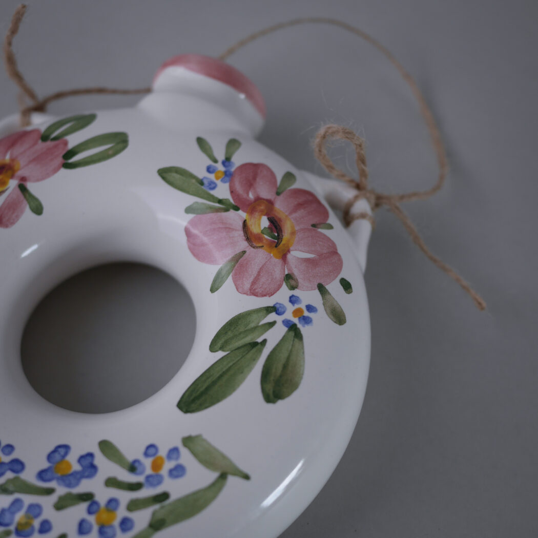 En fin lille vase, som kan hænge på væggen. Dekorative lyserøde blomster dekorationer. Den kan pyntes med blomster eller gran alt efter årstiden. Et fund fra Jylland.