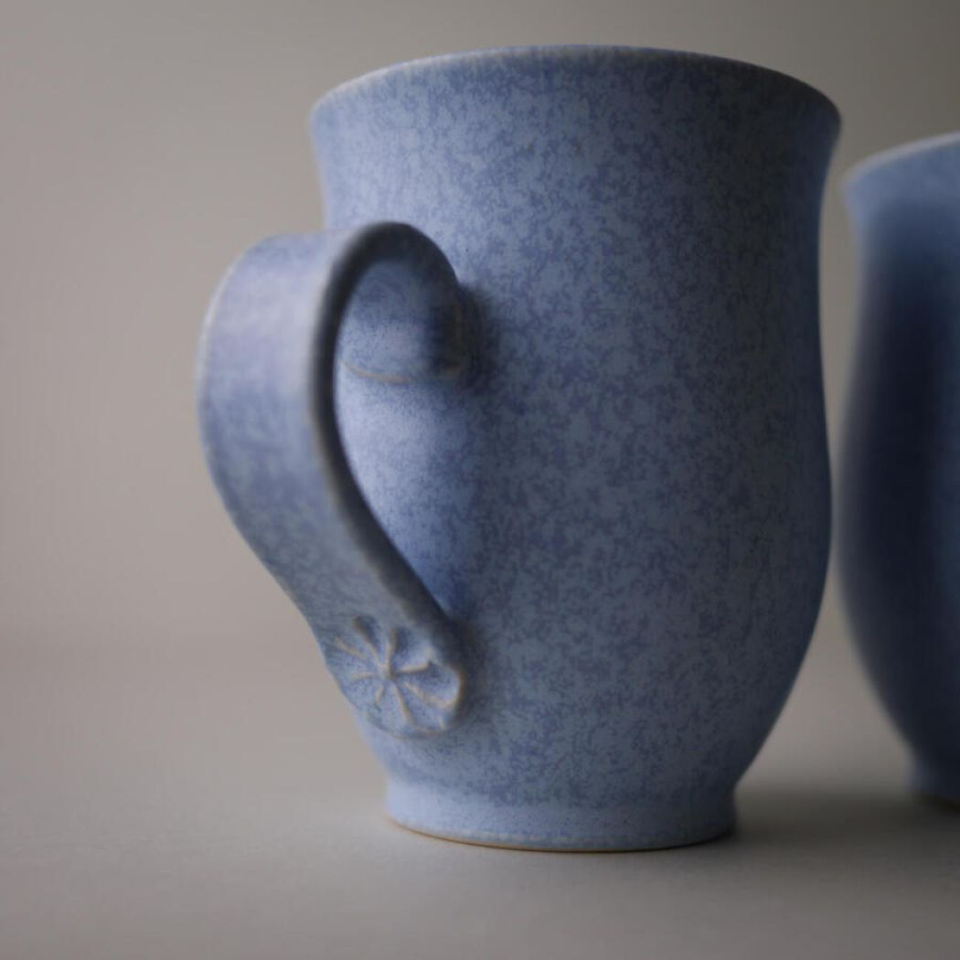 Fine lyseblå keramik krus med et flot spil i glasuren. Unikke krus til din personlige samling eller til udstilling i kopreolen, så de altid er lige ved hånden, når kaffetrangen er størst. 2 stk. haves, sælges separat. Krusene er fundet i Sverige,