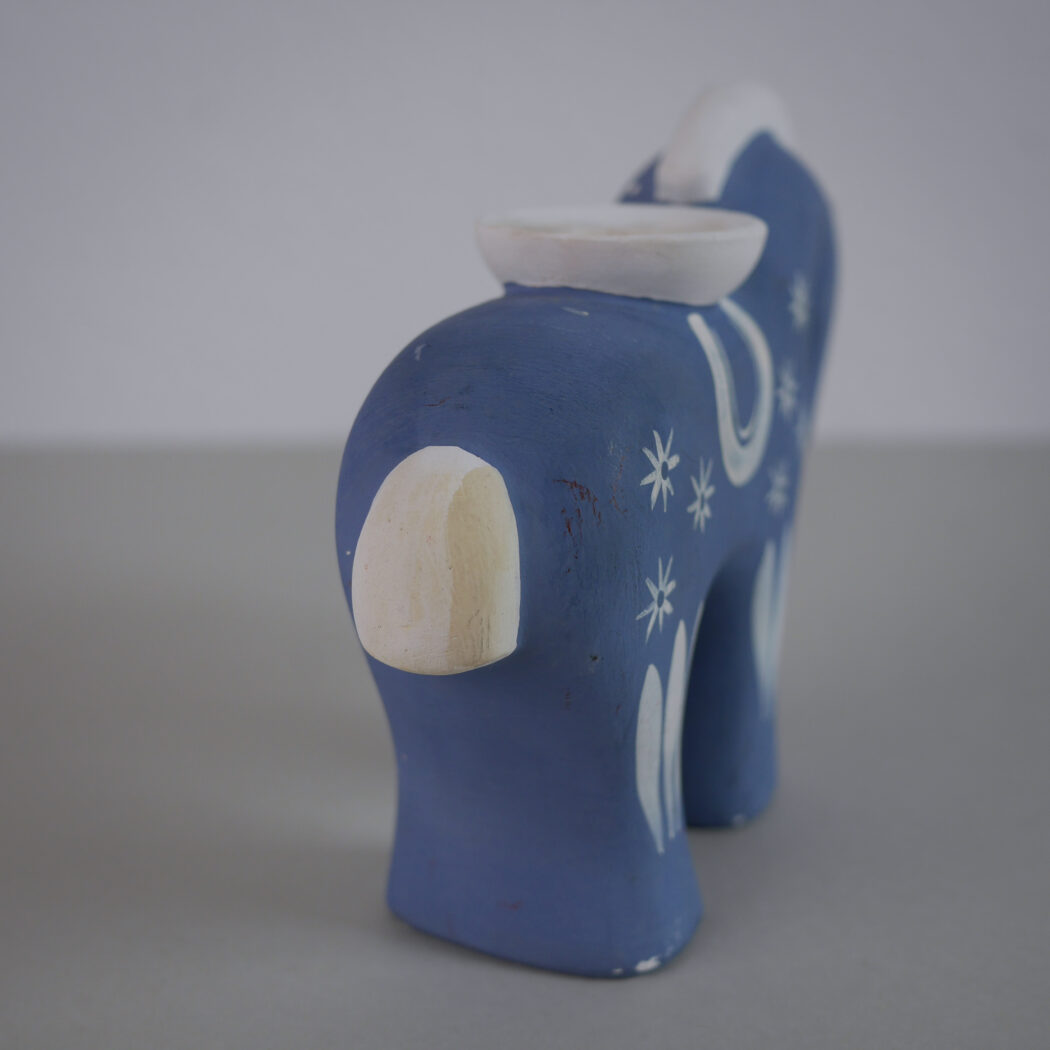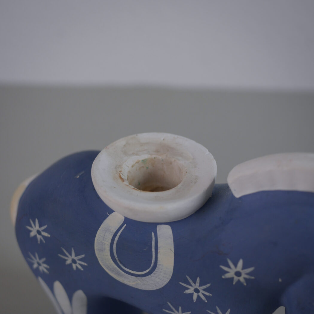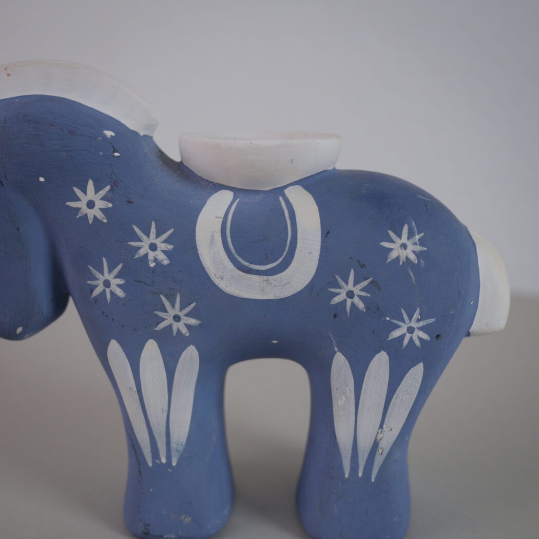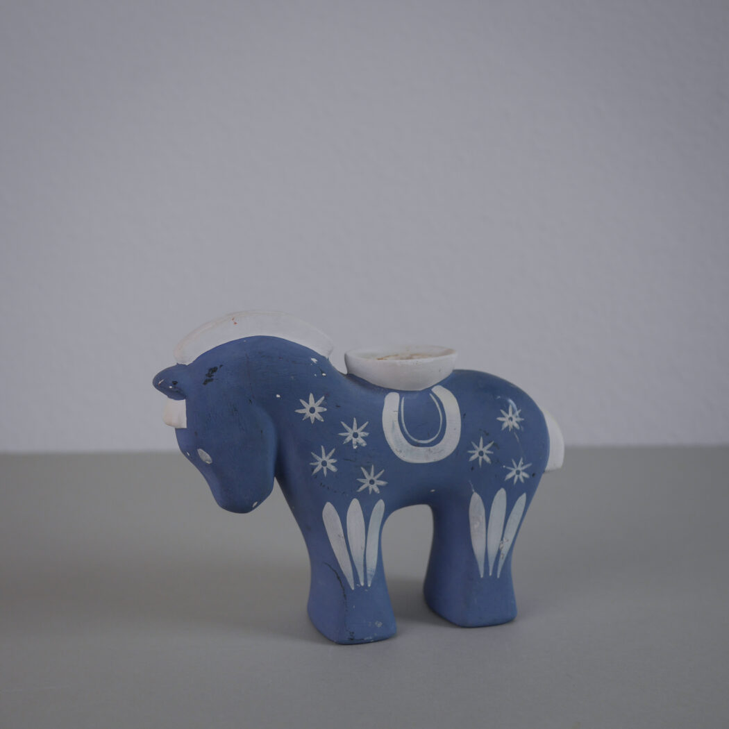 En charmerende lyseblå keramik lysestage hest med hvide dekorationer. Skøn nostalgi fra Sverige. En del patina, men sådan et skønt fund giver indretningen sjæl og personlighed, fordi det rummer en historie. Stagen passer til et kronelys. Et fund fra Sverige.