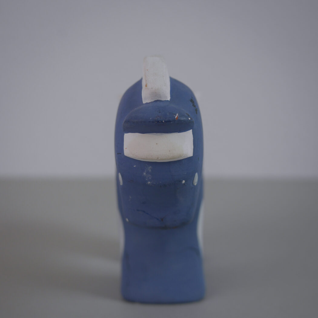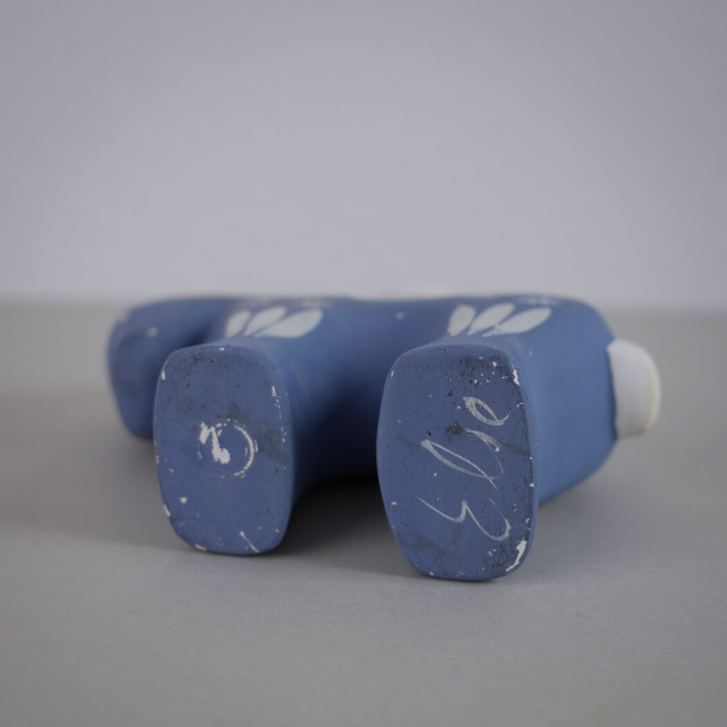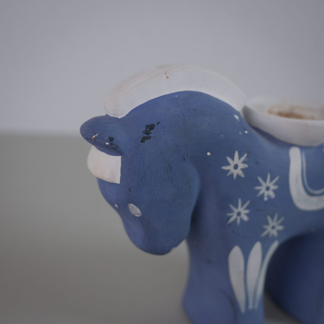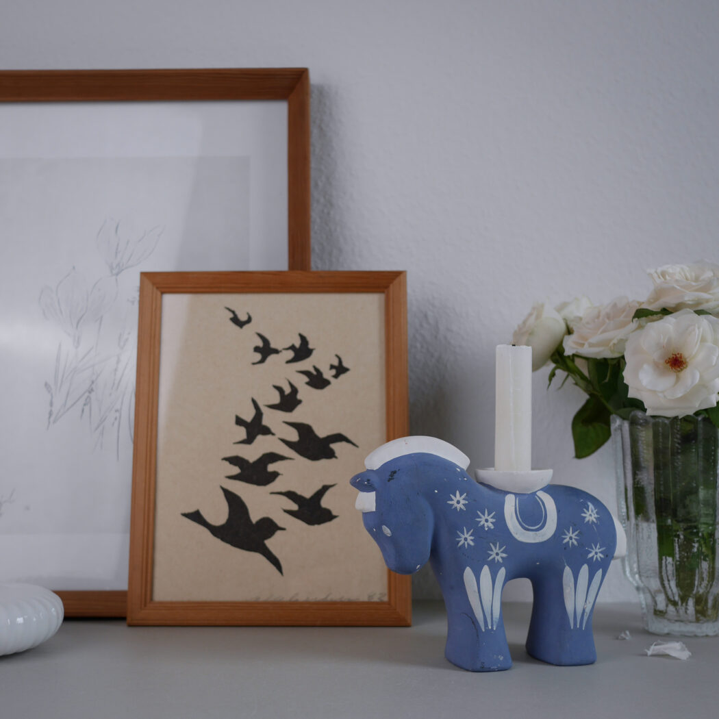En charmerende lyseblå keramik lysestage hest med hvide dekorationer. Skøn nostalgi fra Sverige. En del patina, men sådan et skønt fund giver indretningen sjæl og personlighed, fordi det rummer en historie. Stagen passer til et kronelys. Et fund fra Sverige.