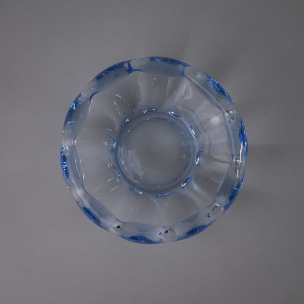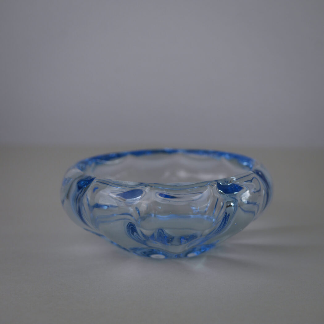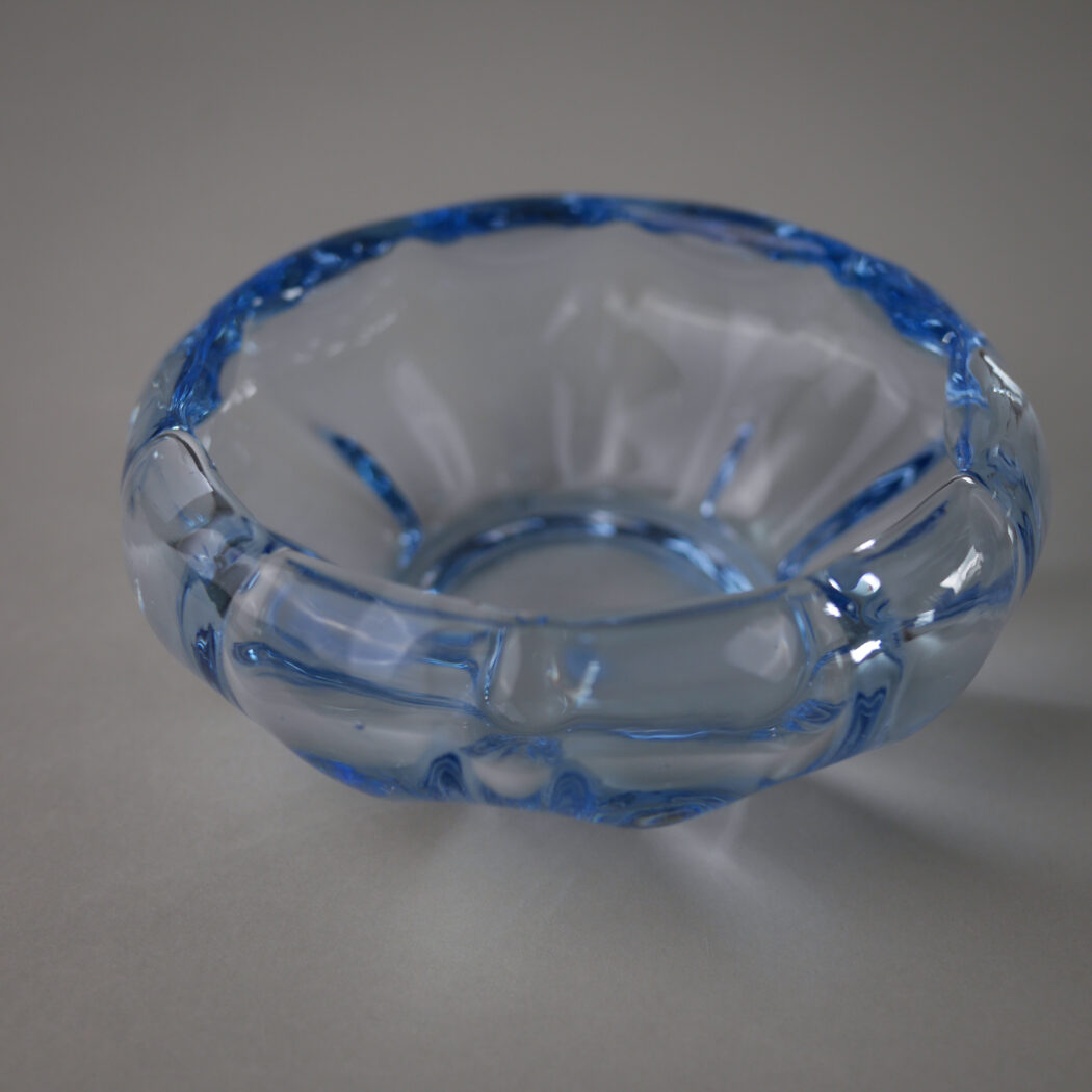 En fin lille lyseblå smykkeskål i glas med buede kanter. En dekorativ lille skål, som kan holde styr på smykker og nips f.eks. på hylden på badeværelset. Skålen er fundet i Sverige.