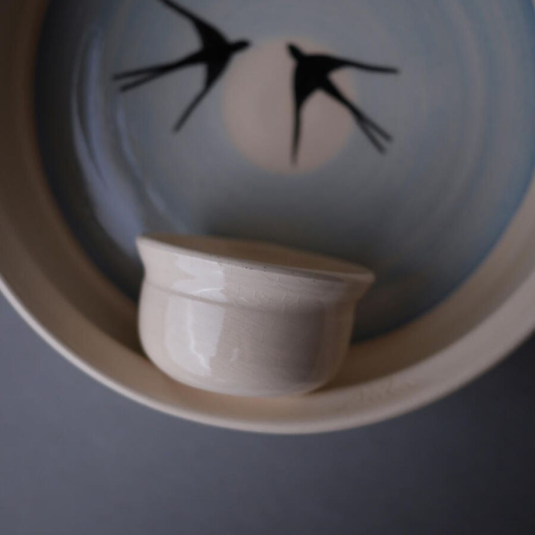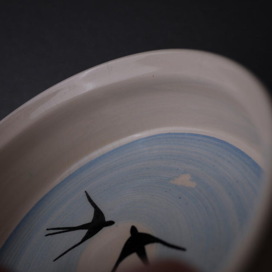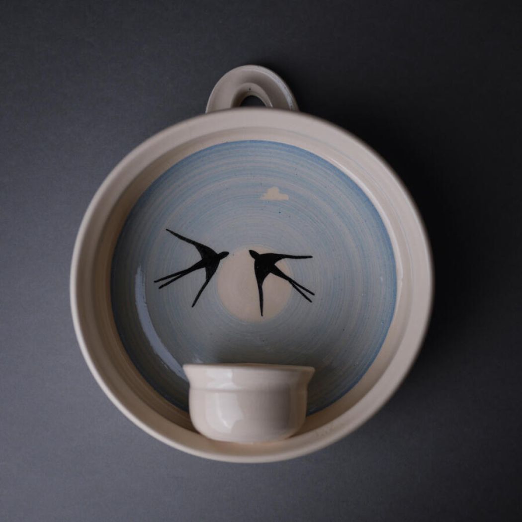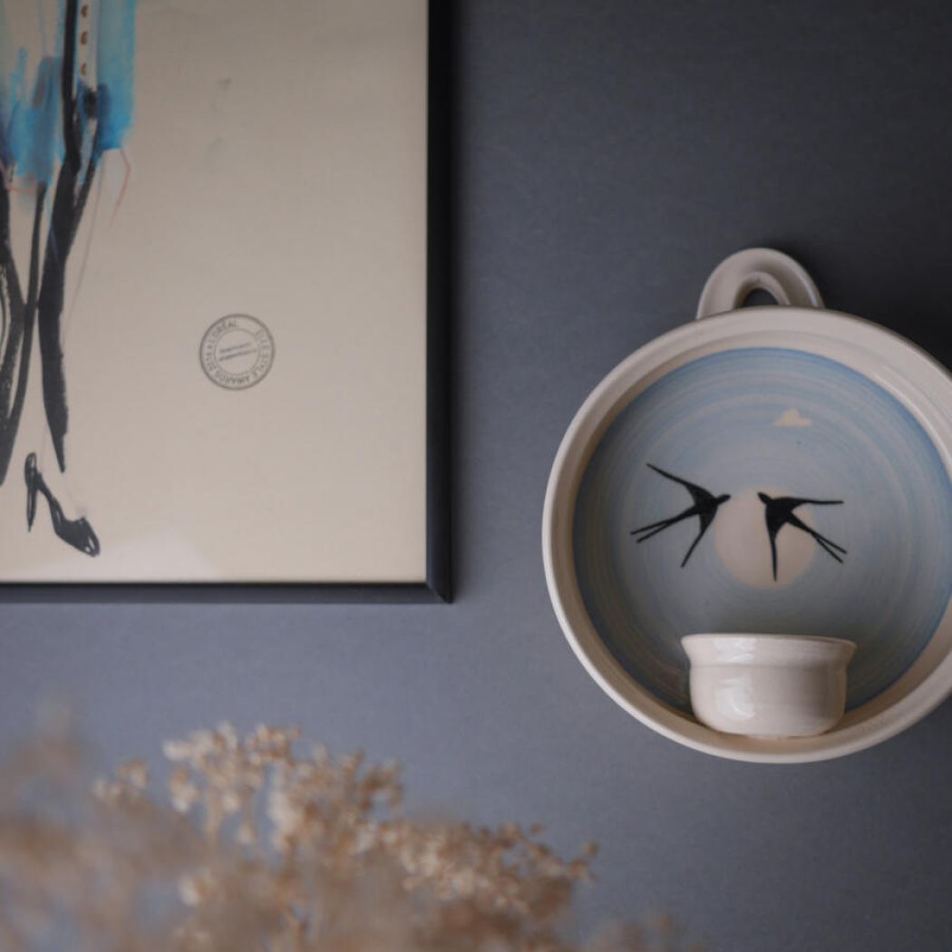 En fin lyseblå vægstage med smukke svaler som motiv. Lysestagen har plads til et enkelt fyrfadslys, og med denn unikke væstage får du både hyggelig belysning og en flot vægdekoration. Stagen er fundet i Sverige.