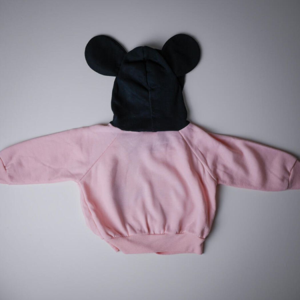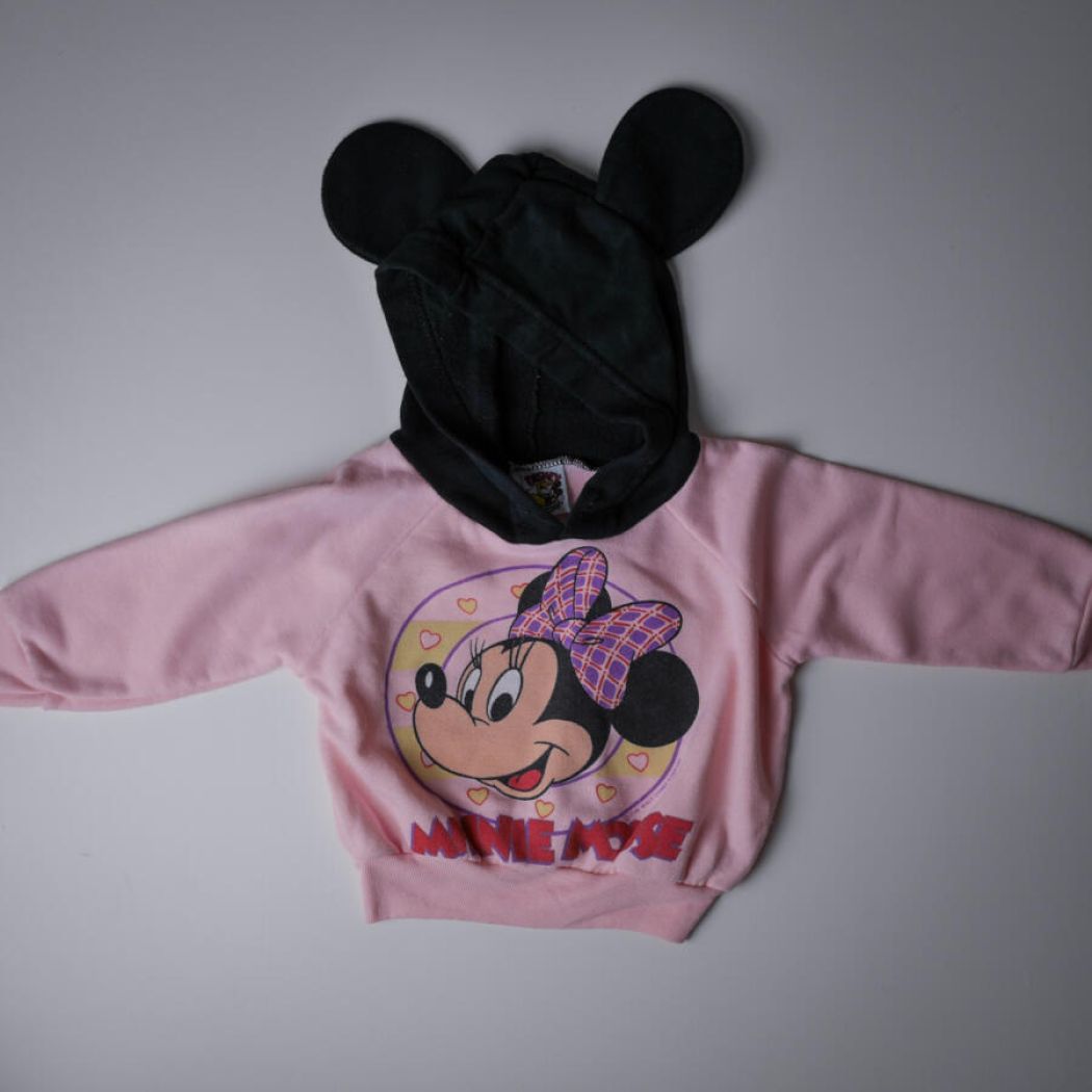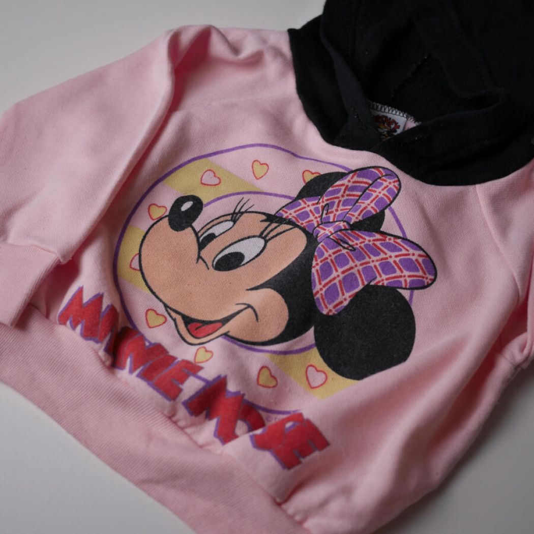 En fantastisk fin Minnie Mouse sweatbluse, blød og dejlig. Lyserød bluse med stort Minnie Mouse motiv foran og den skønneste sorte hætte med museører. Jeg vil vurdere blusen til en str. 62-86.