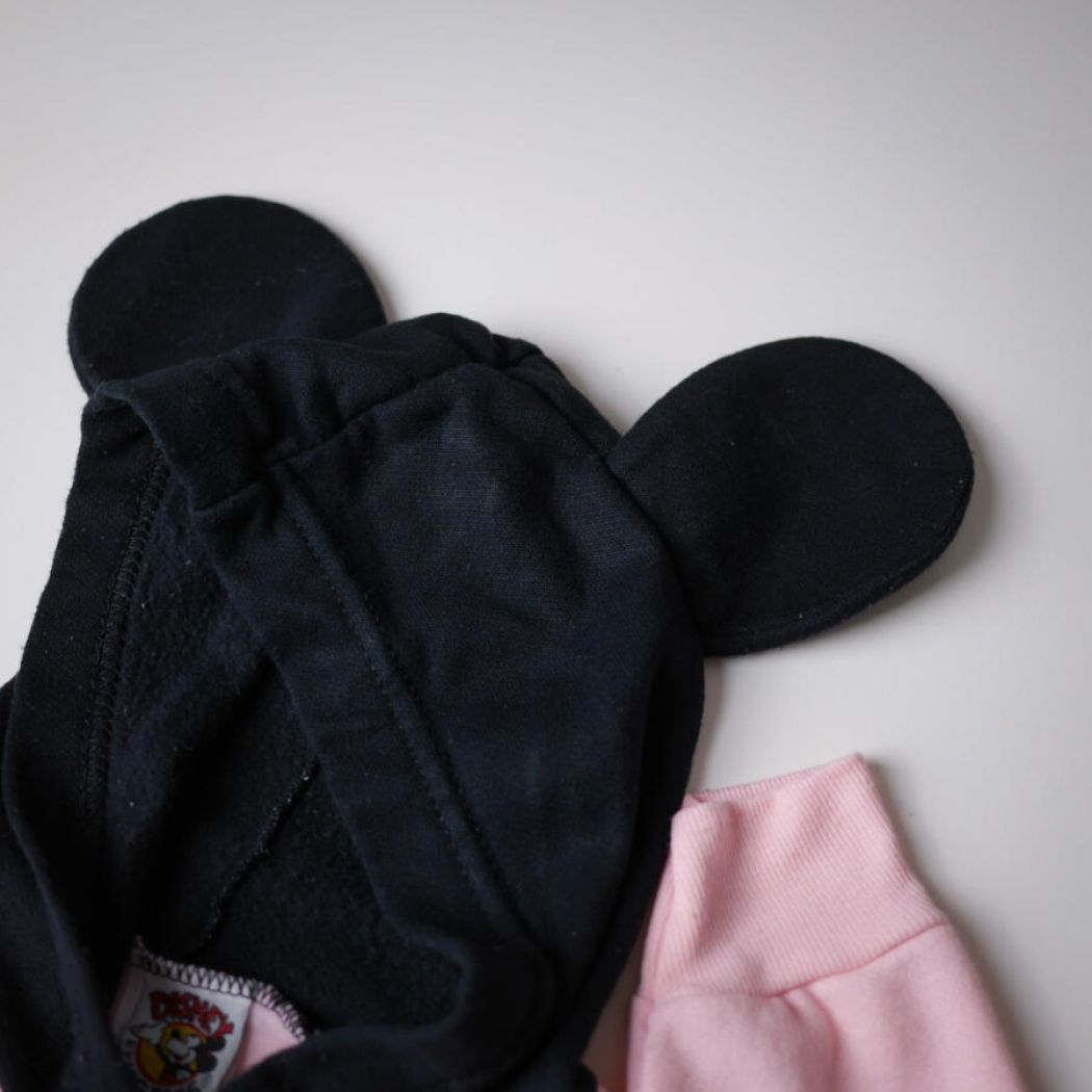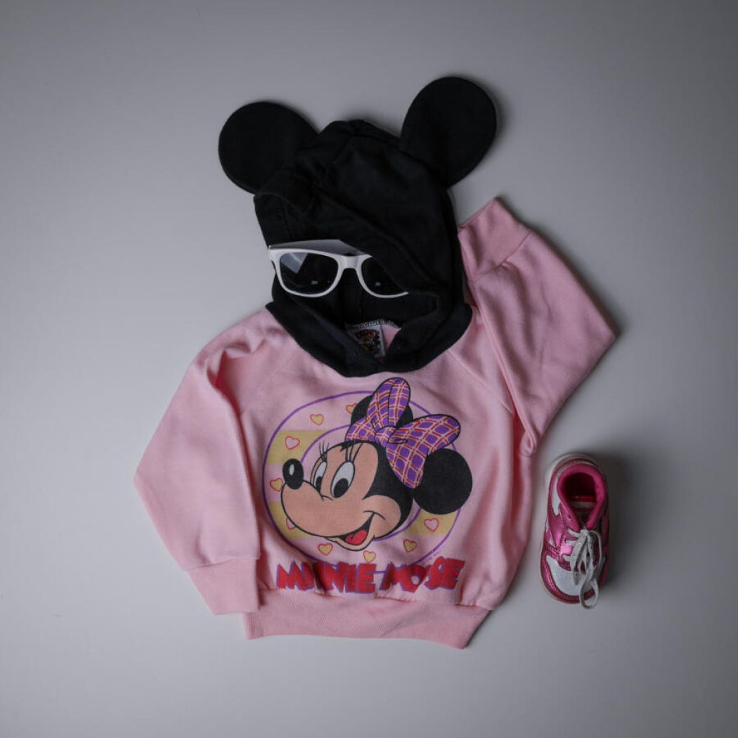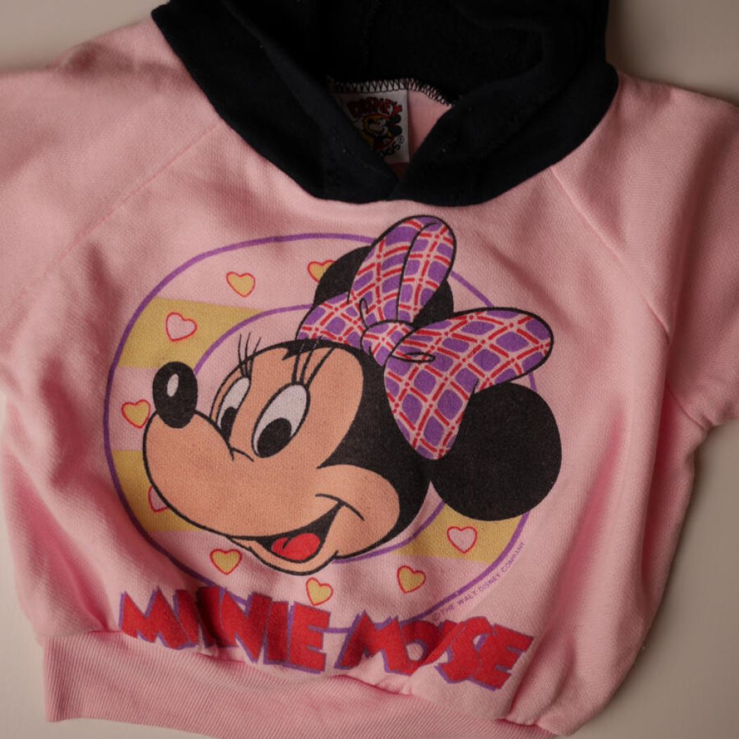 En fantastisk fin Minnie Mouse sweatbluse, blød og dejlig. Lyserød bluse med stort Minnie Mouse motiv foran og den skønneste sorte hætte med museører. Jeg vil vurdere blusen til en str. 62-86.