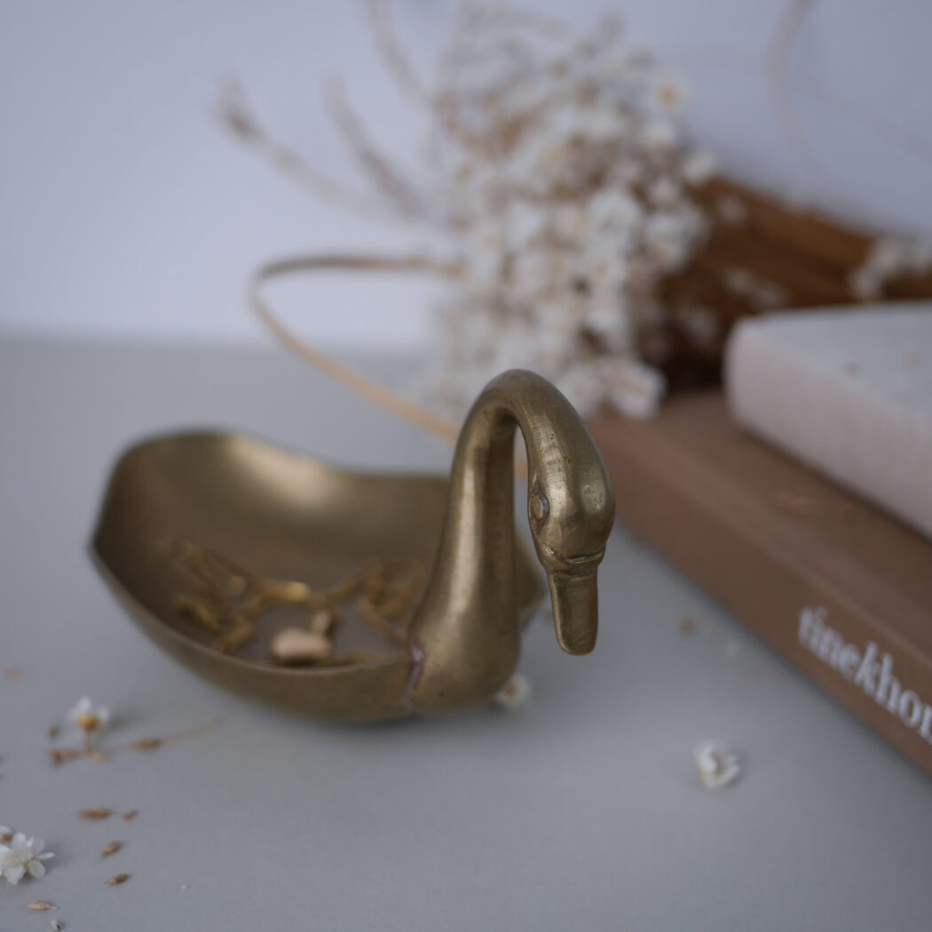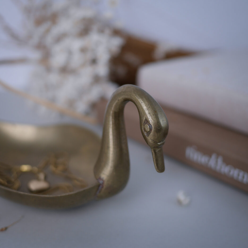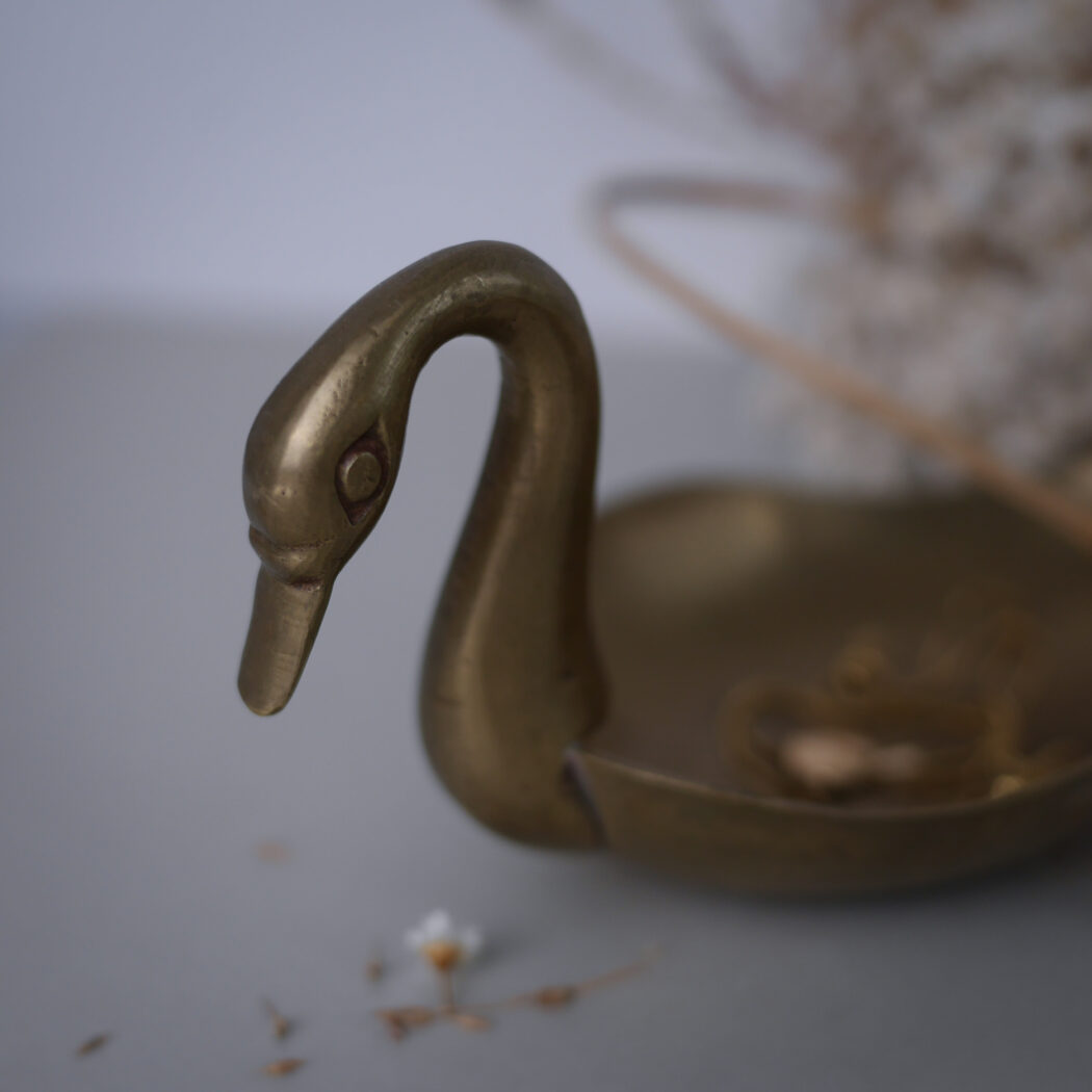 En smuk messing svane skål til alle de små vigtige nipseting og smykker, som har brug for en fast plads. Messing giver indretningen varme og kombineret med svane-looket har du en unik pynteskål. Et fund fra Jylland.