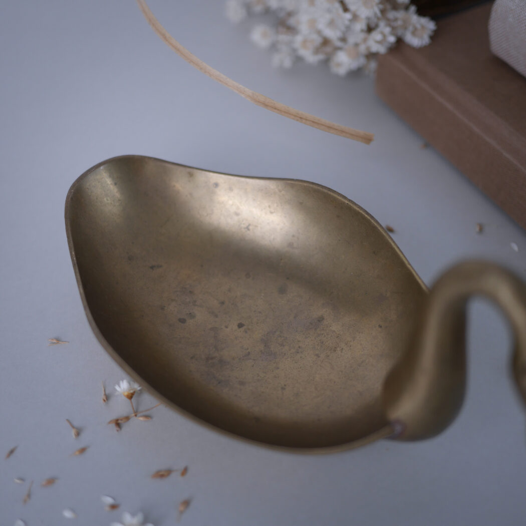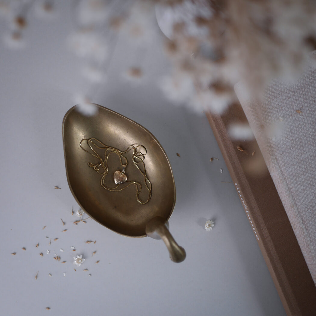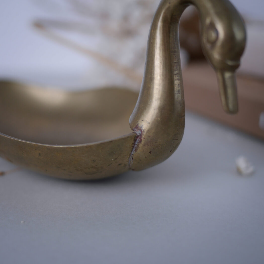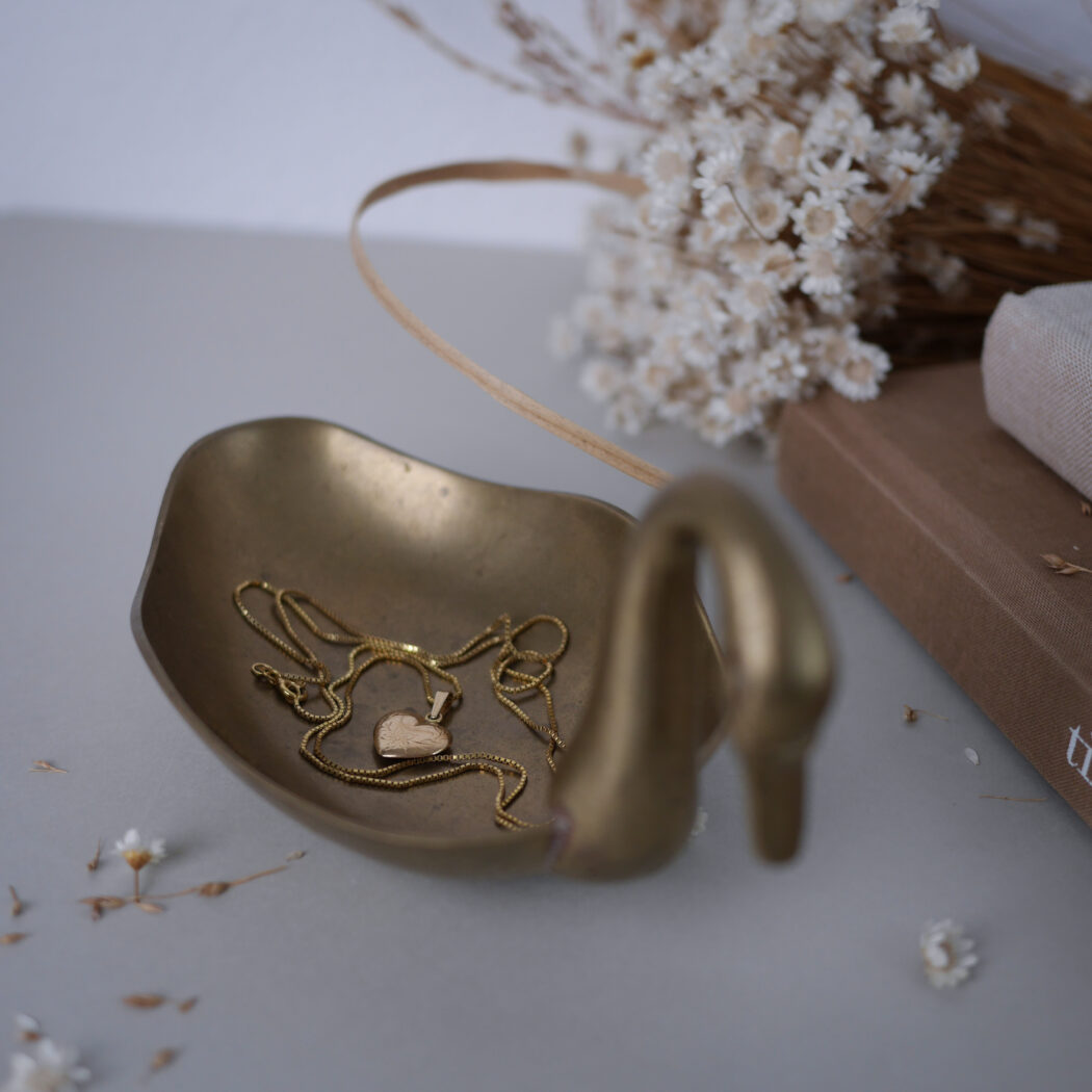 En smuk messing svane skål til alle de små vigtige nipseting og smykker, som har brug for en fast plads. Messing giver indretningen varme og kombineret med svane-looket har du en unik pynteskål. Et fund fra Jylland.