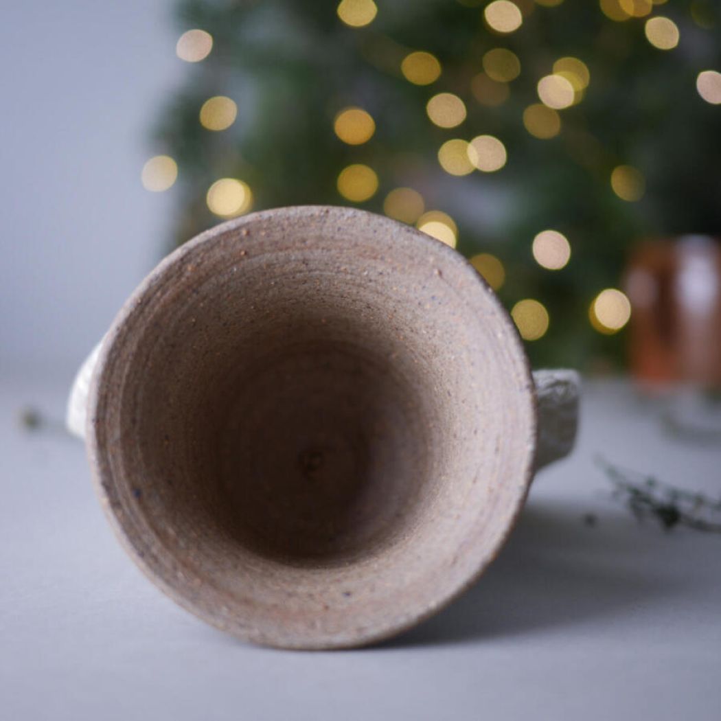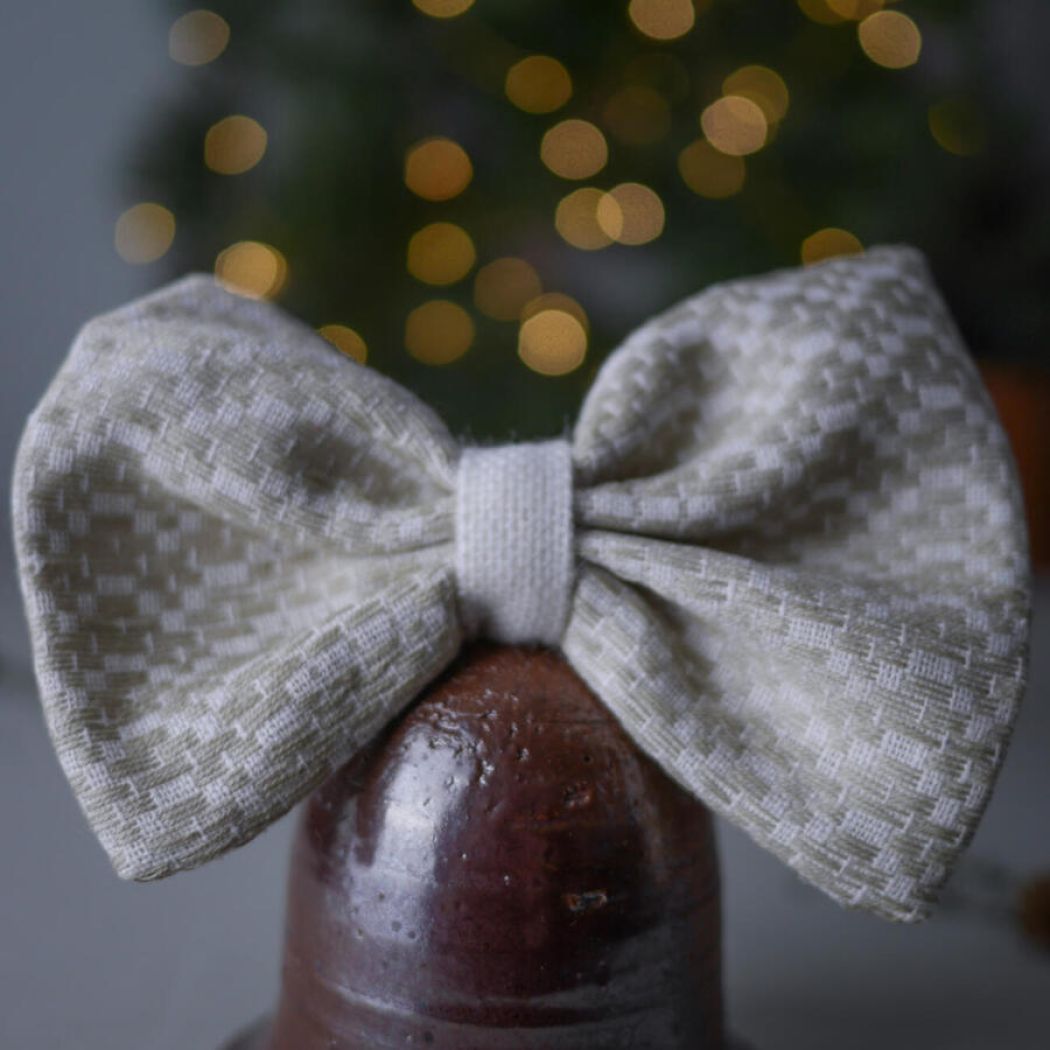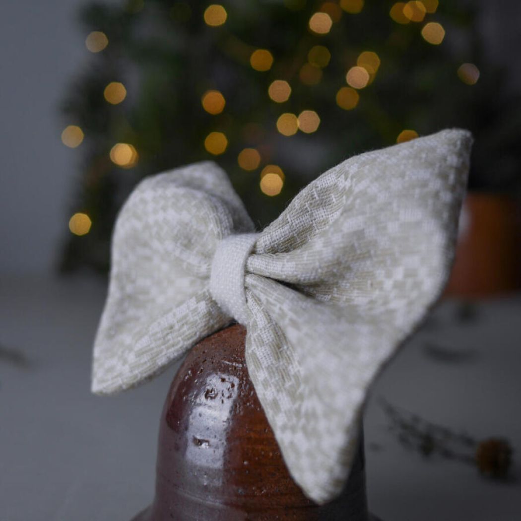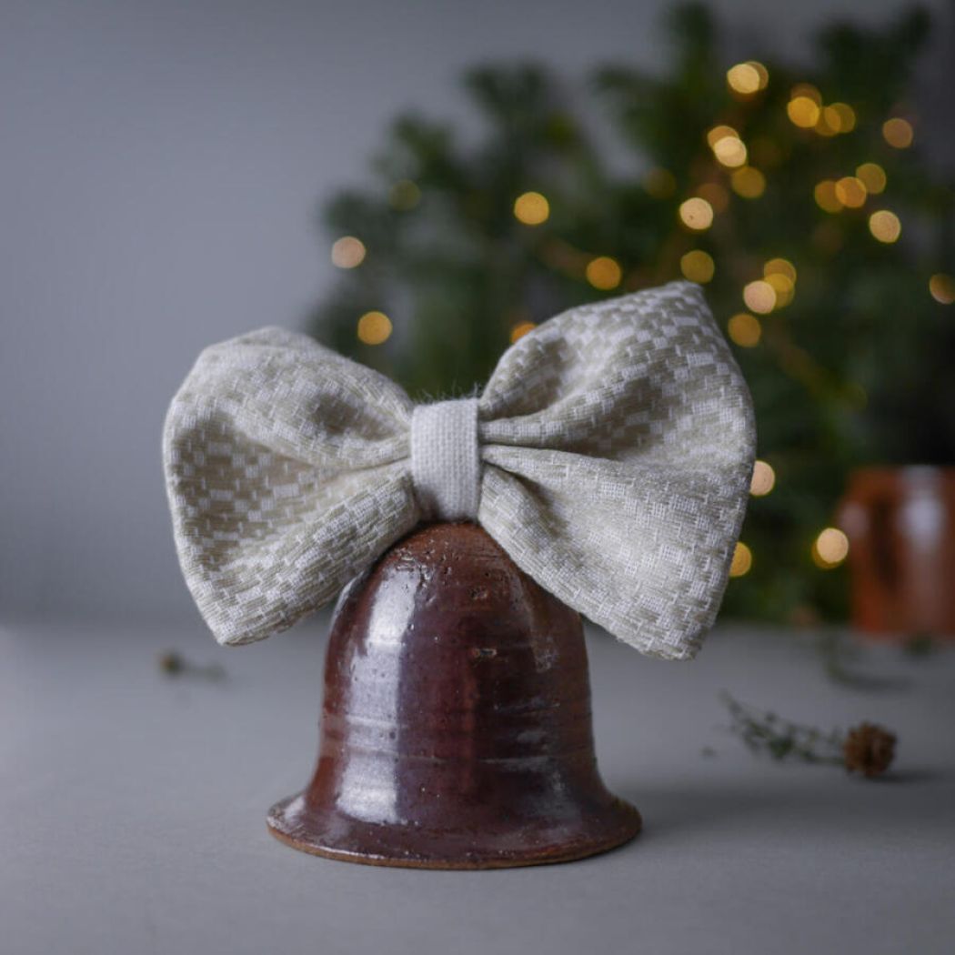 En rustik mørkebrun juleklokke i keramik med en smuk håndsyet sløjfe. Klokken har en lille snor, så den kan hænges op, men den er også flot stående på en hylde eller i vindueskarmen. Sløjfen er håndsyet af vintagestof med et smukt mønster.
