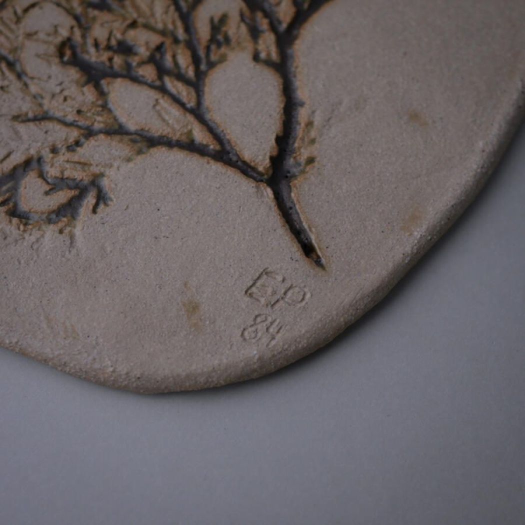 Et ovalt relief med aftryk af gren – beige keramik, som nemt kan styles i indretningen. Et håndlavet keramikrelief fra Sverige.
