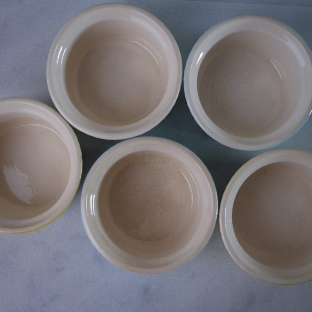 En samling søde små pastelfarvede ramekin skåle, som giver kulør til køkkenet. Brug dem på spisebordet til små snacks eller til dyppelser. Elsker pastelfarverne. 5 stk. fundet i Sverige, og de sælges samlet.