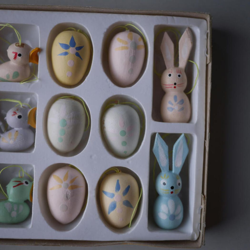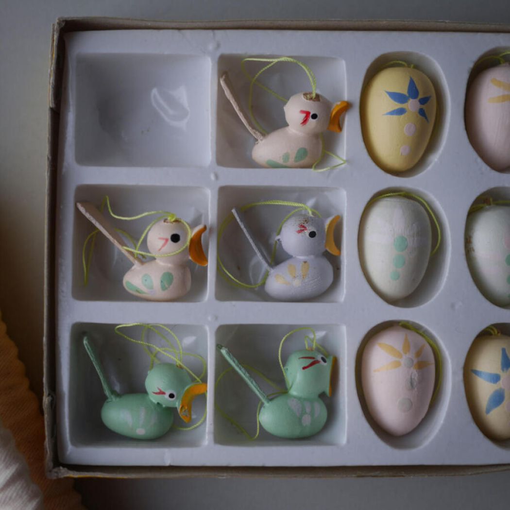Fint pastelfarvet påskepynt i træ. Små fugle, æg og harer i skønne lyse nuancer med enkle dekorationer på. Påskepynt er nu en ret hyggelig tradition. Obs. den ene fugl har fået limet halen. 14 dele haves, sælges samlet.