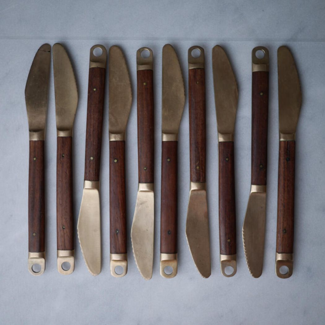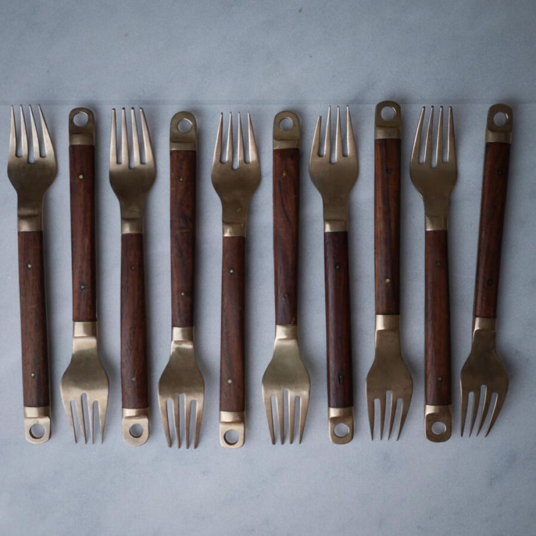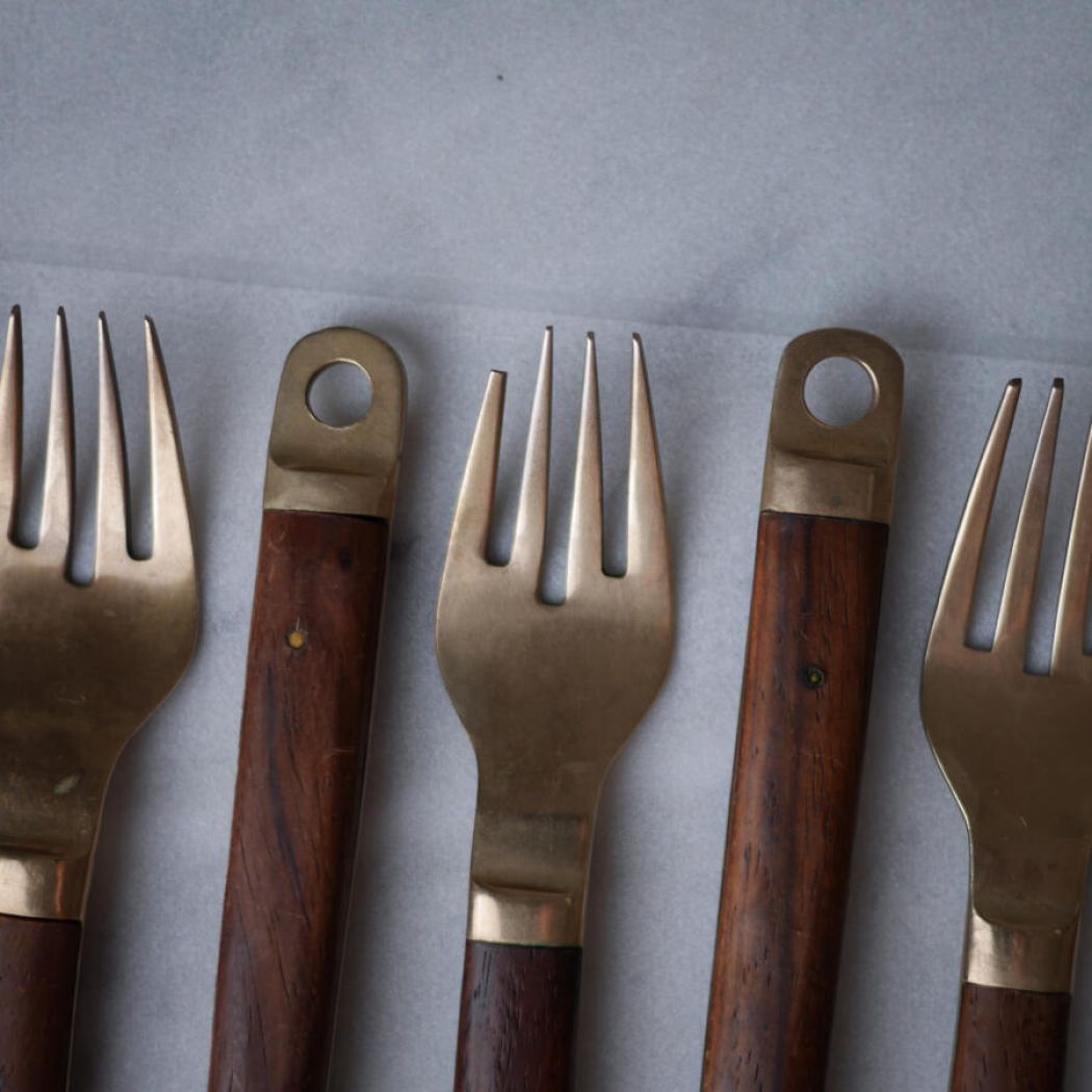 Det lækreste retro messing bestik med mørke træskafter, messing nitter og skøn patina. Bestikket har en sjov ring for ende af skaftet, hvis man skulle ville hænge det op! Et flot bestiksæt til det rustikke middagsbord. 15 dele fundet, 5 gafler, 5 knive og 5 skeer. Sælges samlet.
