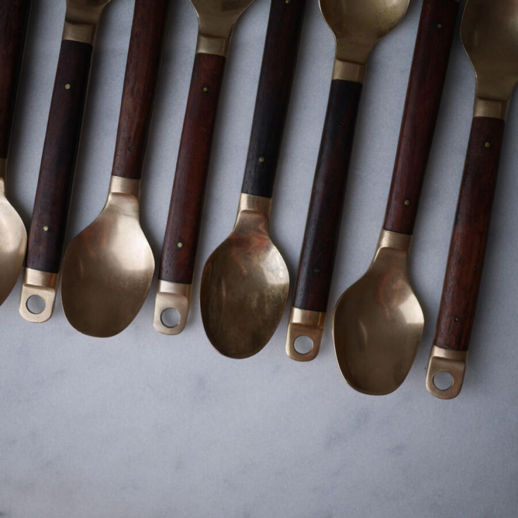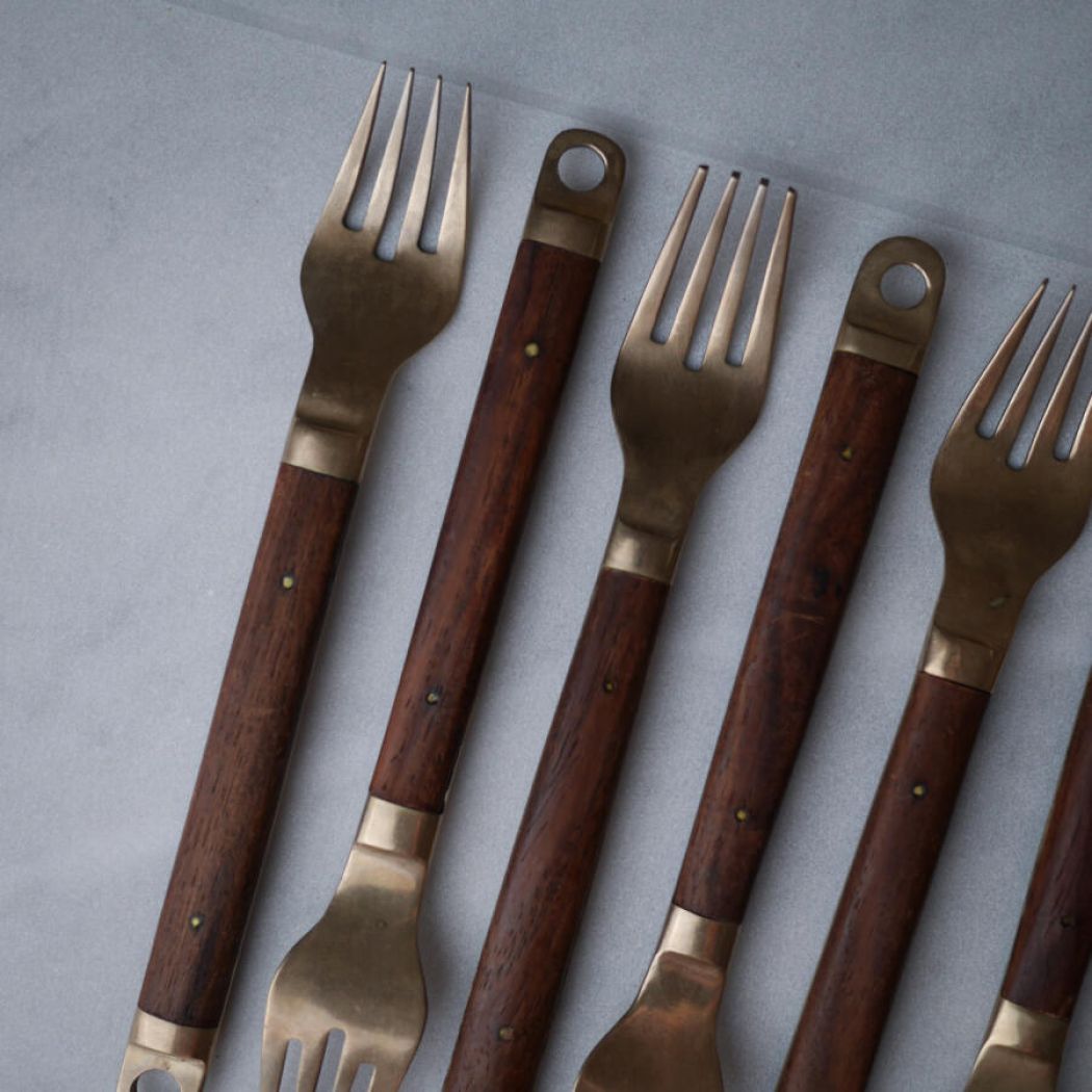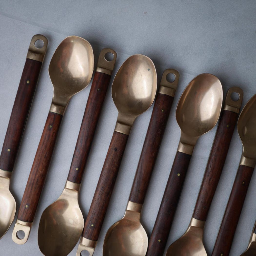 Det lækreste retro messing bestik med mørke træskafter, messing nitter og skøn patina. Bestikket har en sjov ring for ende af skaftet, hvis man skulle ville hænge det op! Et flot bestiksæt til det rustikke middagsbord. 15 dele fundet, 5 gafler, 5 knive og 5 skeer. Sælges samlet.