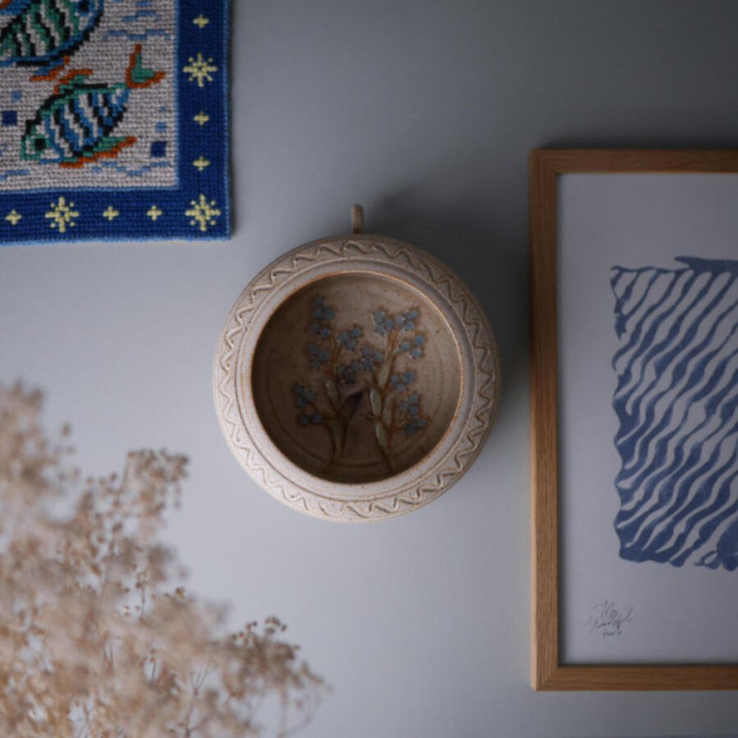 Rund Keramik Vægstage med Blå Blomster