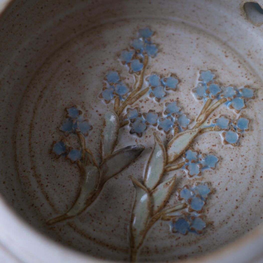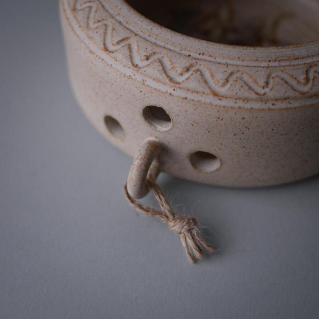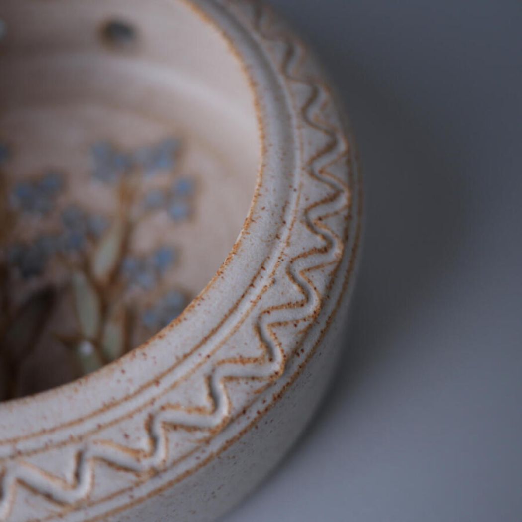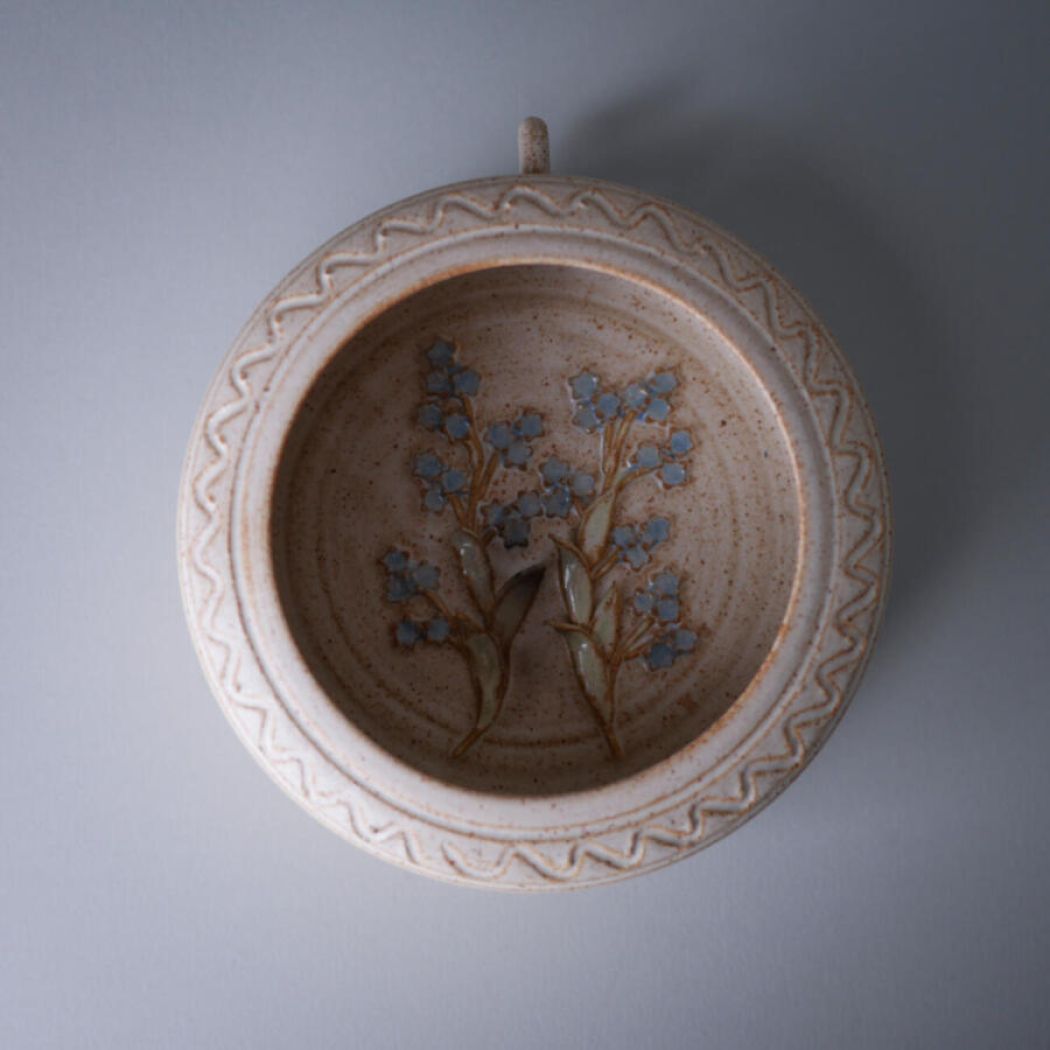 En virkelig fin rund keramik væglysestage med smukke blå blomster indeni. Væglysestagen har kønne dekorationer i den lyse keramik, og der kan sættes et lys i bunden, så der kommer hyggelig belysning i stuen. Et enkelt af de små blade er knækket, men heldigvis lægger man ikke mærke til det, når den hænger på væggen. Lysestagen er fundet i Sverige.