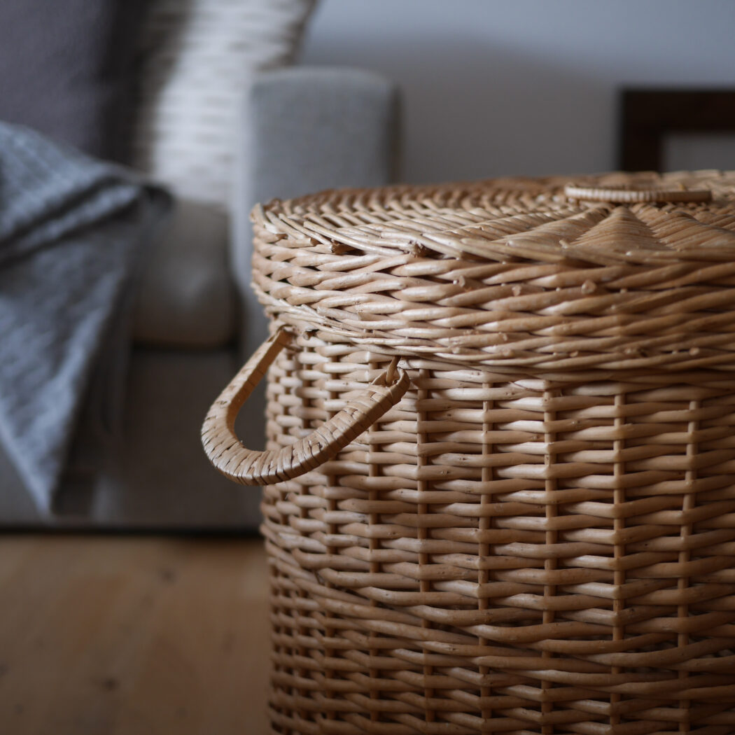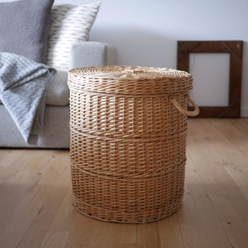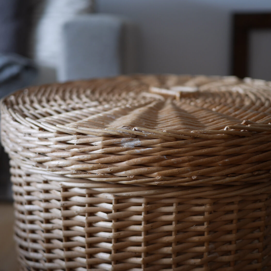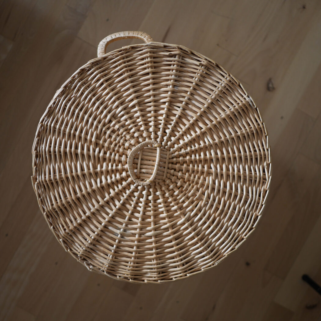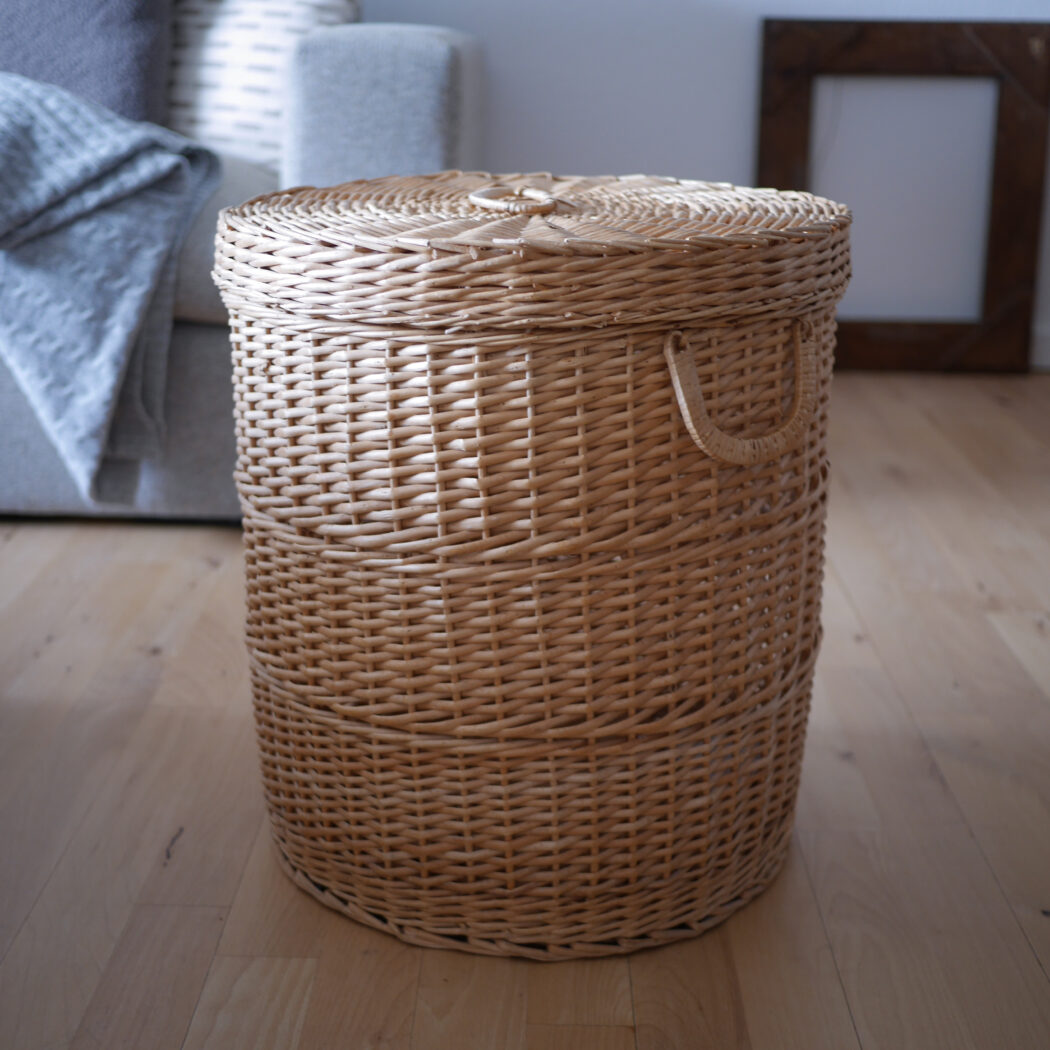 En flot rund kurv i pileflet med låg og to hanke. Kurven er god til opbevaring, og så er den pæn samtidig. Gem dit vasketøj, børnenes bamser eller andet rod i denne fine kurv. Et fund fra Sverige.