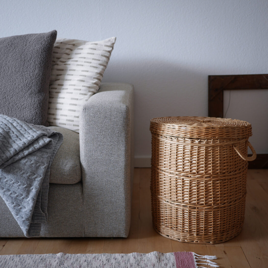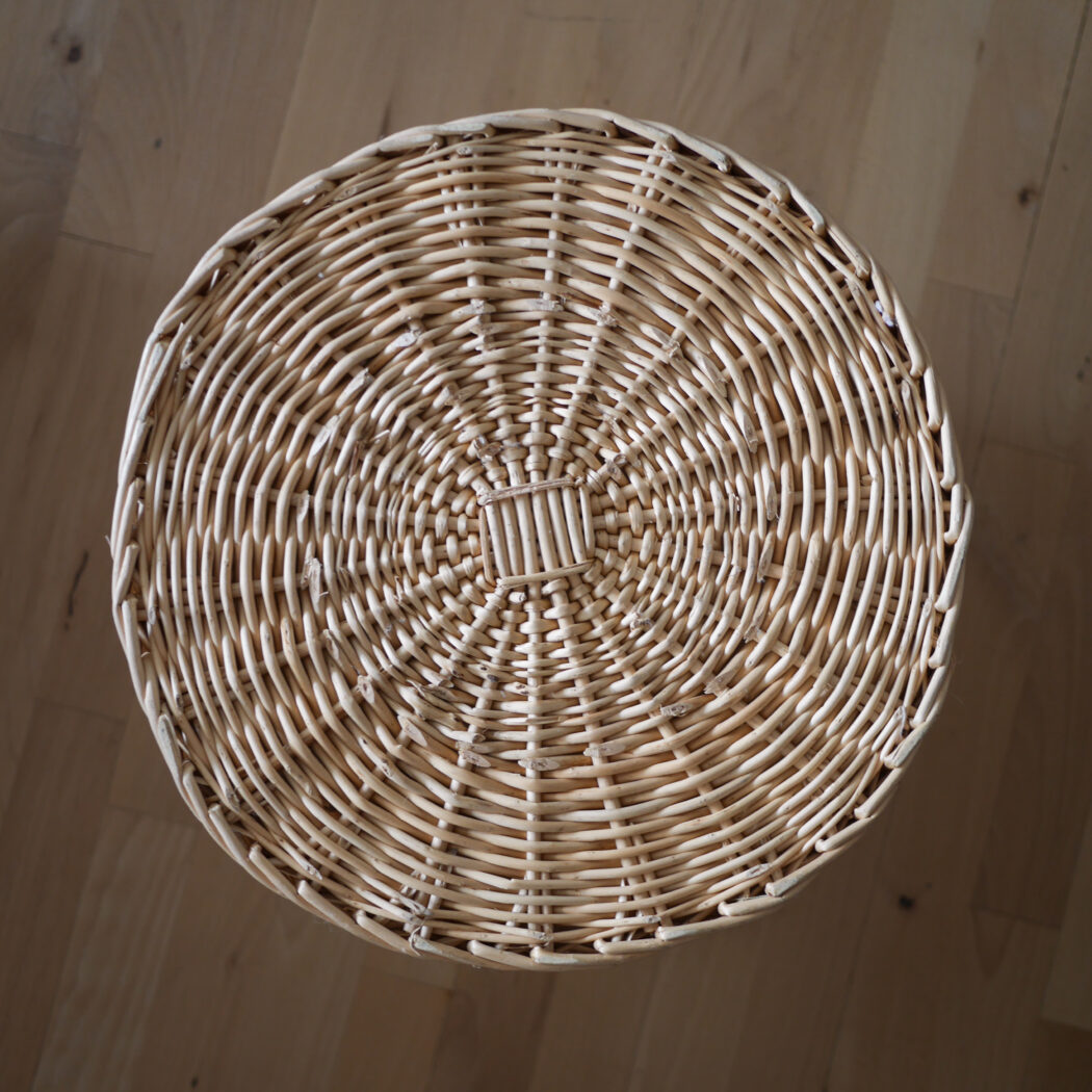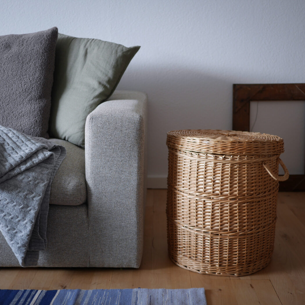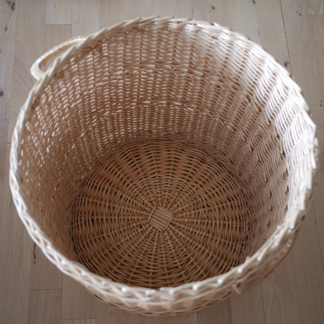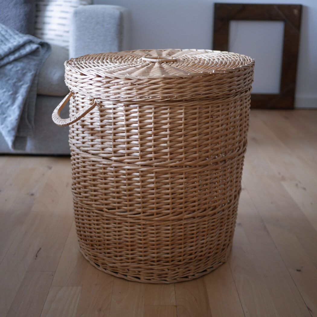 En flot rund kurv i pileflet med låg og to hanke. Kurven er god til opbevaring, og så er den pæn samtidig. Gem dit vasketøj, børnenes bamser eller andet rod i denne fine kurv. Et fund fra Sverige.