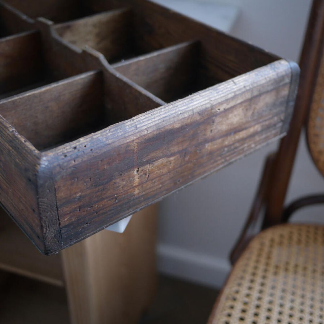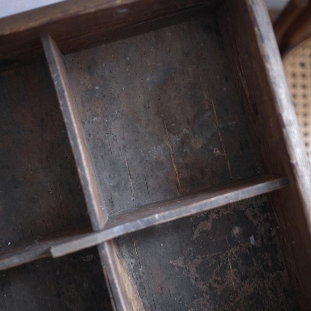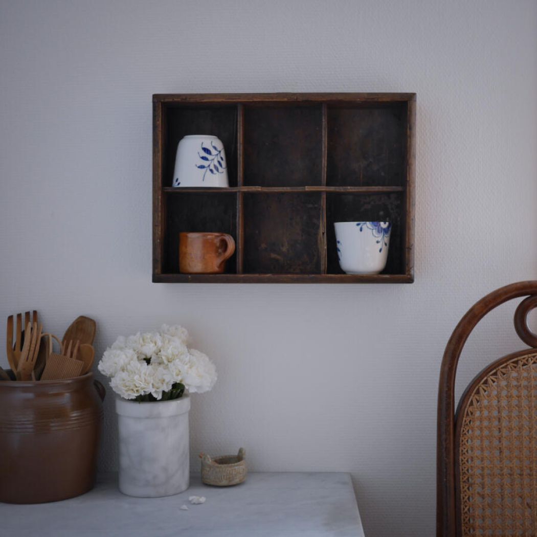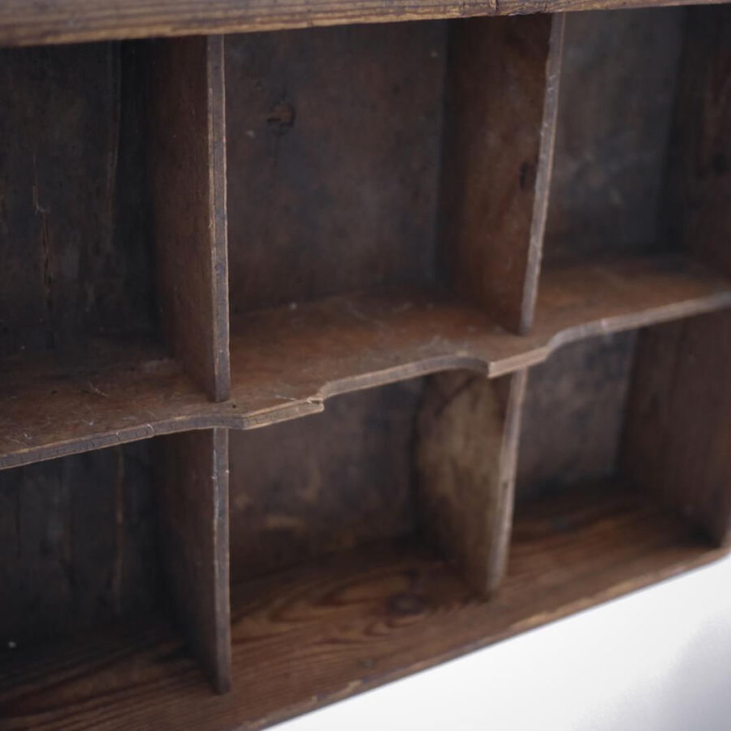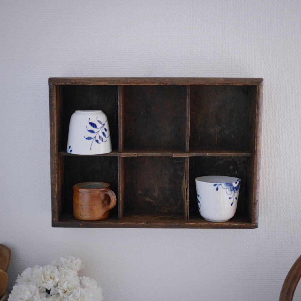 En skøn og meget rustik kopreol i mørkt træ. Den har noget alder på sig, og træet har slået sig primært på bagpladen, se detaljebilleder. Et cool, patineret og rustikt look – en fed reol til udstilling af dine krus og kopper.