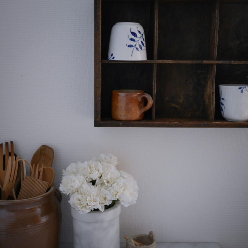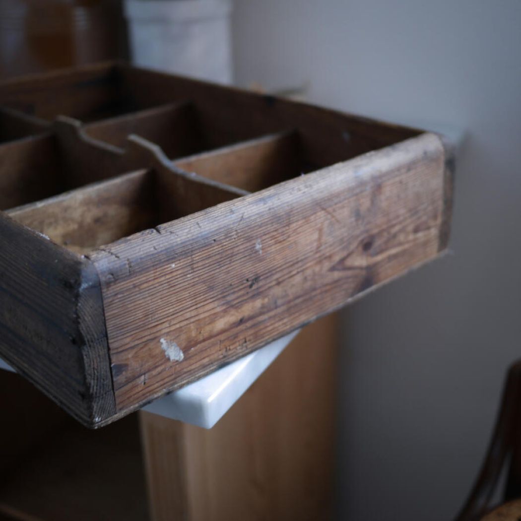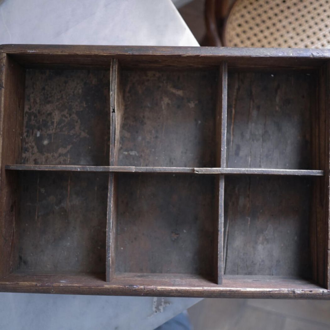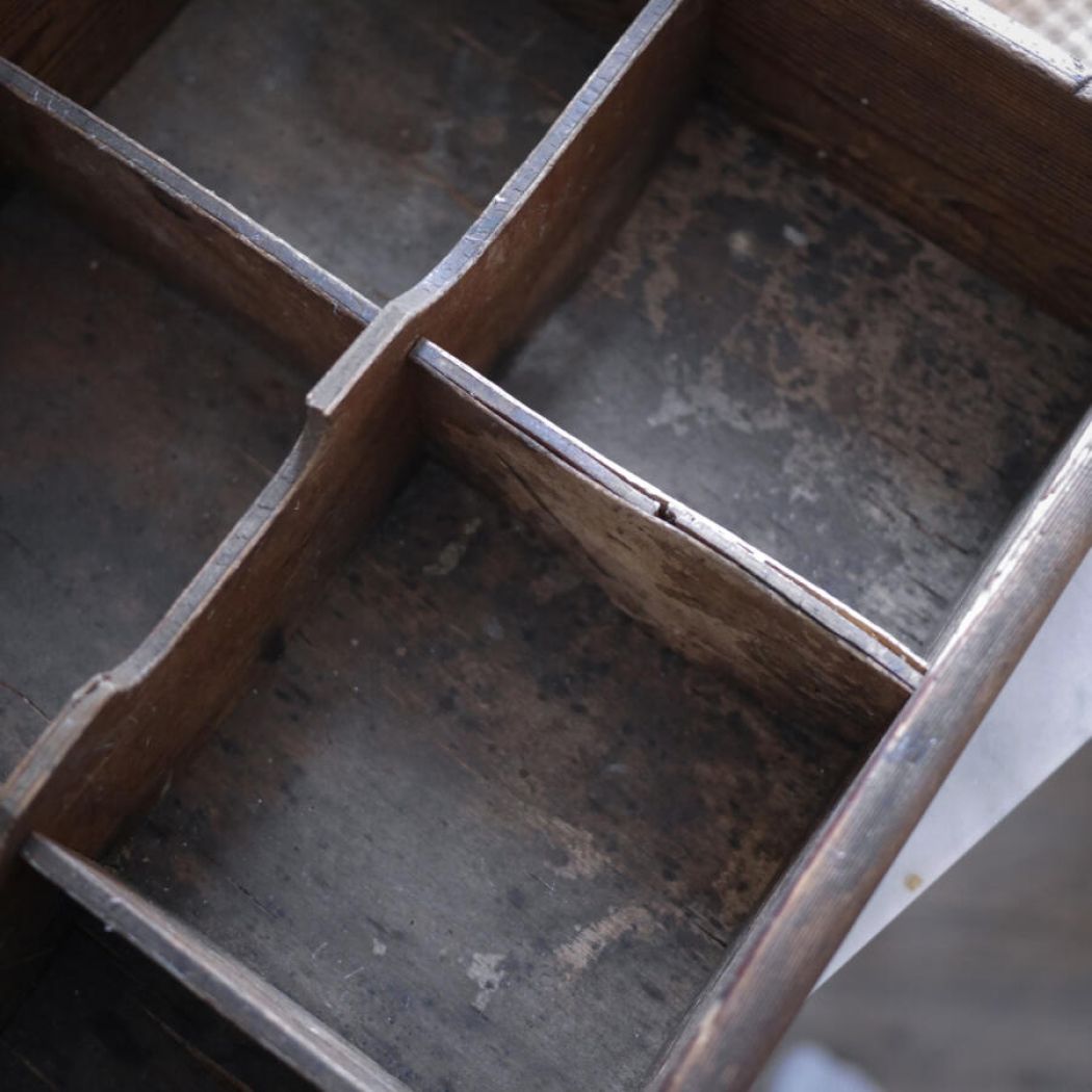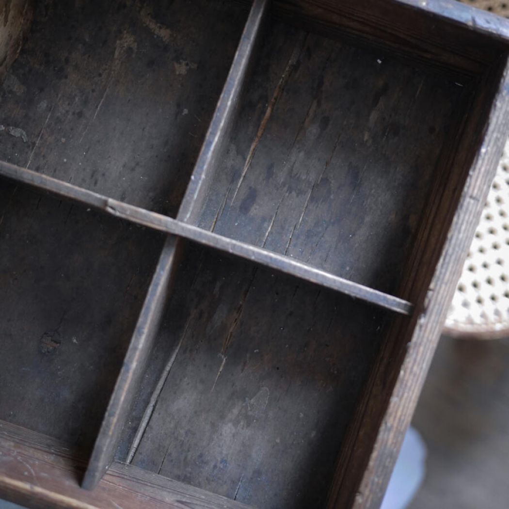 En skøn og meget rustik kopreol i mørkt træ. Den har noget alder på sig, og træet har slået sig primært på bagpladen, se detaljebilleder. Et cool, patineret og rustikt look – en fed reol til udstilling af dine krus og kopper.
