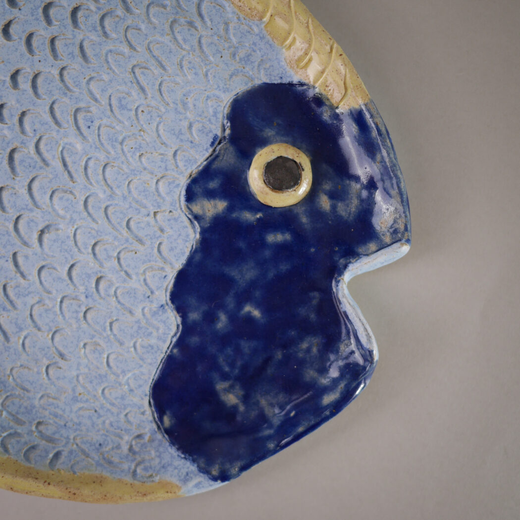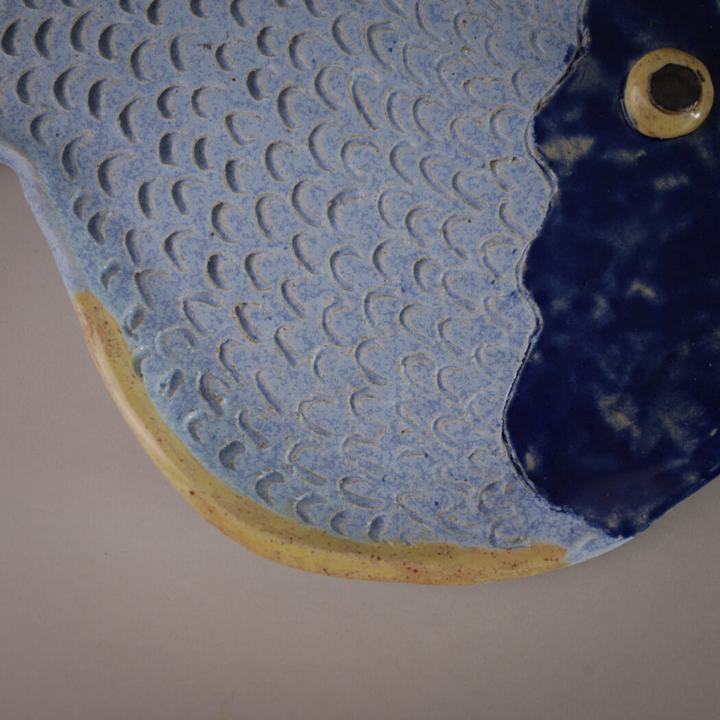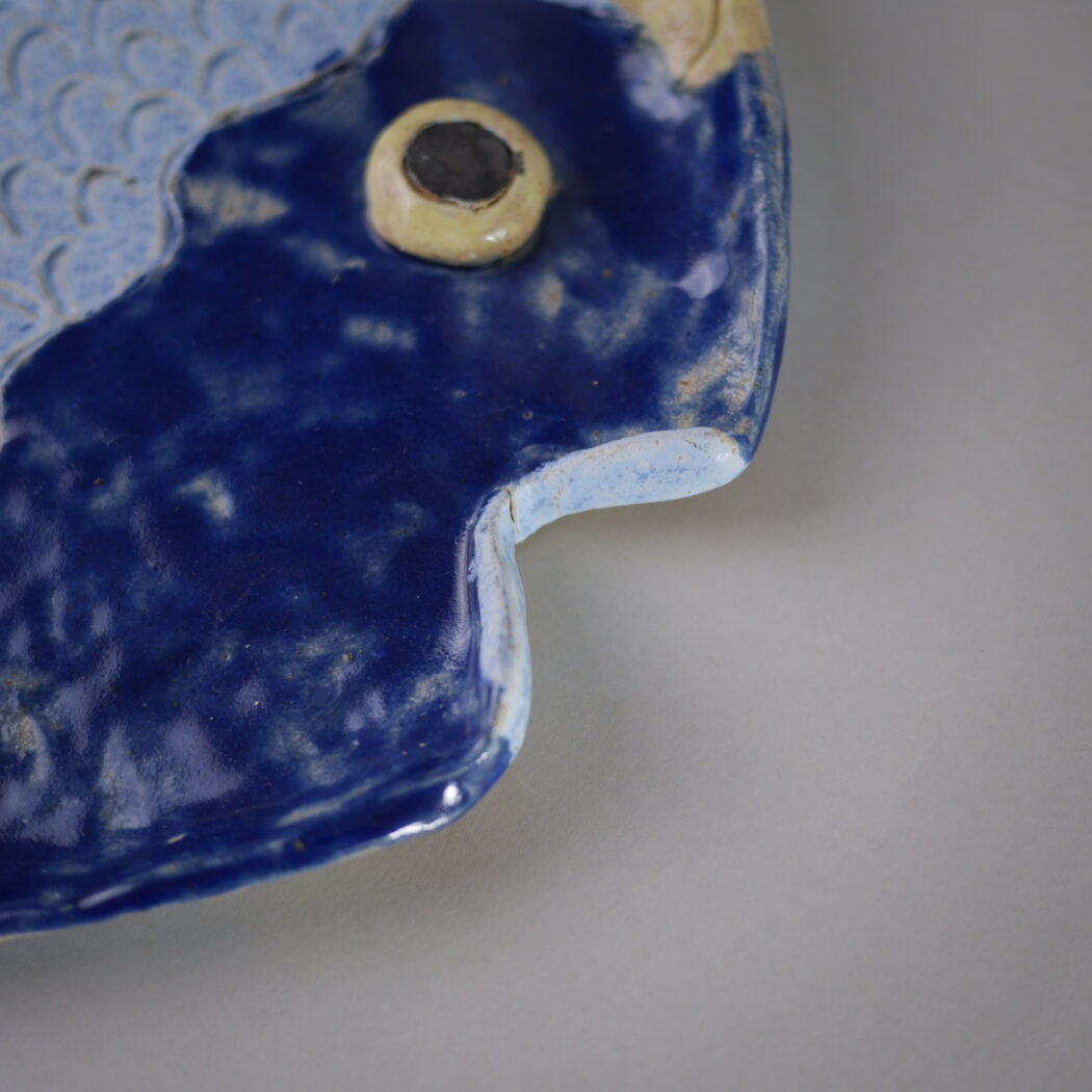 Et skørt, skævt, sjovt og farverigt fiske relief i blå farver. Det er tydeligt, at det er et håndlavet fund, og det vil give indretningen humor og personlighed, når det hænges op på væggen. Fundet i Sverige.