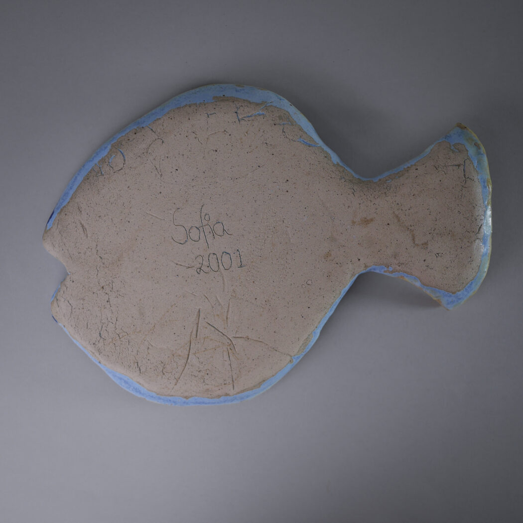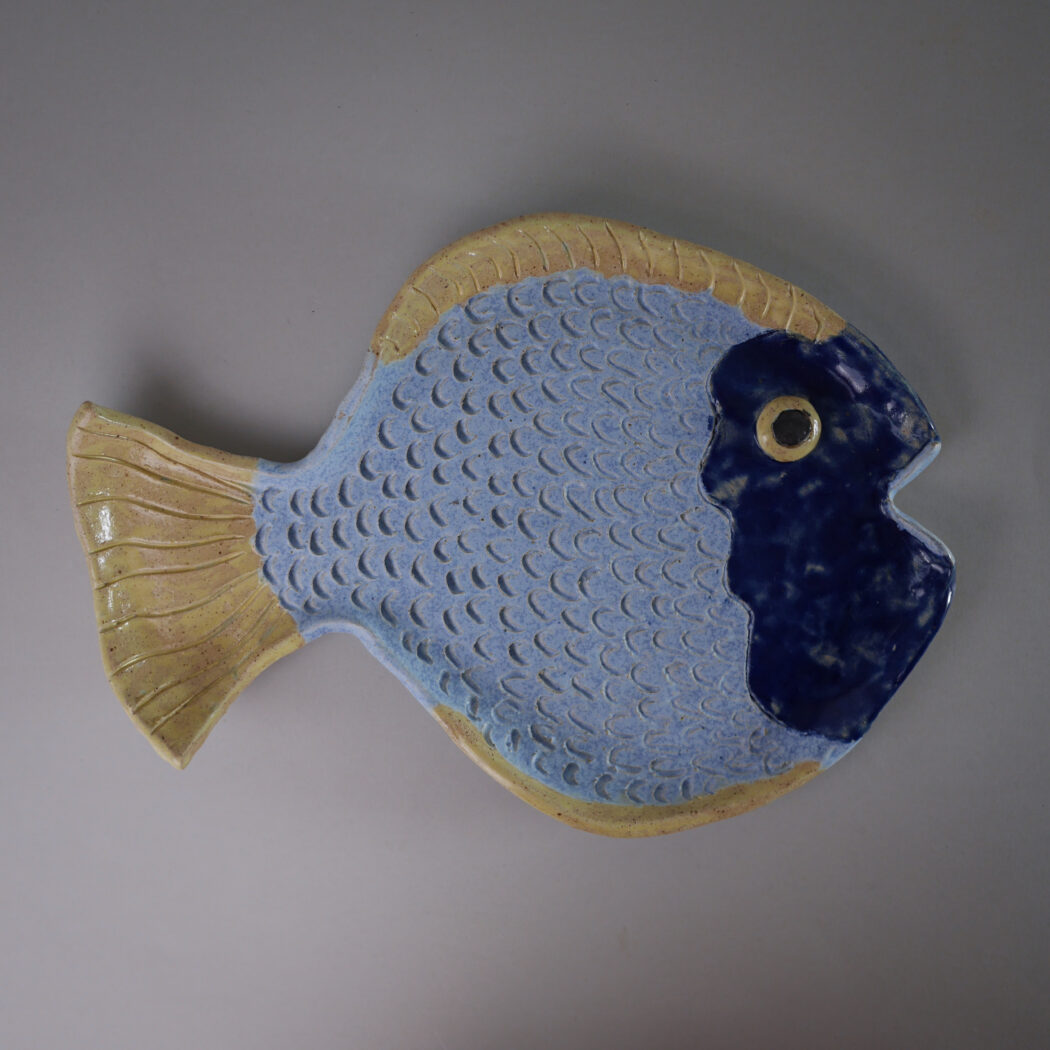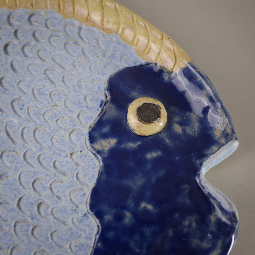 Et skørt, skævt, sjovt og farverigt fiske relief i blå farver. Det er tydeligt, at det er et håndlavet fund, og det vil give indretningen humor og personlighed, når det hænges op på væggen. Fundet i Sverige.