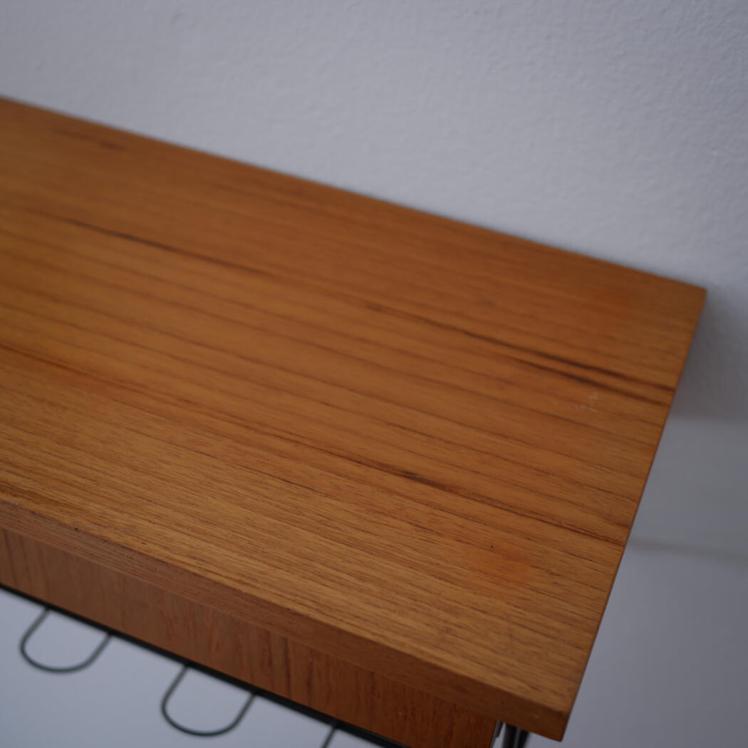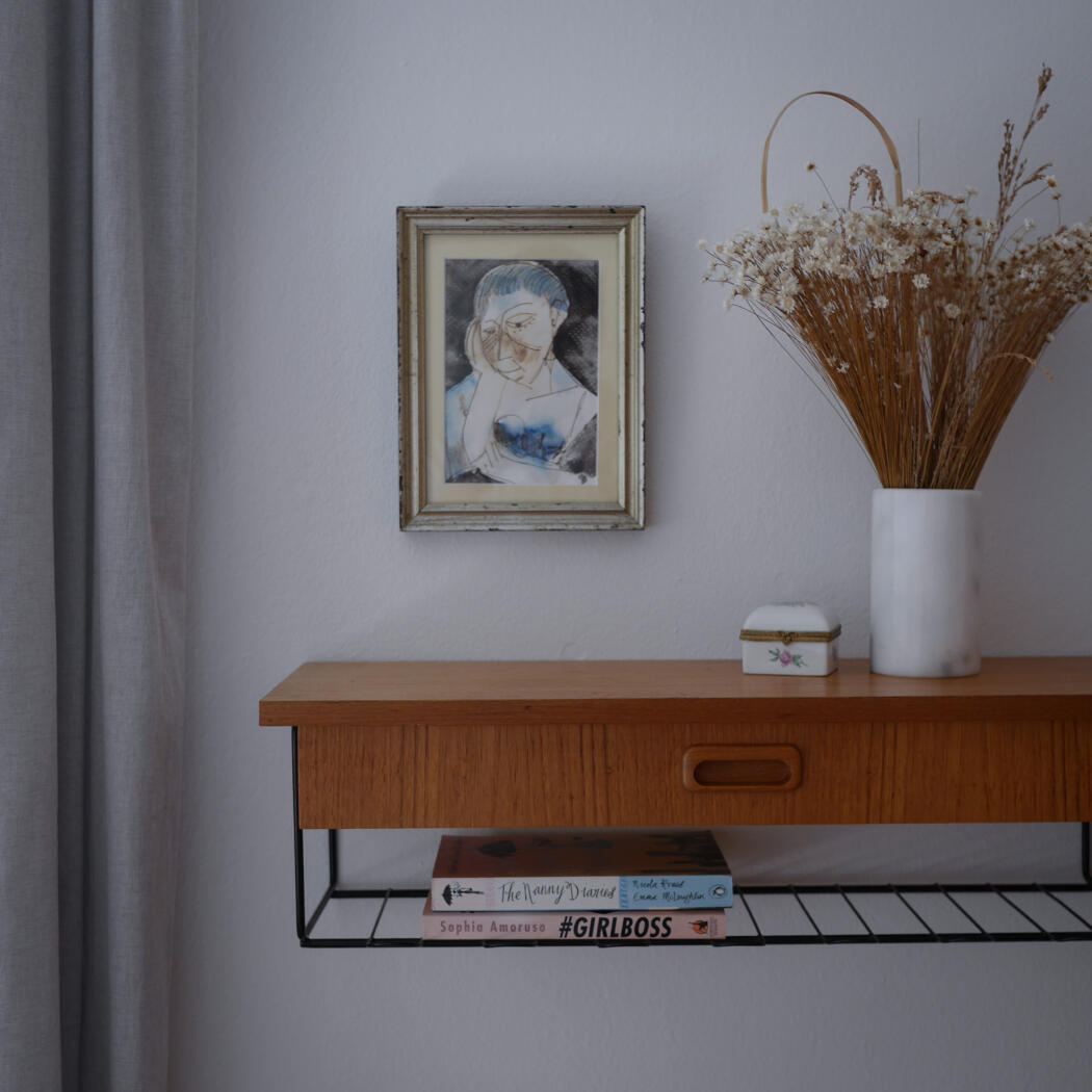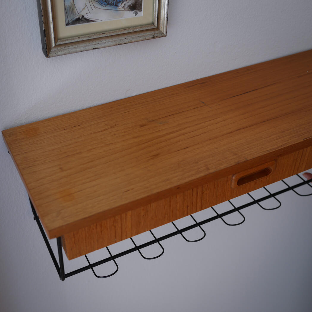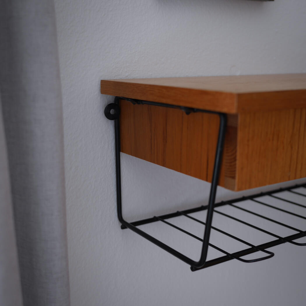 Et flot og elegant skuffemøbel til væggen. En enkelt skuffe samt ekstra opbevaring på den sort metal hylde nedenunder. Let patina og slid på metalhylden. Et flot fund fra Sverige.