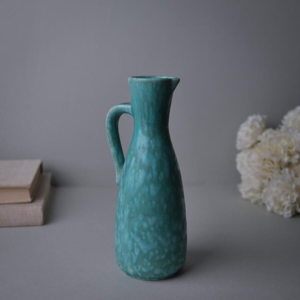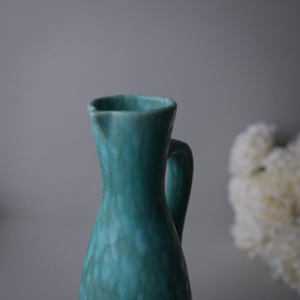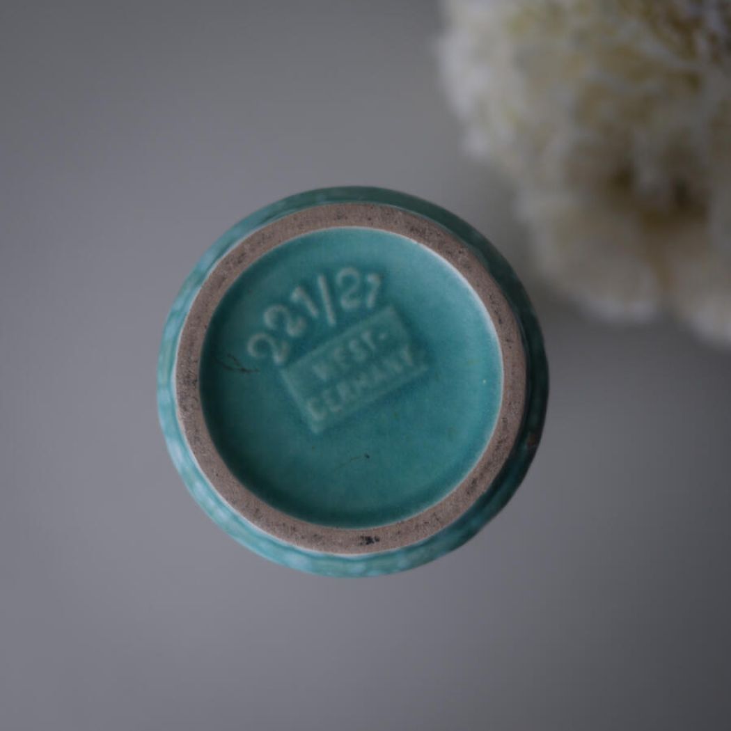 En dekorativ og farverig smal turkis kande vase, som vil være fin stylet, som en del af et stilleben. Vasen i keramik er fra West Germany og fundet i Sverige.
