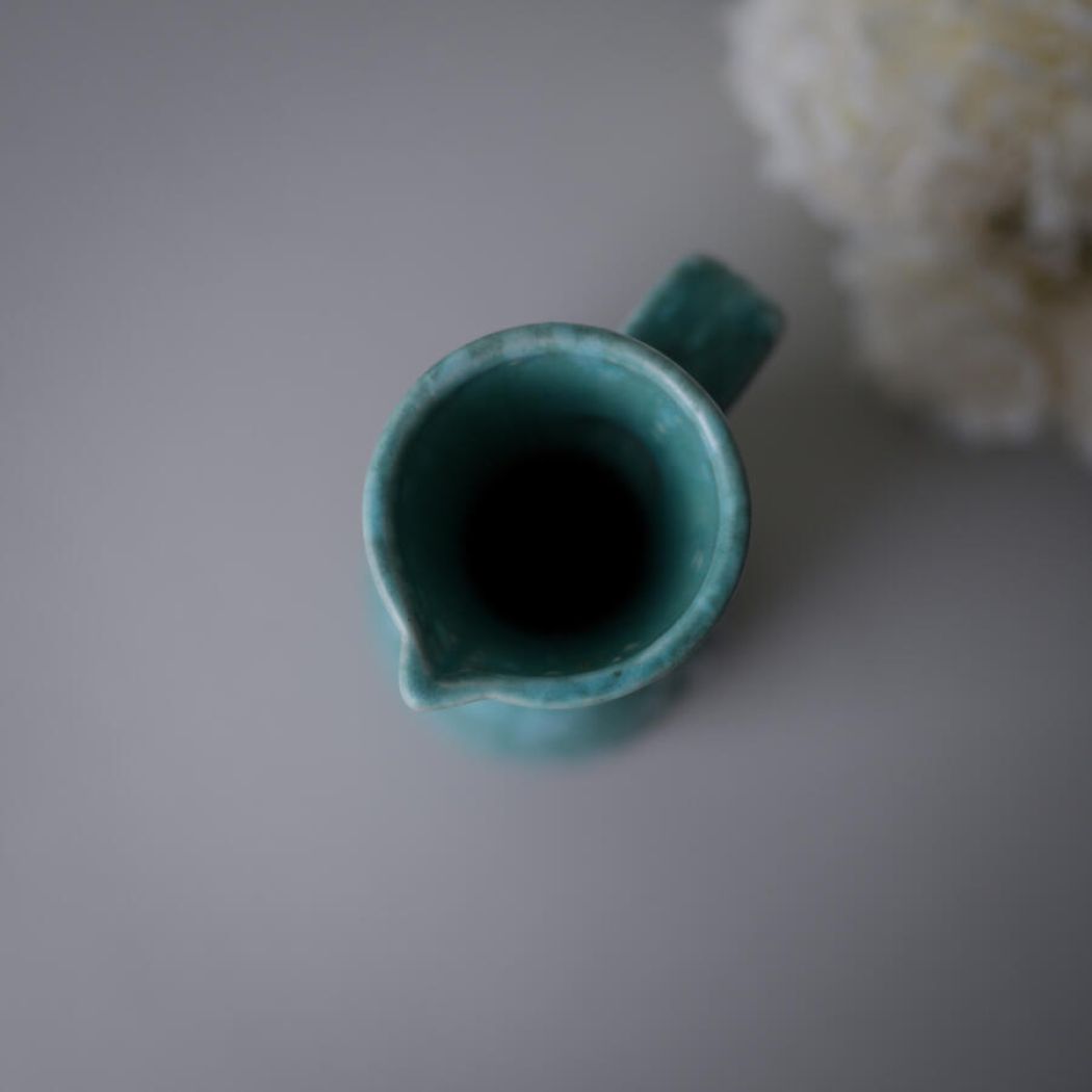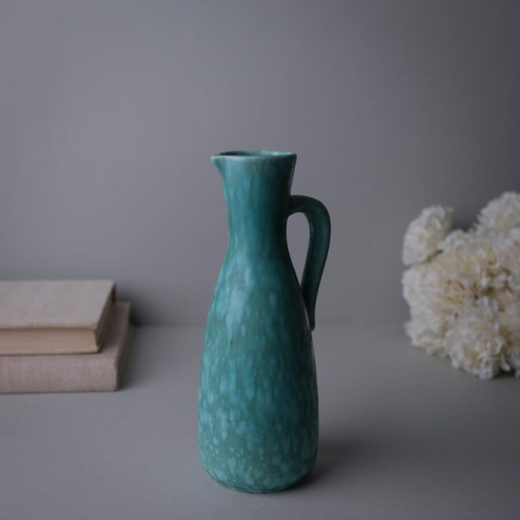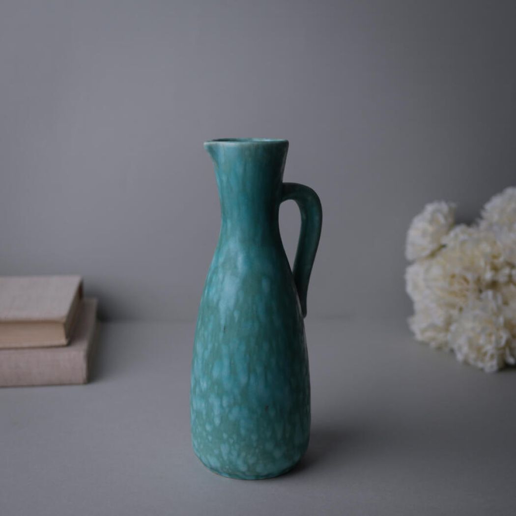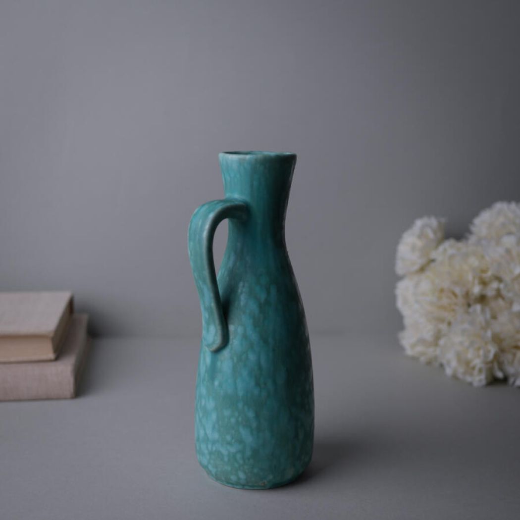 En dekorativ og farverig smal turkis kande vase, som vil være fin stylet, som en del af et stilleben. Vasen i keramik er fra West Germany og fundet i Sverige.