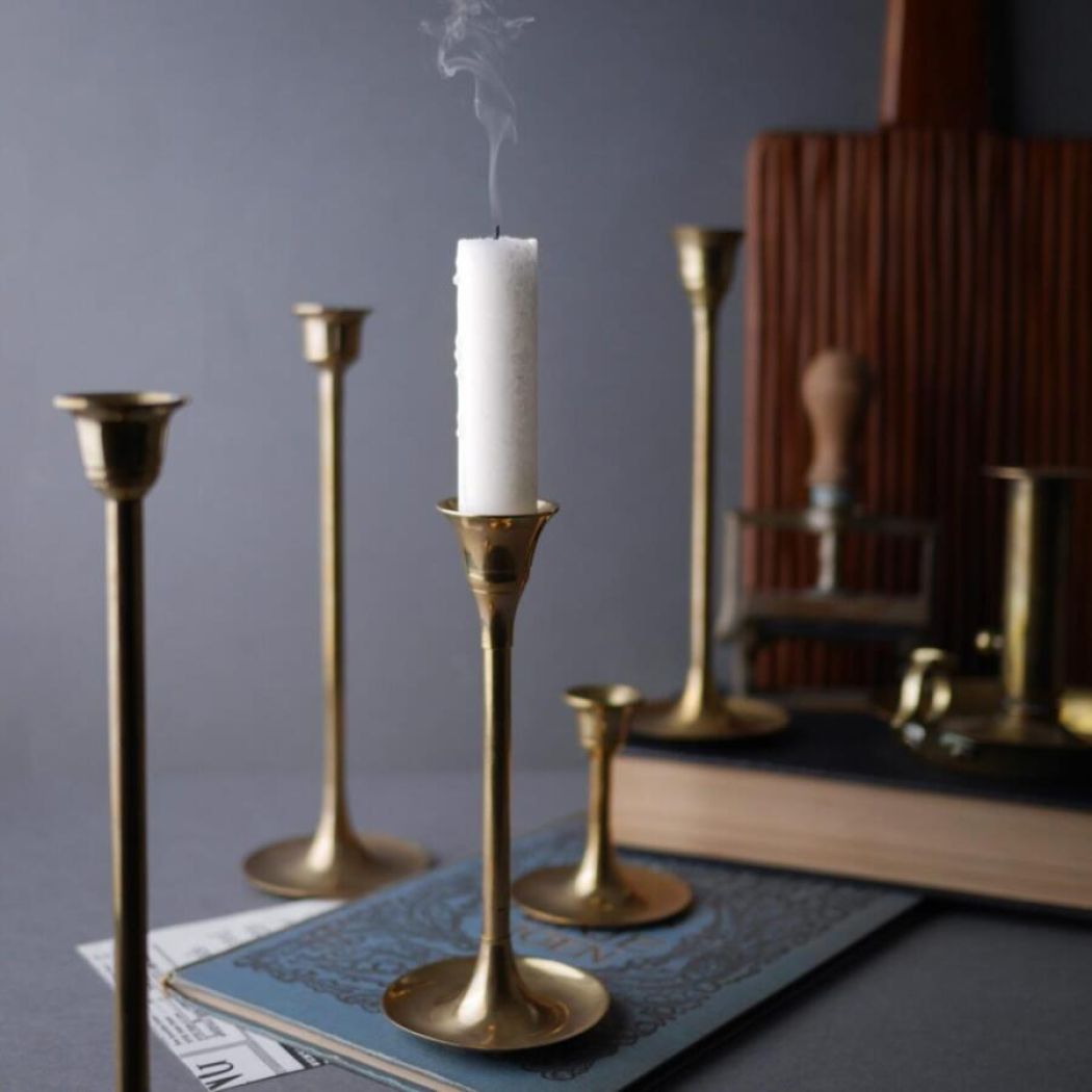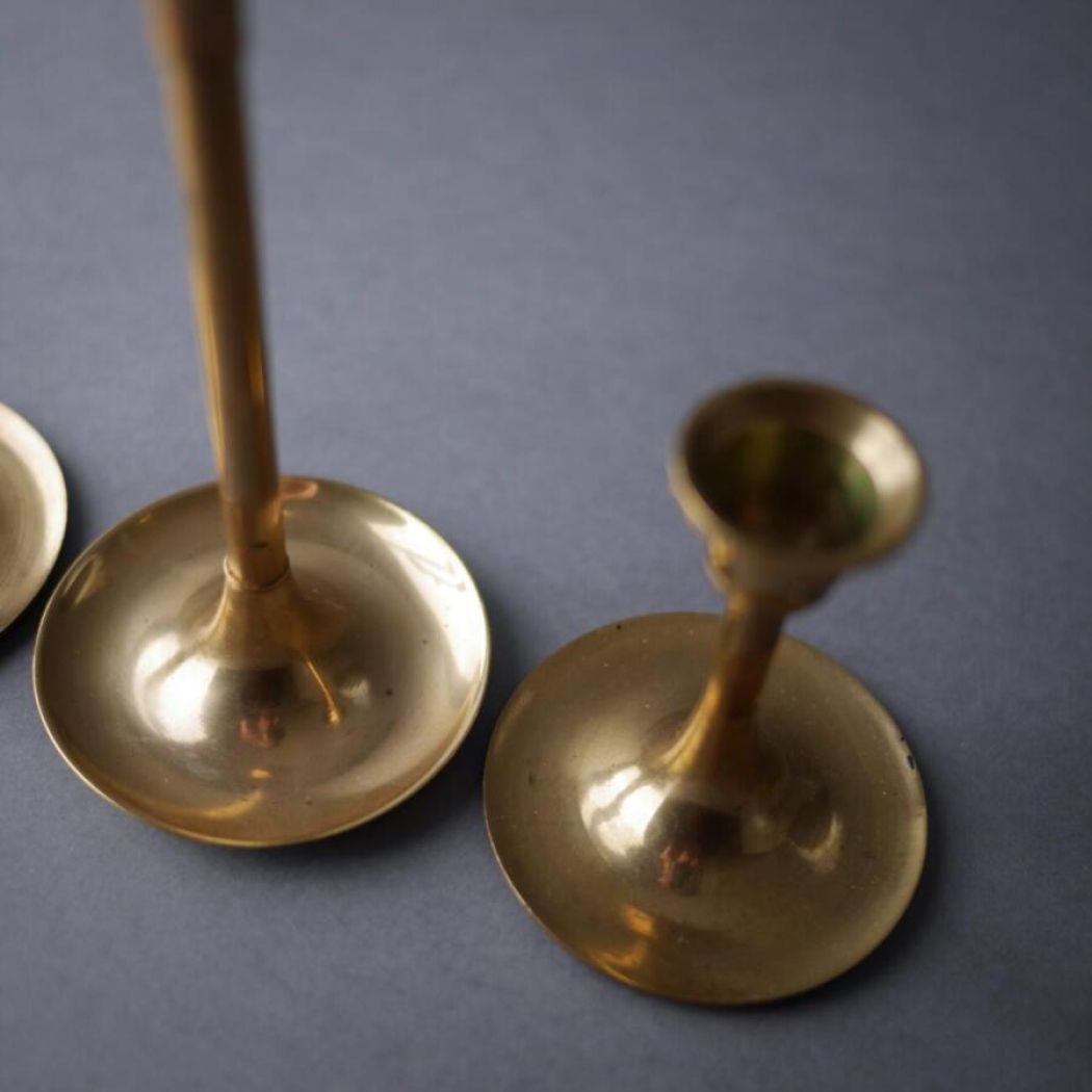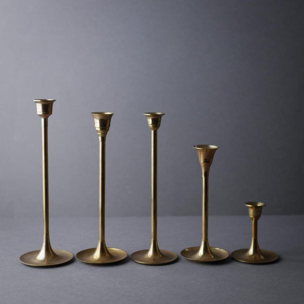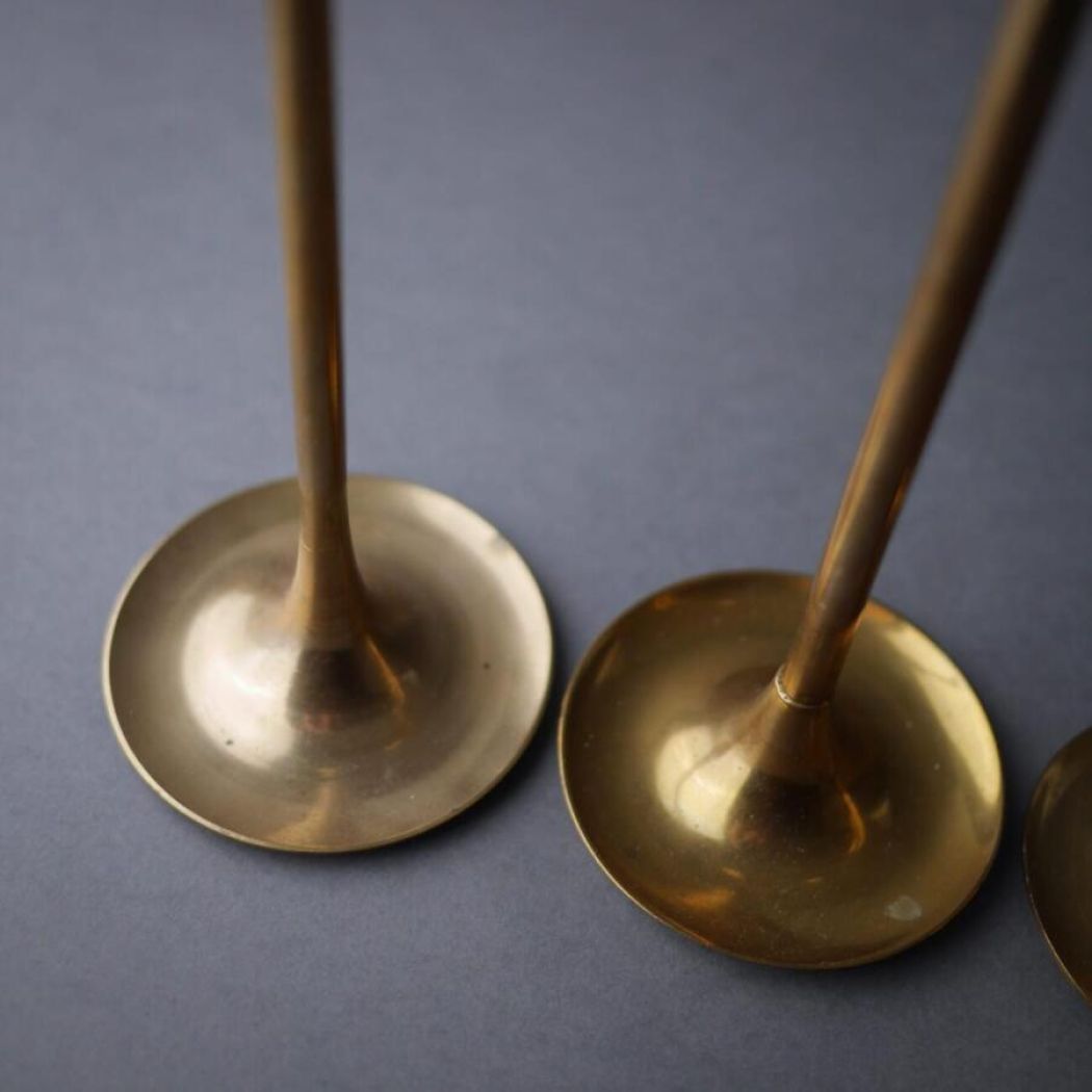 En fin samling messing lysestager fundet i Sverige. De er utrolig skønne sammen, fordi de har forskellige højder, hvilket skaber en flot helhed. Sæt dem alle sammen for et overdådigt look eller del dem op, så det er mere enkelt. Tre af stagerne passer til kronelys (Ø: 2,5 cm.), og to af dem til lidt smallere lys (Ø: 2 cm.). 5 stk. haves, sælges samlet.