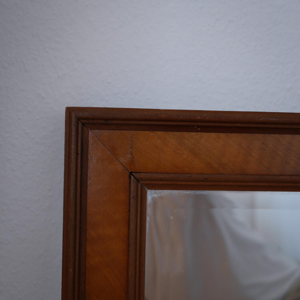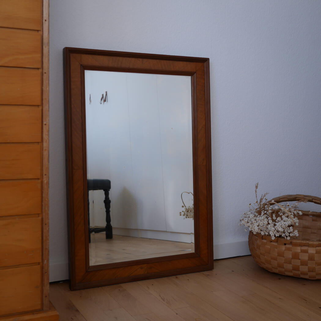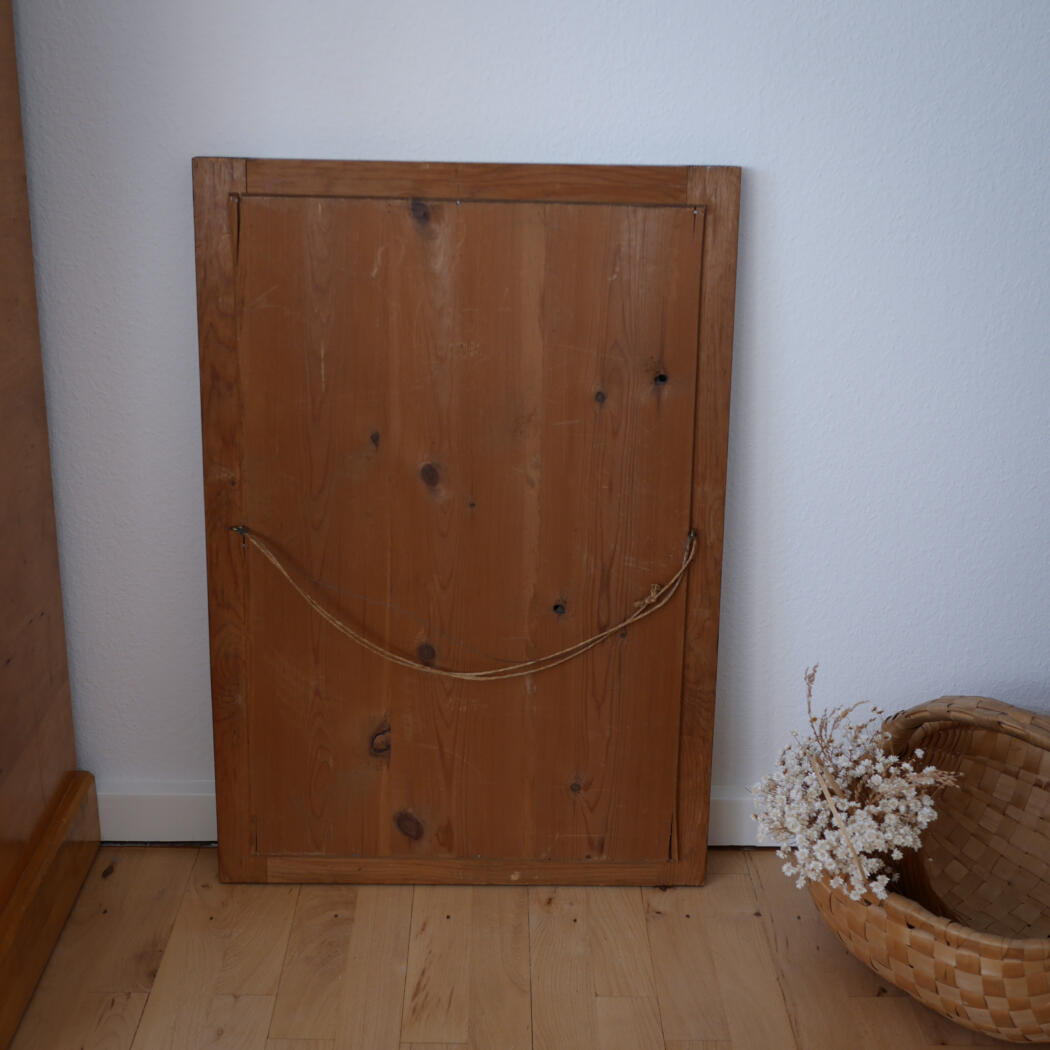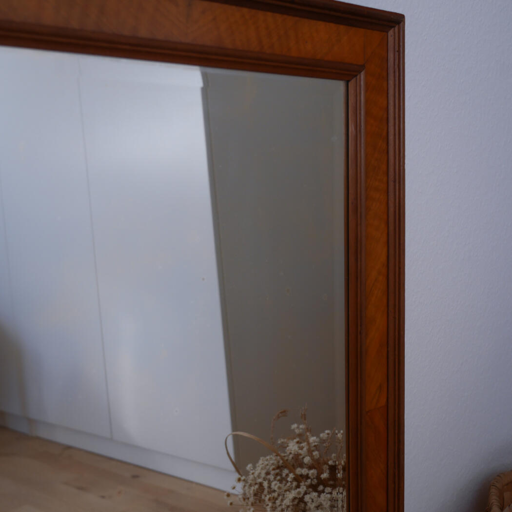 Et smukt ældre vintage spejl med en bred træramme, som virkelig giver væggen karakter! Spejlet har en bred ydre egetrasramme med udskæringer og en indre finér ramme. Glasset har desværre taget skade af årerne, der er gået, og fremstår med flere pletter og skader i glasset. Jeg synes dog, at med netop dette spejl, så understøtter det netop spejlets alder og charme. Prisen er sat derefter. Et ældre vintage spejl fra Sverige.