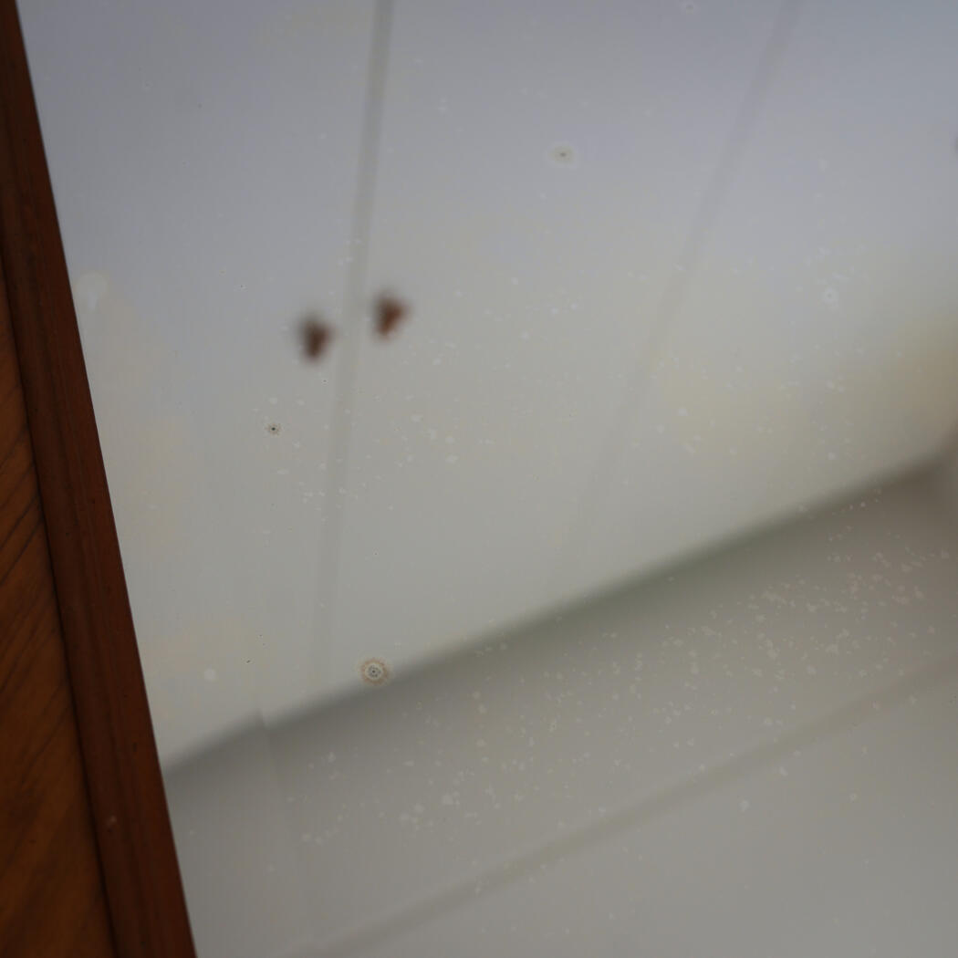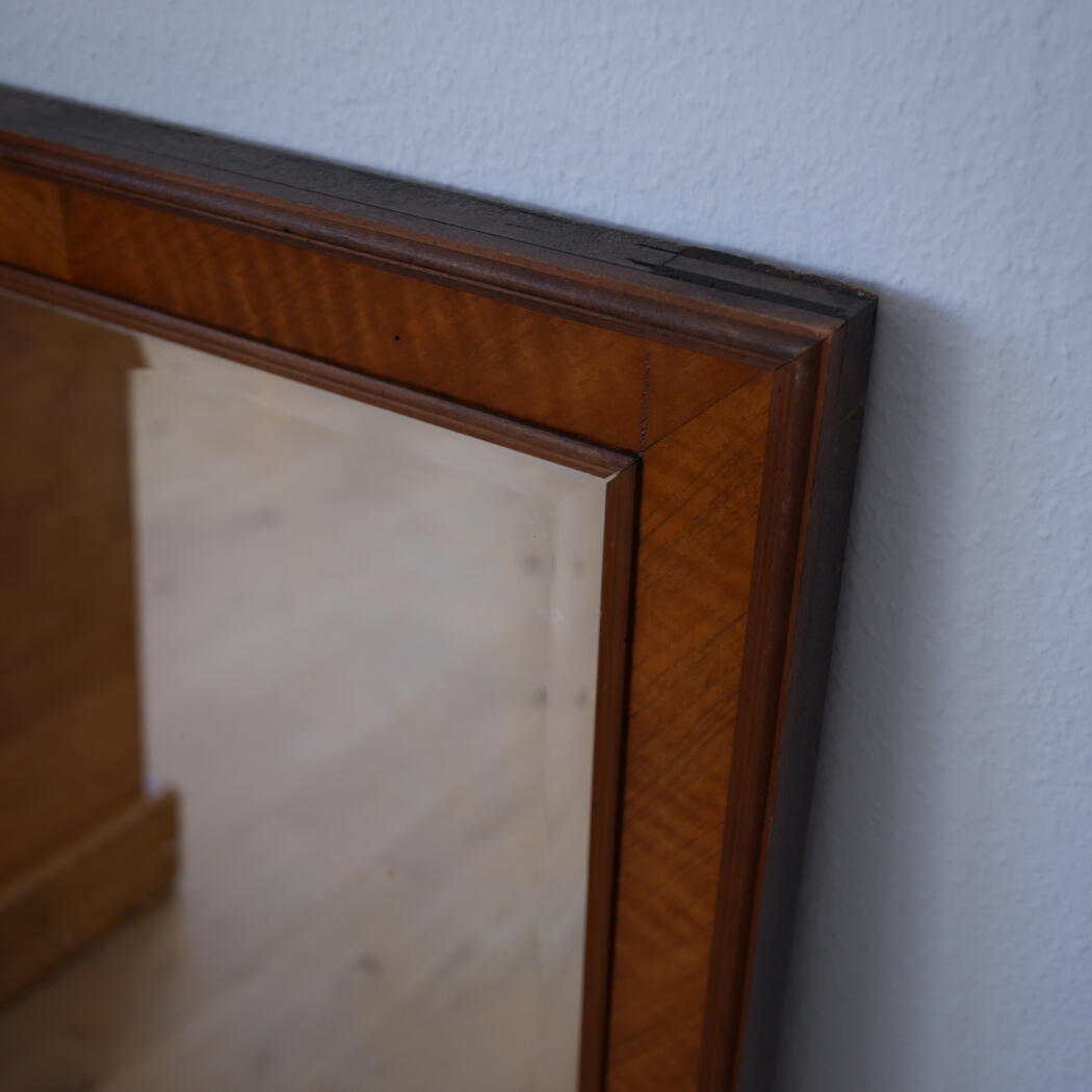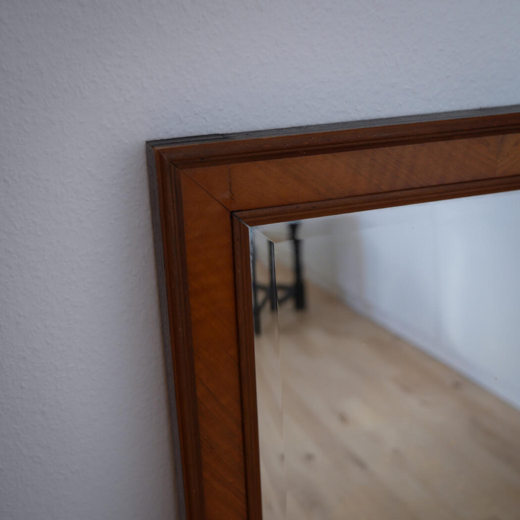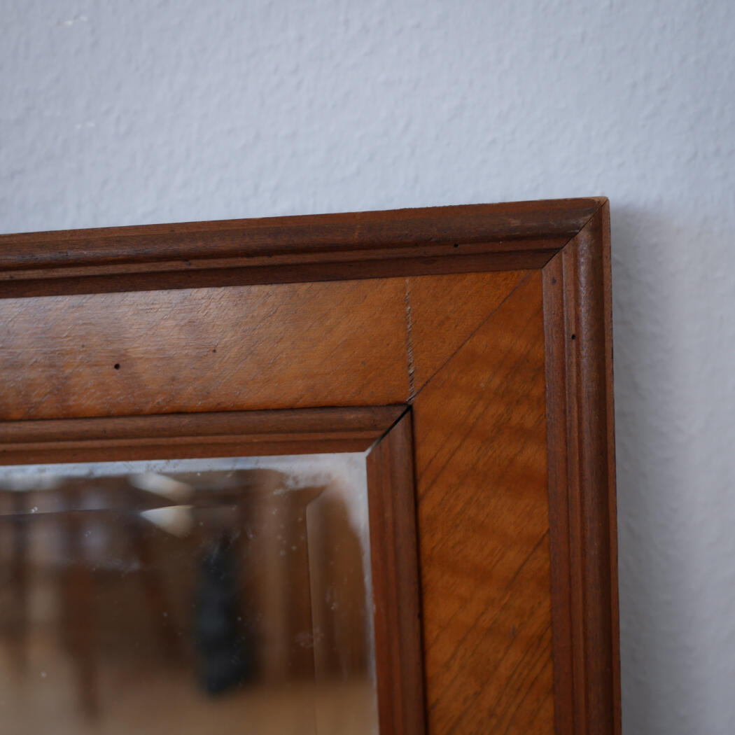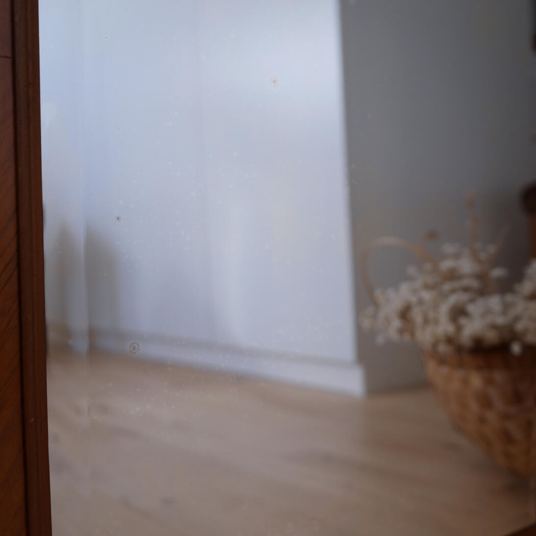 Et smukt ældre vintage spejl med en bred træramme, som virkelig giver væggen karakter! Spejlet har en bred ydre egetrasramme med udskæringer og en indre finér ramme. Glasset har desværre taget skade af årerne, der er gået, og fremstår med flere pletter og skader i glasset. Jeg synes dog, at med netop dette spejl, så understøtter det netop spejlets alder og charme. Prisen er sat derefter. Et ældre vintage spejl fra Sverige.