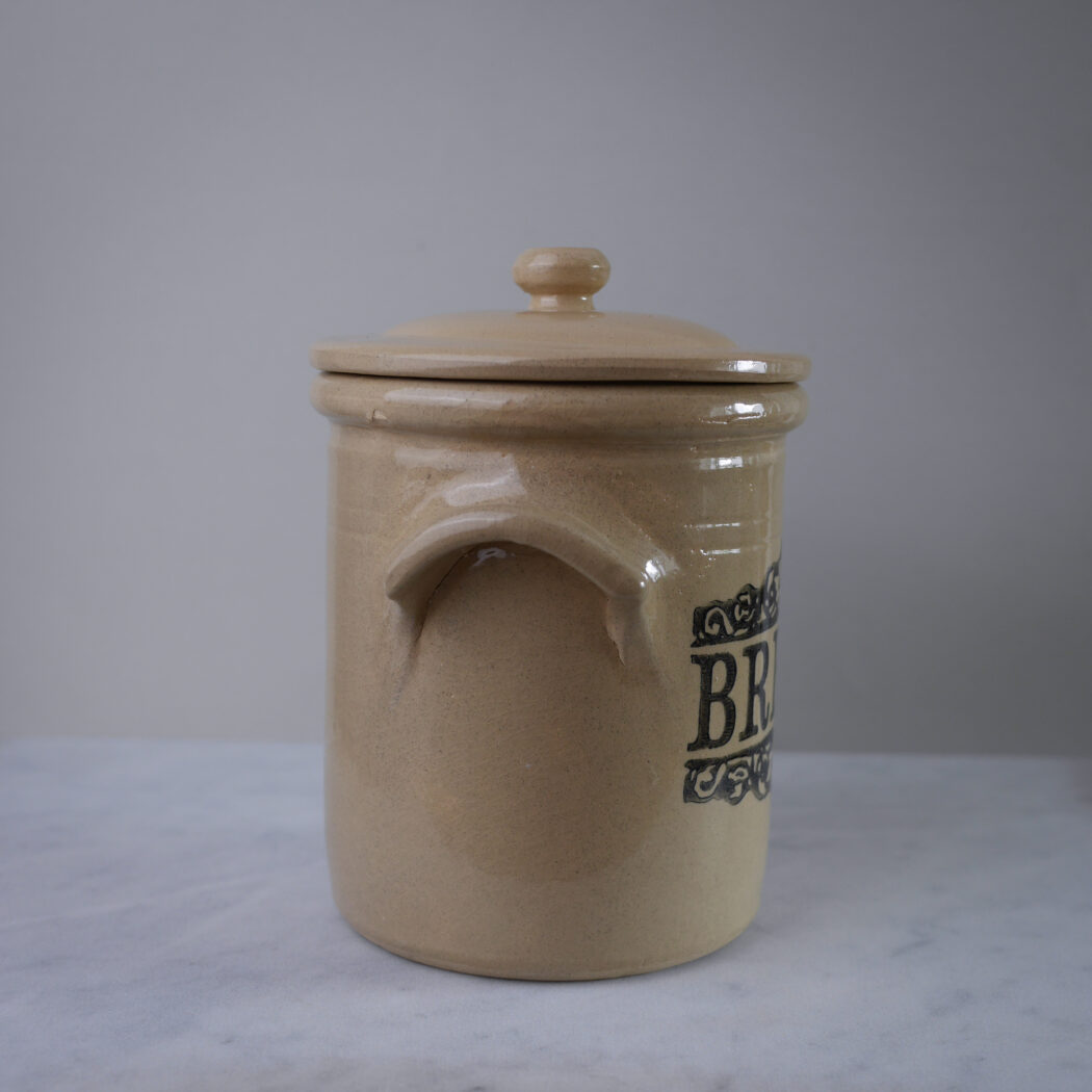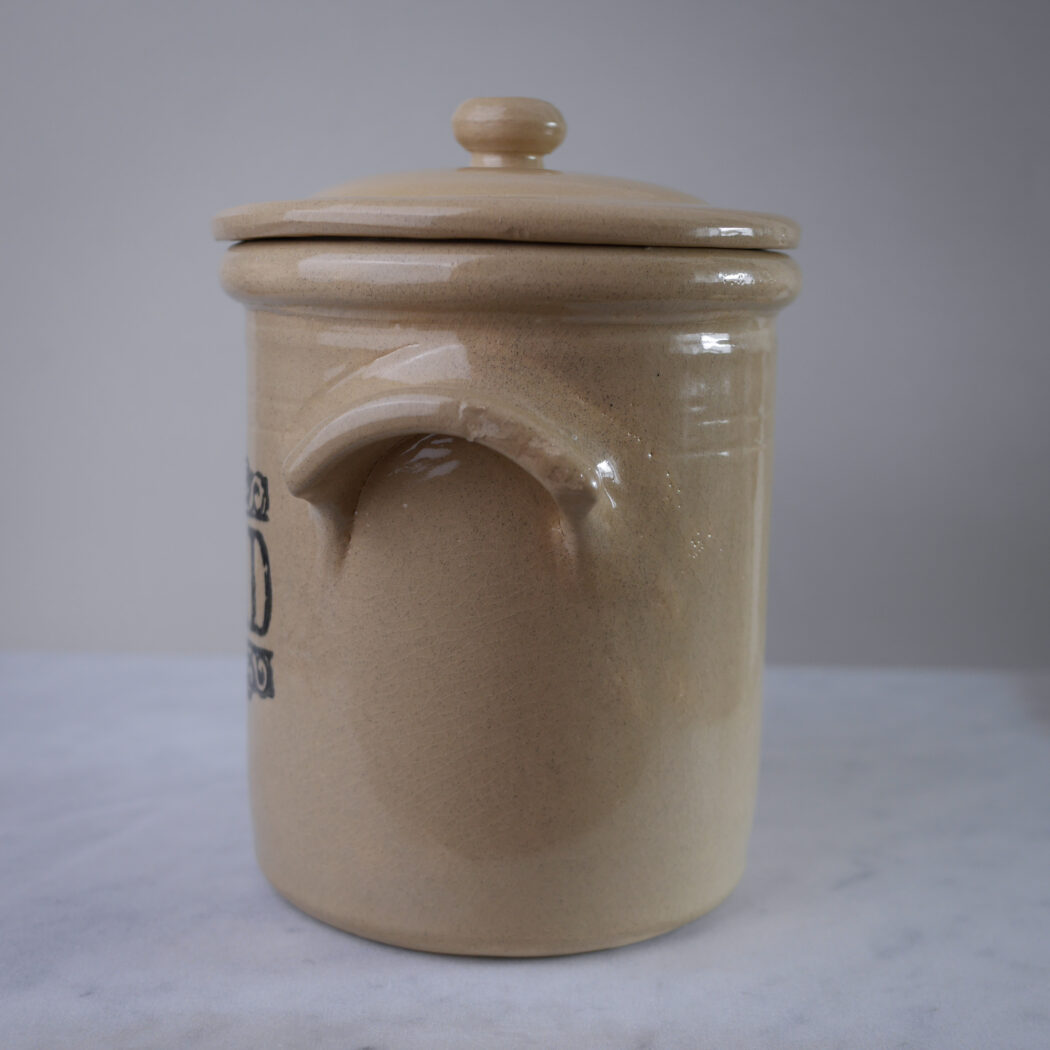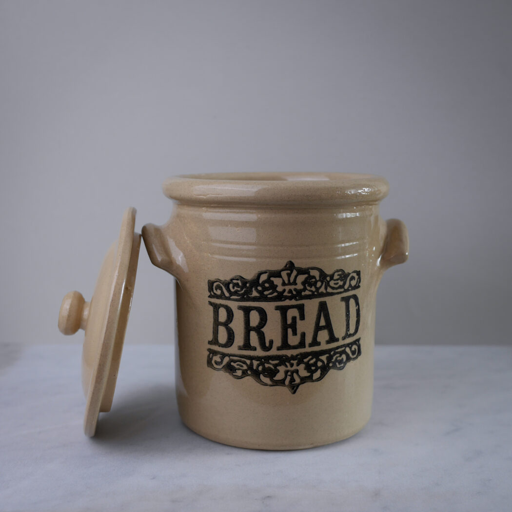 En flot stor beige brød krukke med låg og sort tekst foran. Krukken er i keramik, og den vil være cool på køkkenbordet til opbevaring sammen med andre keramikskåle og krukker. Et fund fra Sverige.