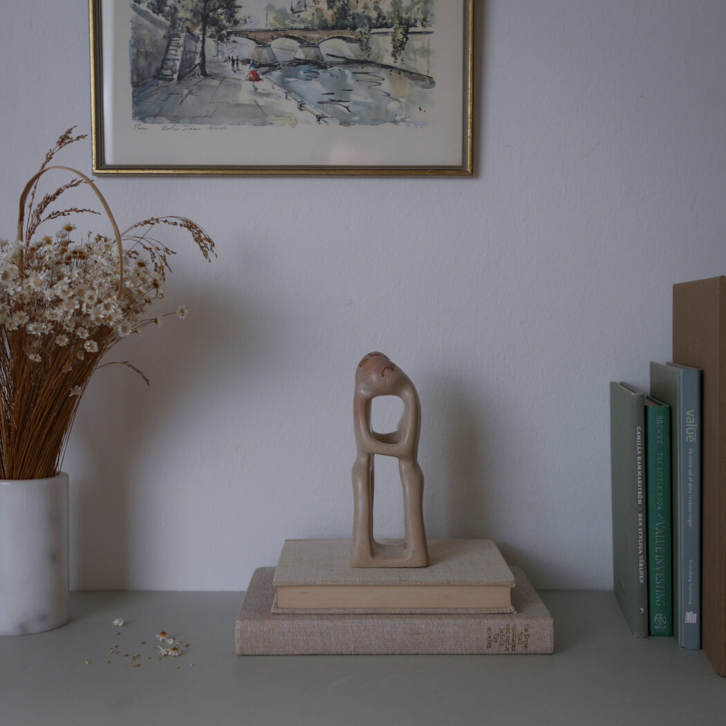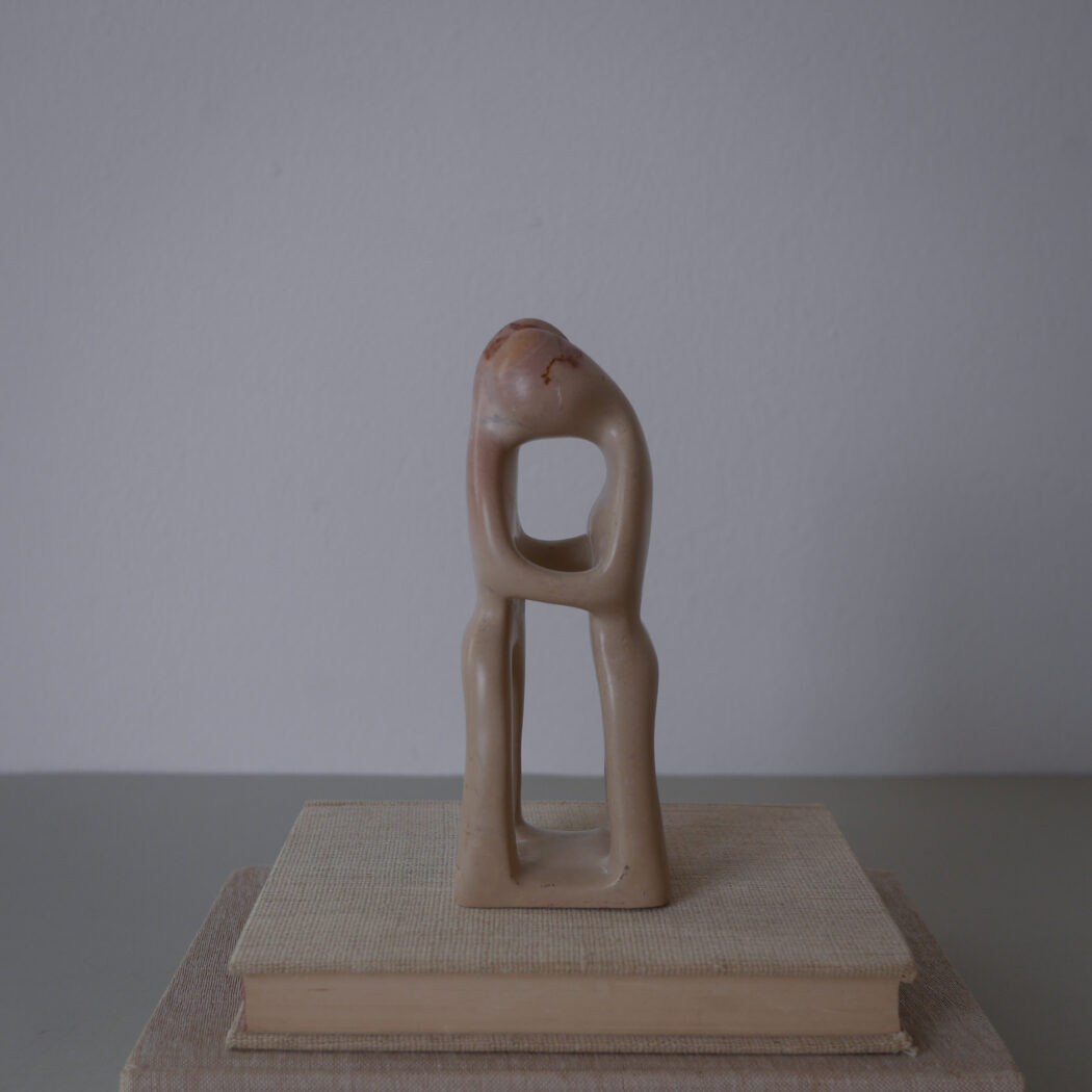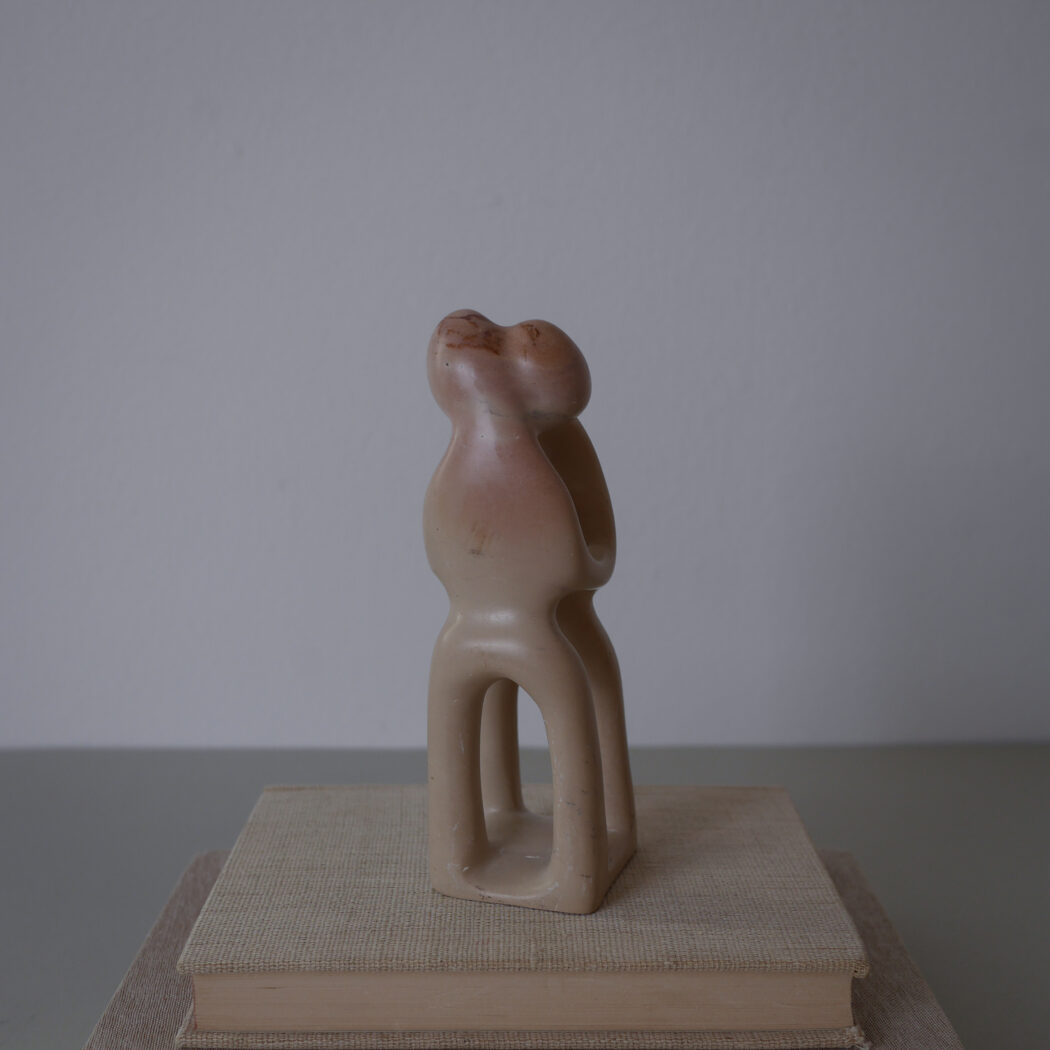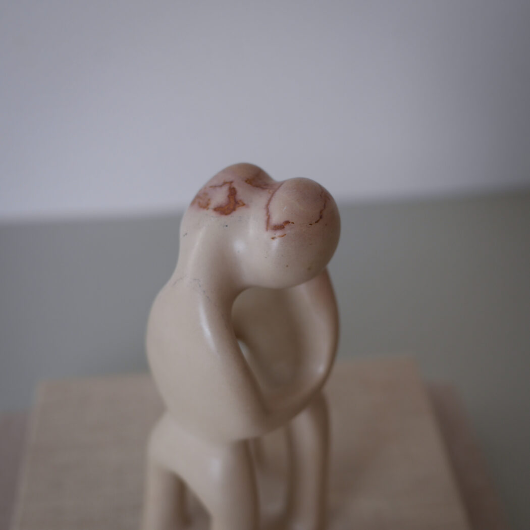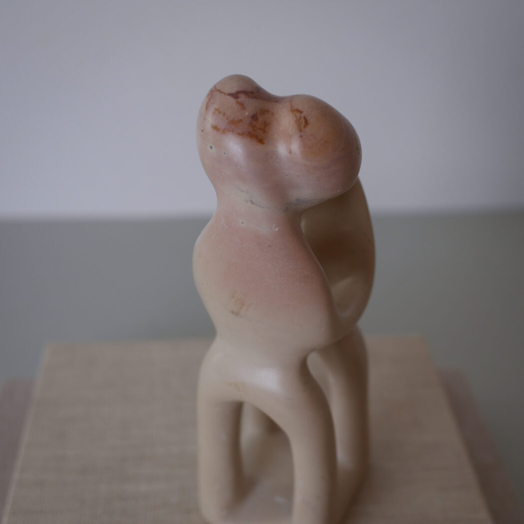 En meget smuk figur i rosa fedtsten, der forestiller et par forenet i kærlighed. Figurens bløde former og varme farvetoner udstråler nærhed og ro, og gør den til en stemningsfuld dekoration i hjemmet f.eks. i et stilleben. Et fint symbol på kærlighed og samhørighed. Fundet på Sjælland.