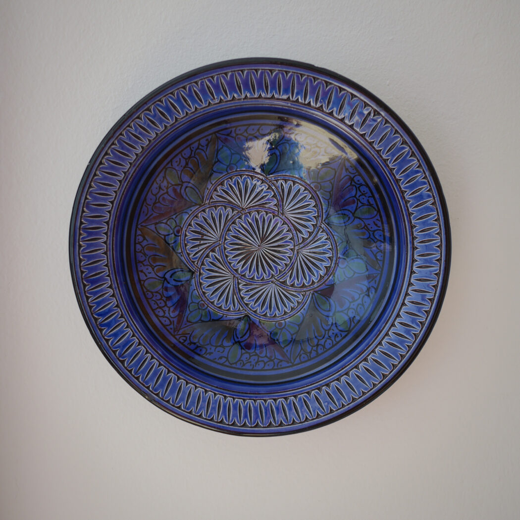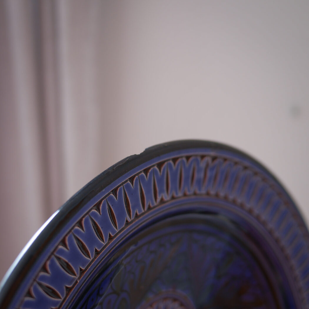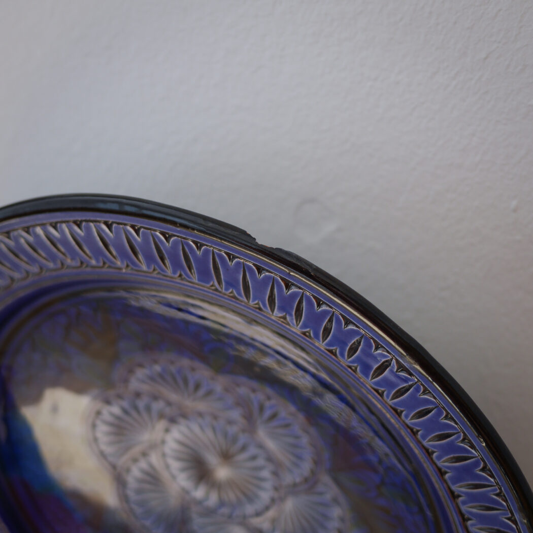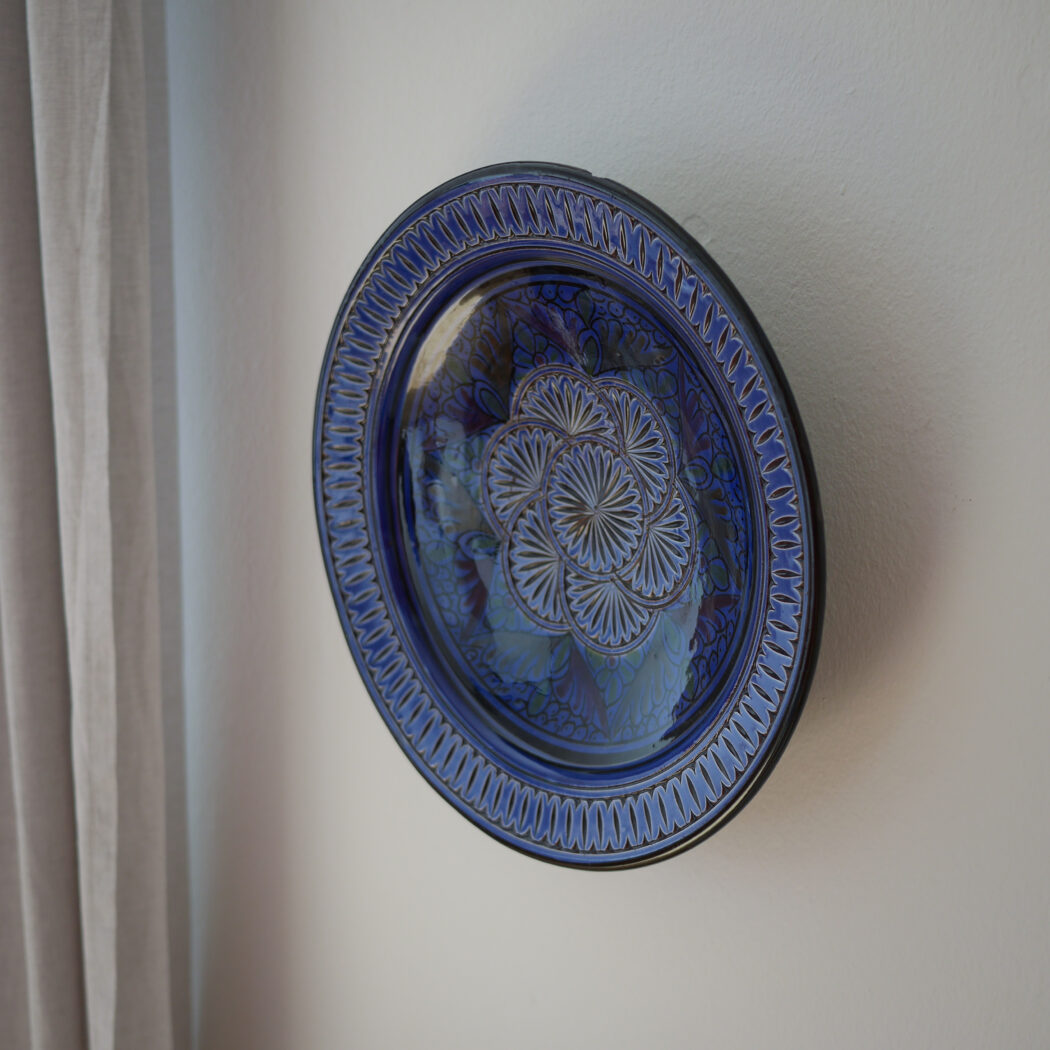 En flot stor vægdekoration i keramik med flotte mønstre i en mørkeblå farve med masser af spil. Kæmpe blikfang til væggen. Der er dog et større nag bagpå, det ses heldigvis meget lidt forfra, se detaljefotos. Et flot fund fra Sverige.