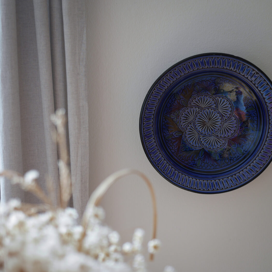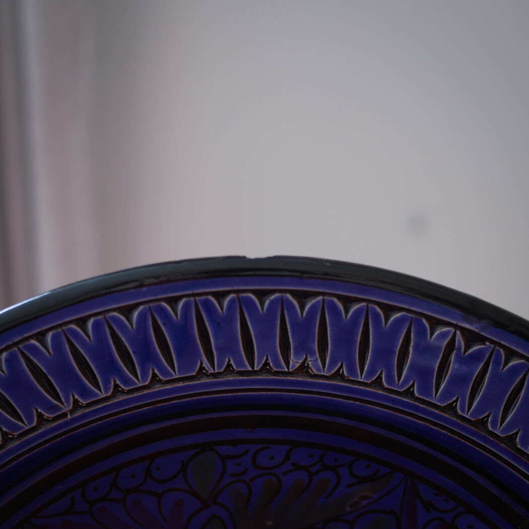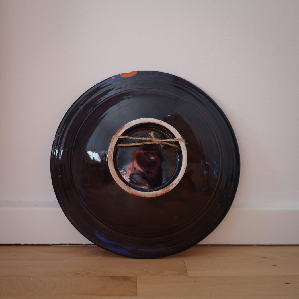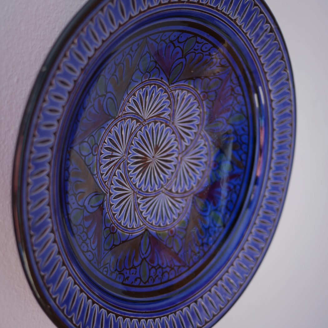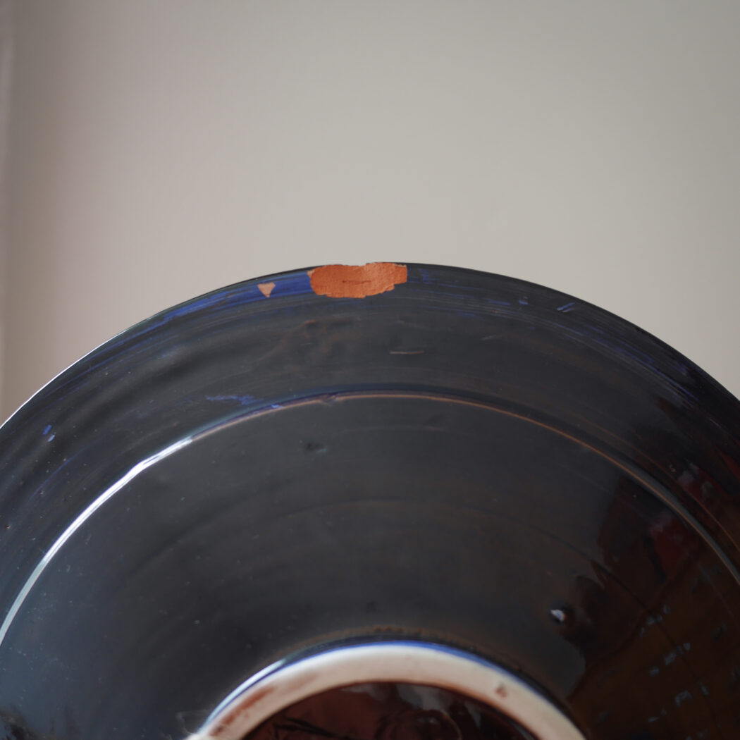 En flot stor vægdekoration i keramik med flotte mønstre i en mørkeblå farve med masser af spil. Kæmpe blikfang til væggen. Der er dog et større nag bagpå, det ses heldigvis meget lidt forfra, se detaljefotos. Et flot fund fra Sverige.