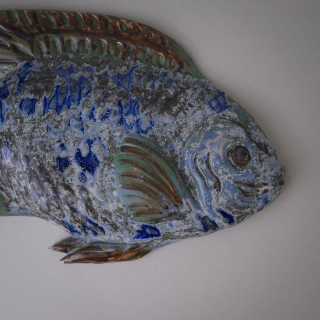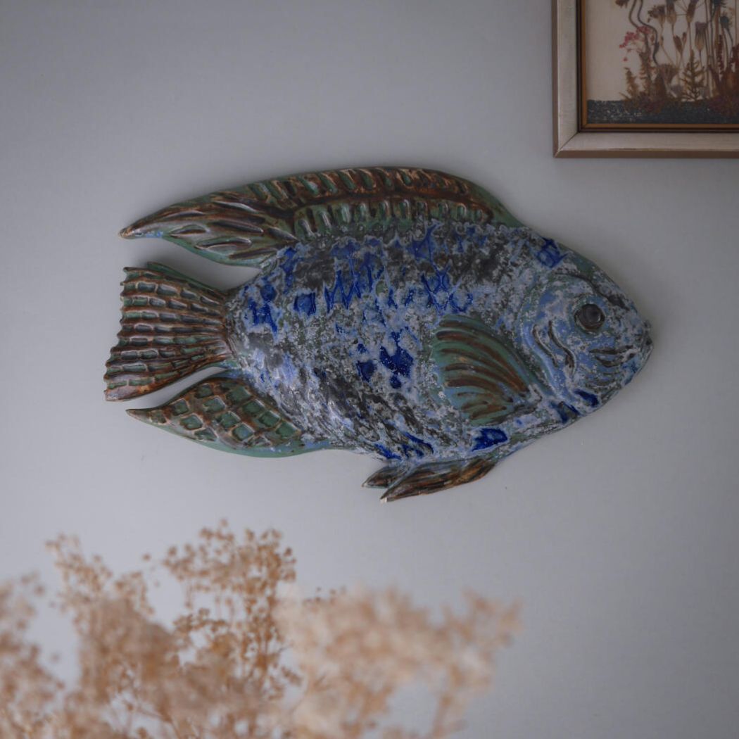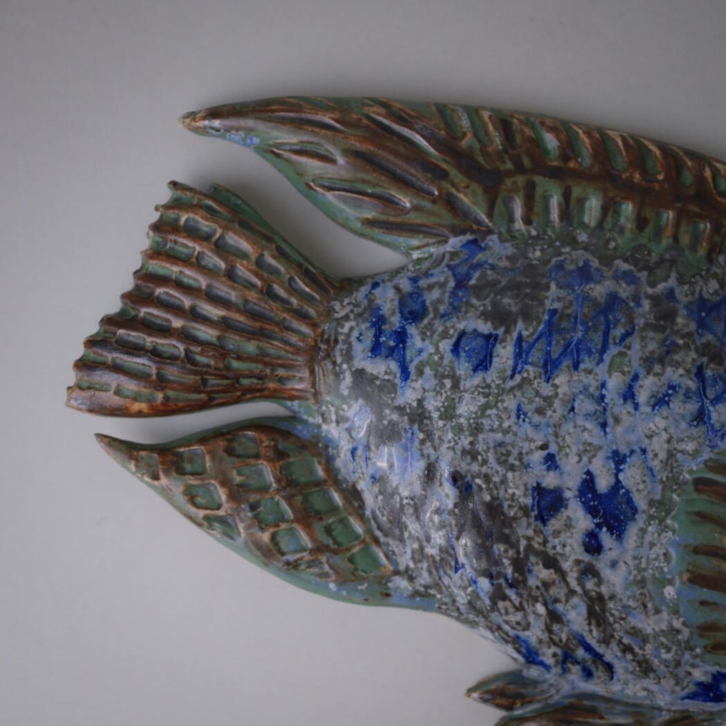 En stor meget flot keramikfisk til væggen – et unika fund! Flotte blå og grønne nunacer i flot forening. Total blikfang! Fisken har en lille skade ved nederste finne, men det ses ikke tydeligt. Et wauw fund fra Sverige.