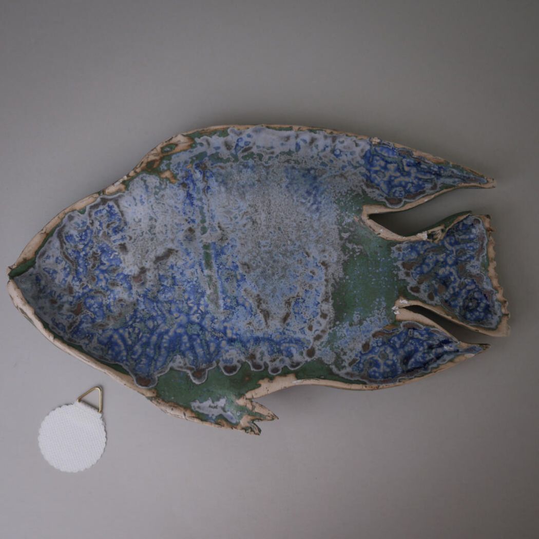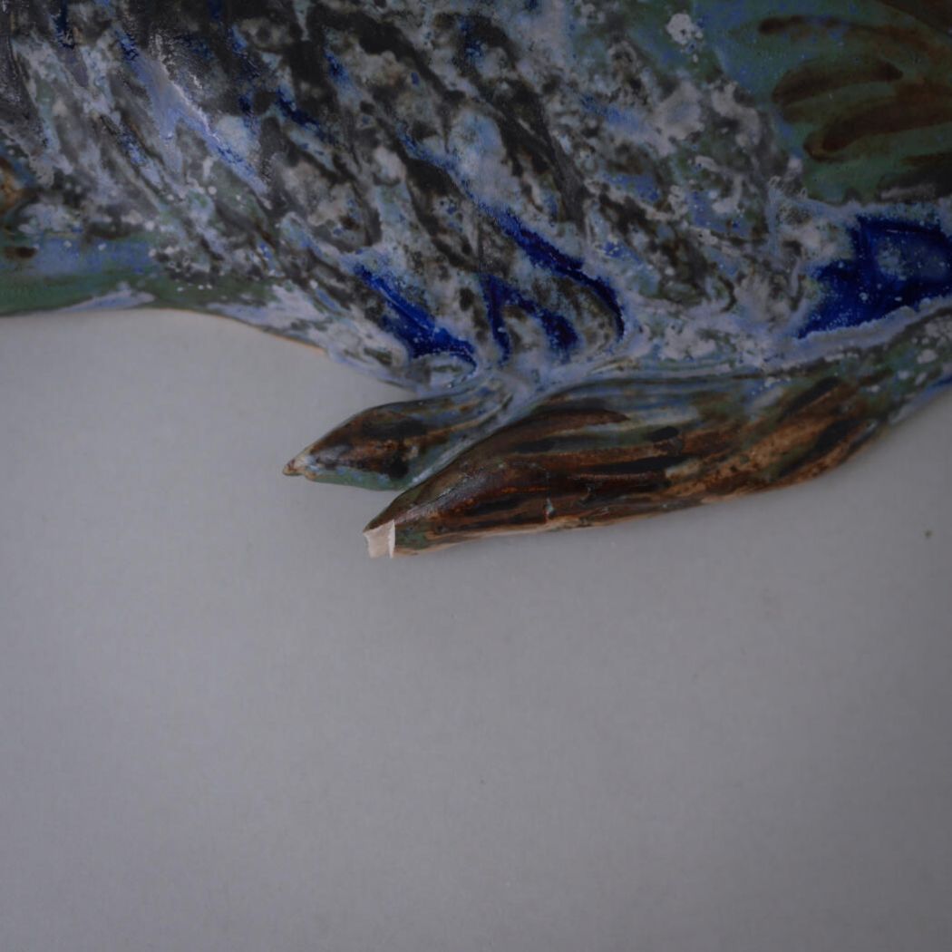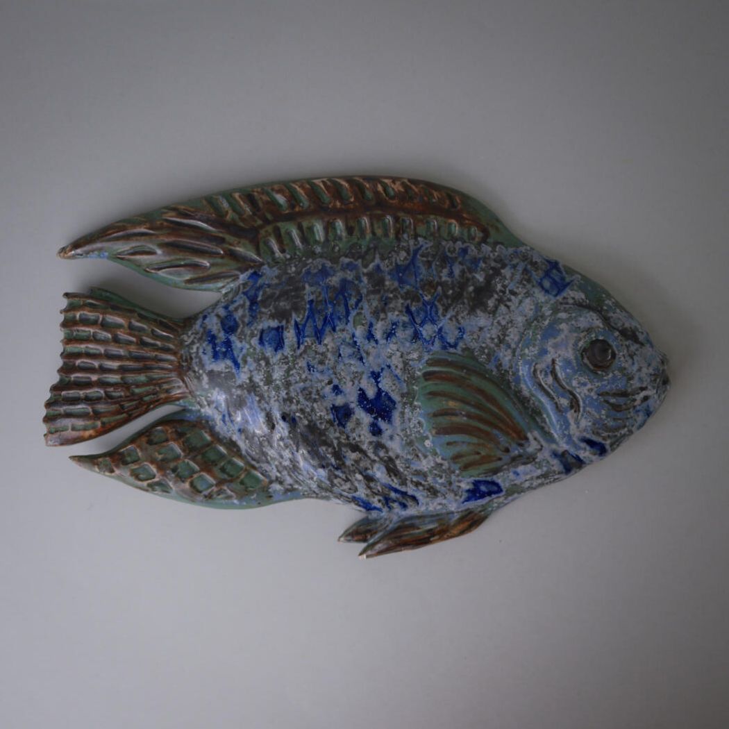 En stor meget flot keramikfisk til væggen – et unika fund! Flotte blå og grønne nunacer i flot forening. Total blikfang! Fisken har en lille skade ved nederste finne, men det ses ikke tydeligt. Et wauw fund fra Sverige.
